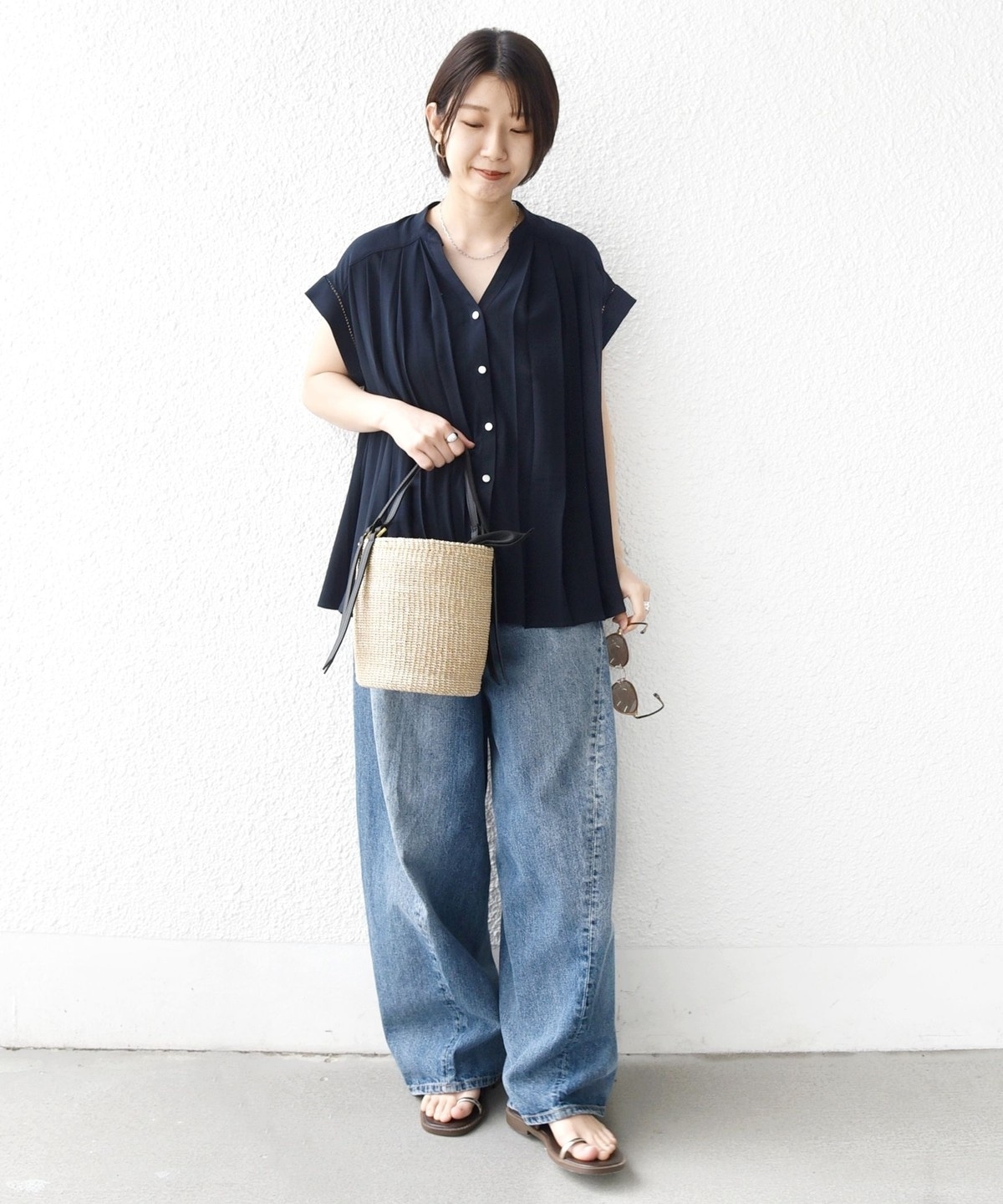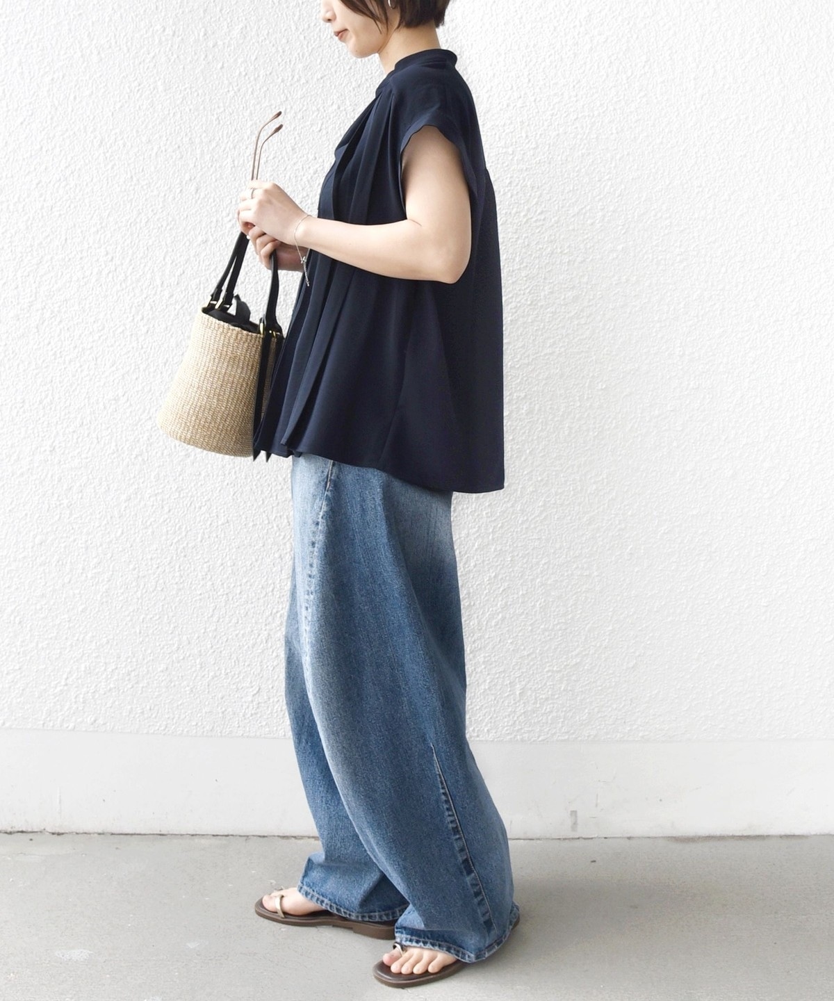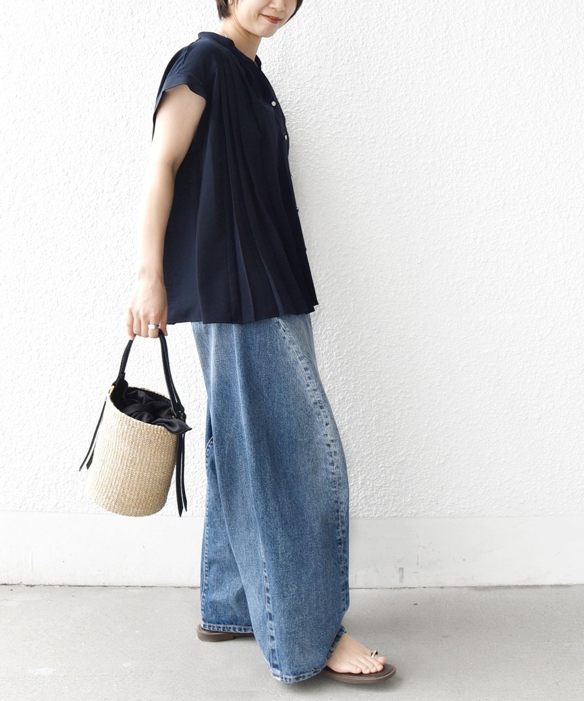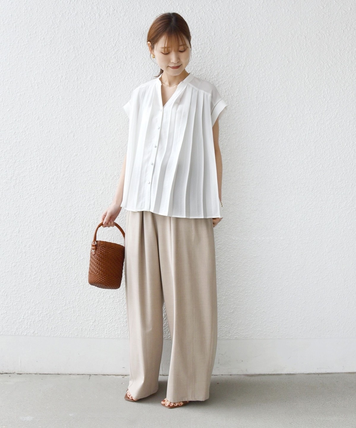 パンツはデニムやカーゴパンツなどのカジュアルボトムからきれいめなワイドパンツ、すっきしたパンツなどを合わせていただける為、オンオフ兼用で着ていただけるブラウスです。