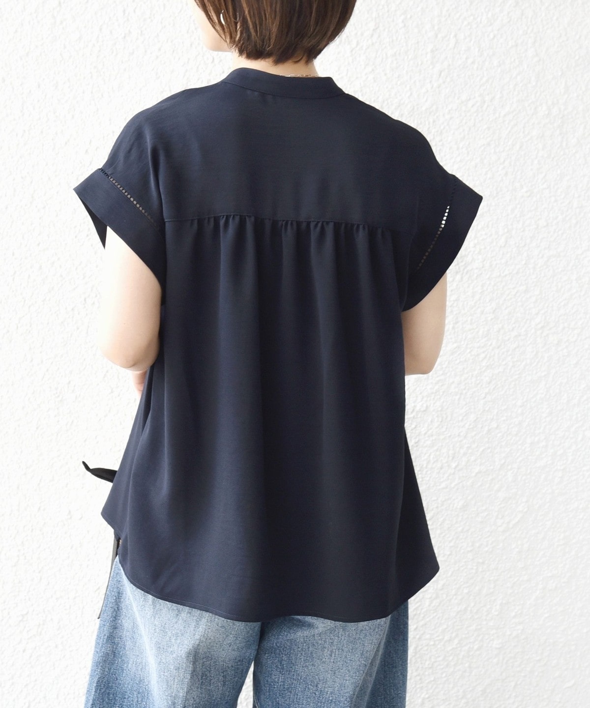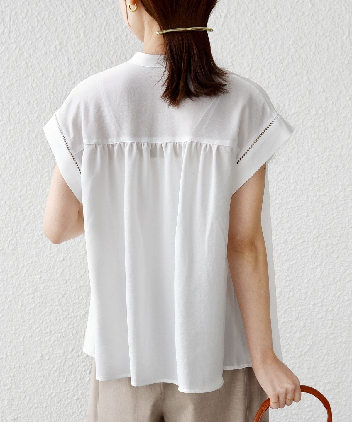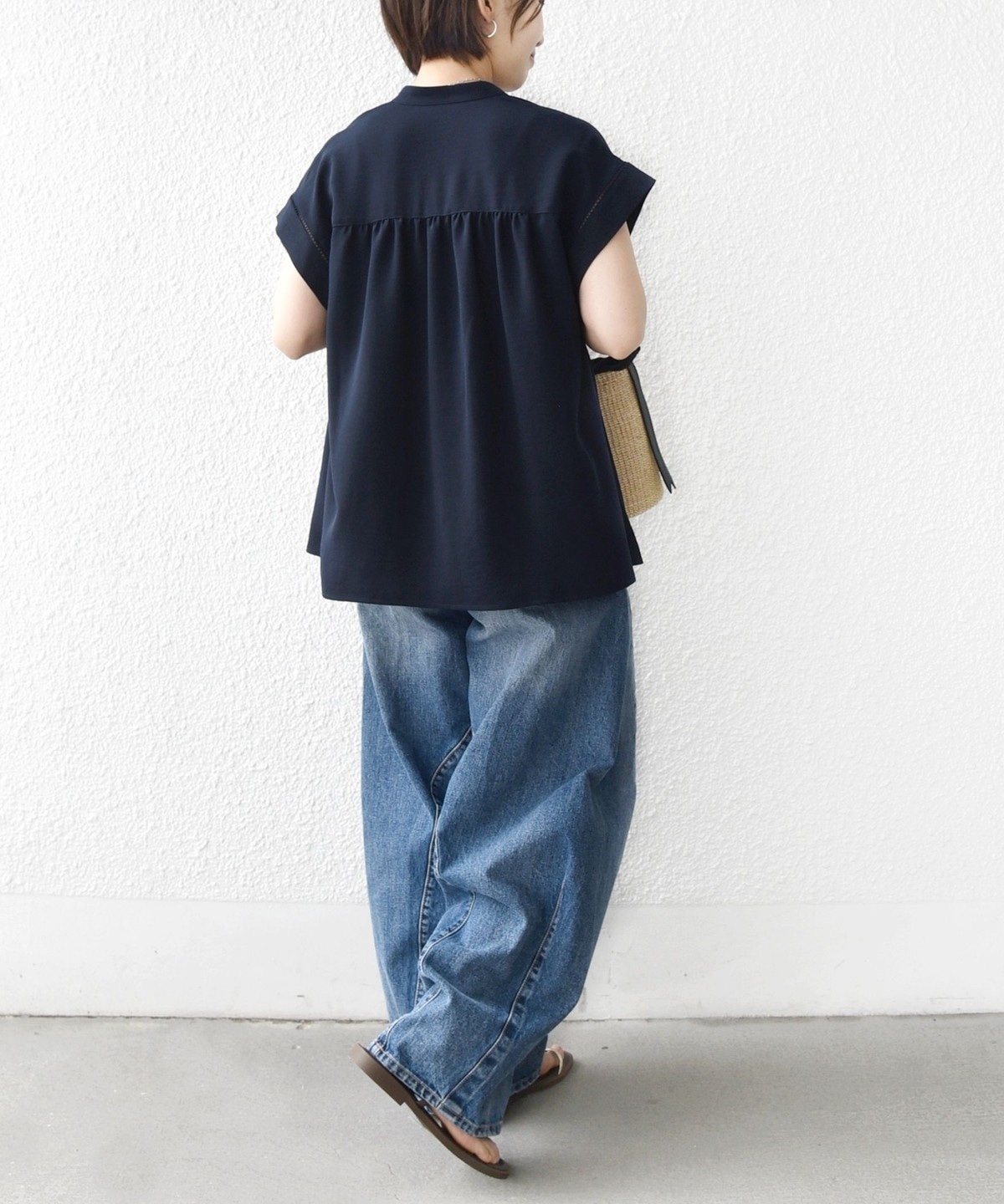 スキッパーデザインにしている為、後ろに少しだけ抜いて抜け感を出して着ていただくのがポイント。
