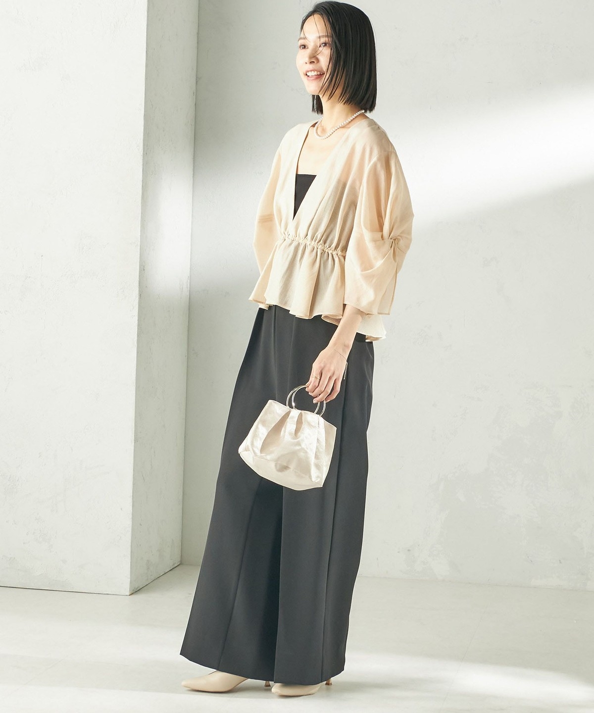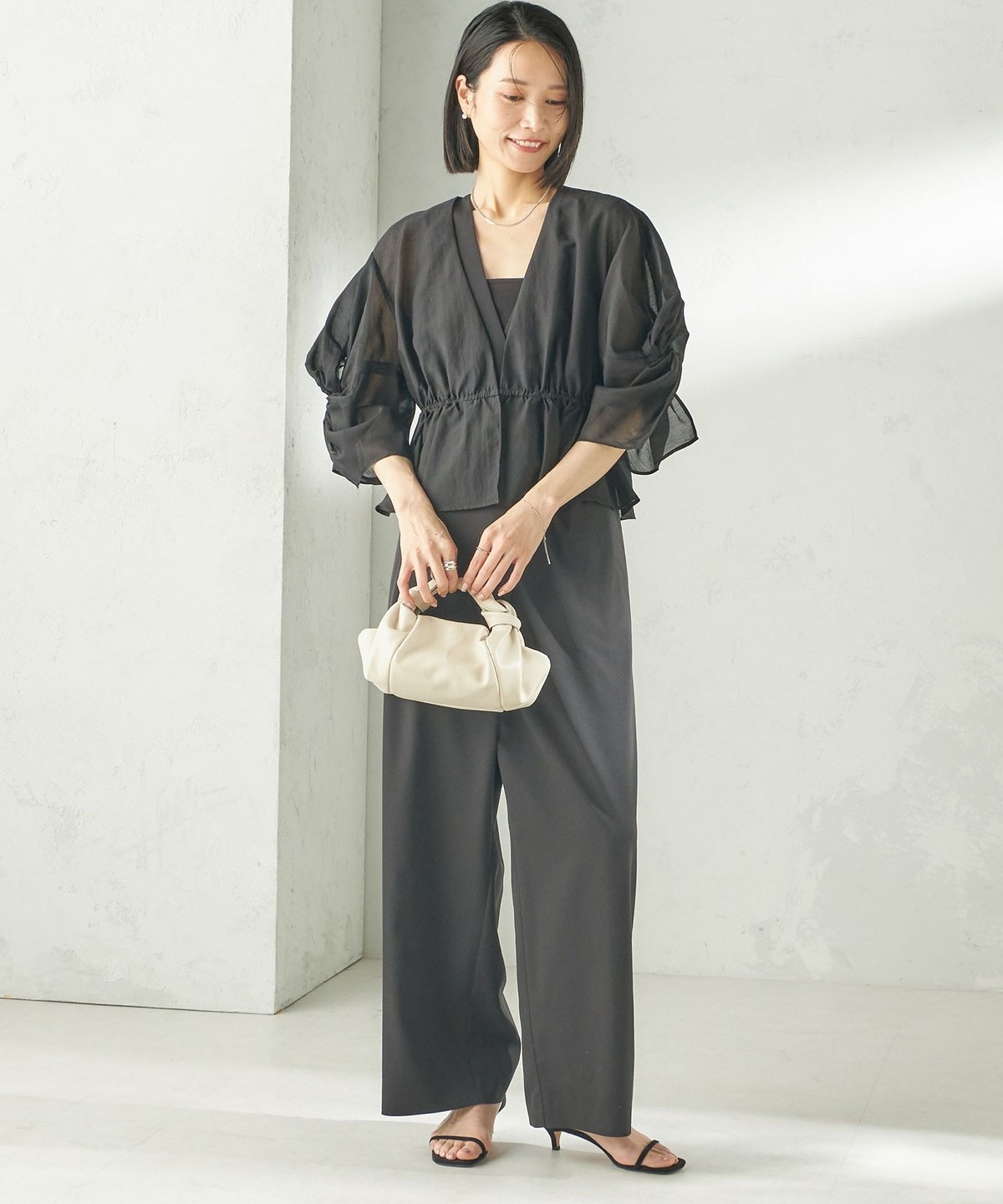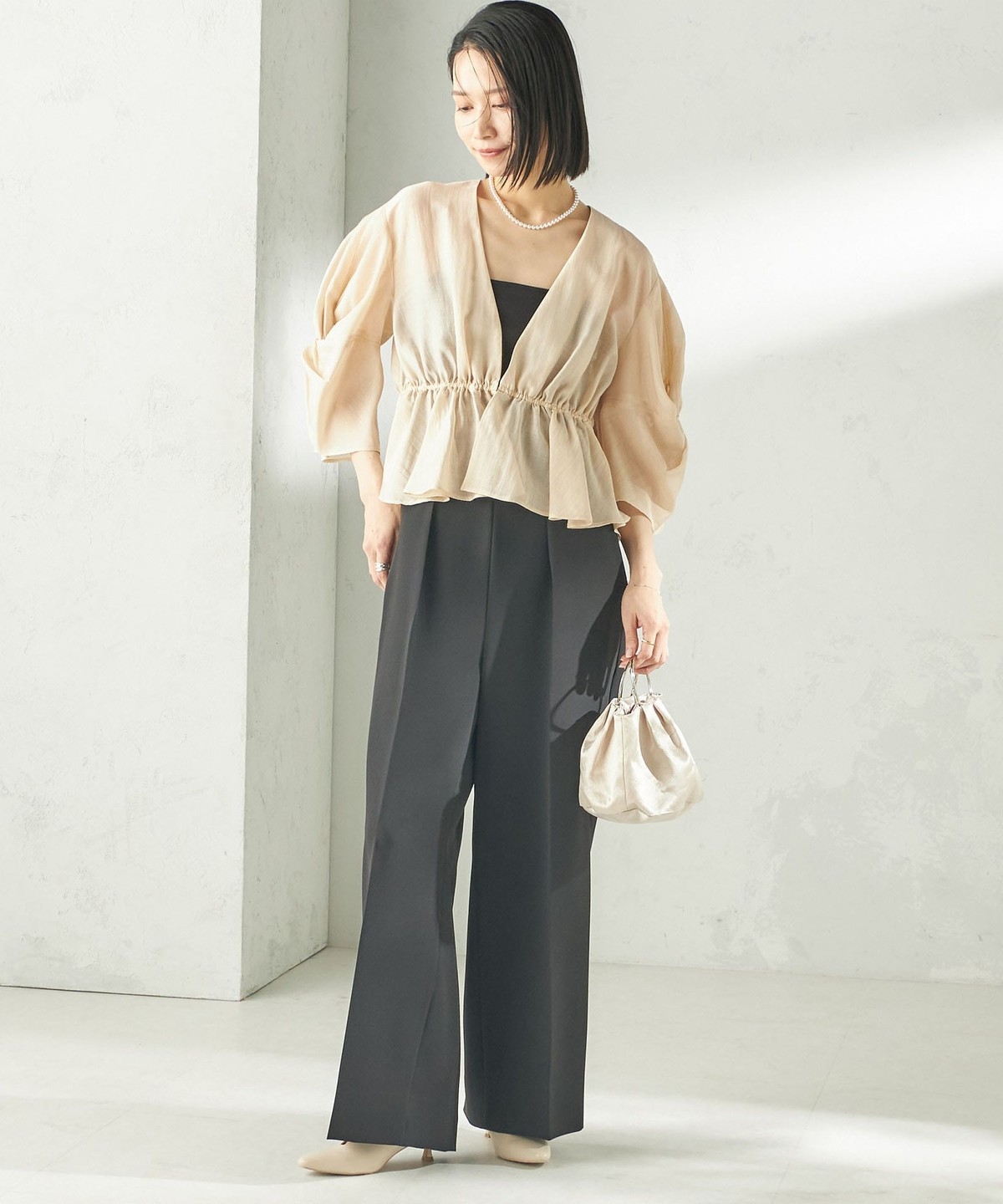 カップ付きインナーに重ね、ワイドパンツを合わせたオケージョンスタイル、またデニムにも相性が良くフォーマルシーンからデイリーまで幅広いシーンでのスタイリングをお楽しみいただけます。