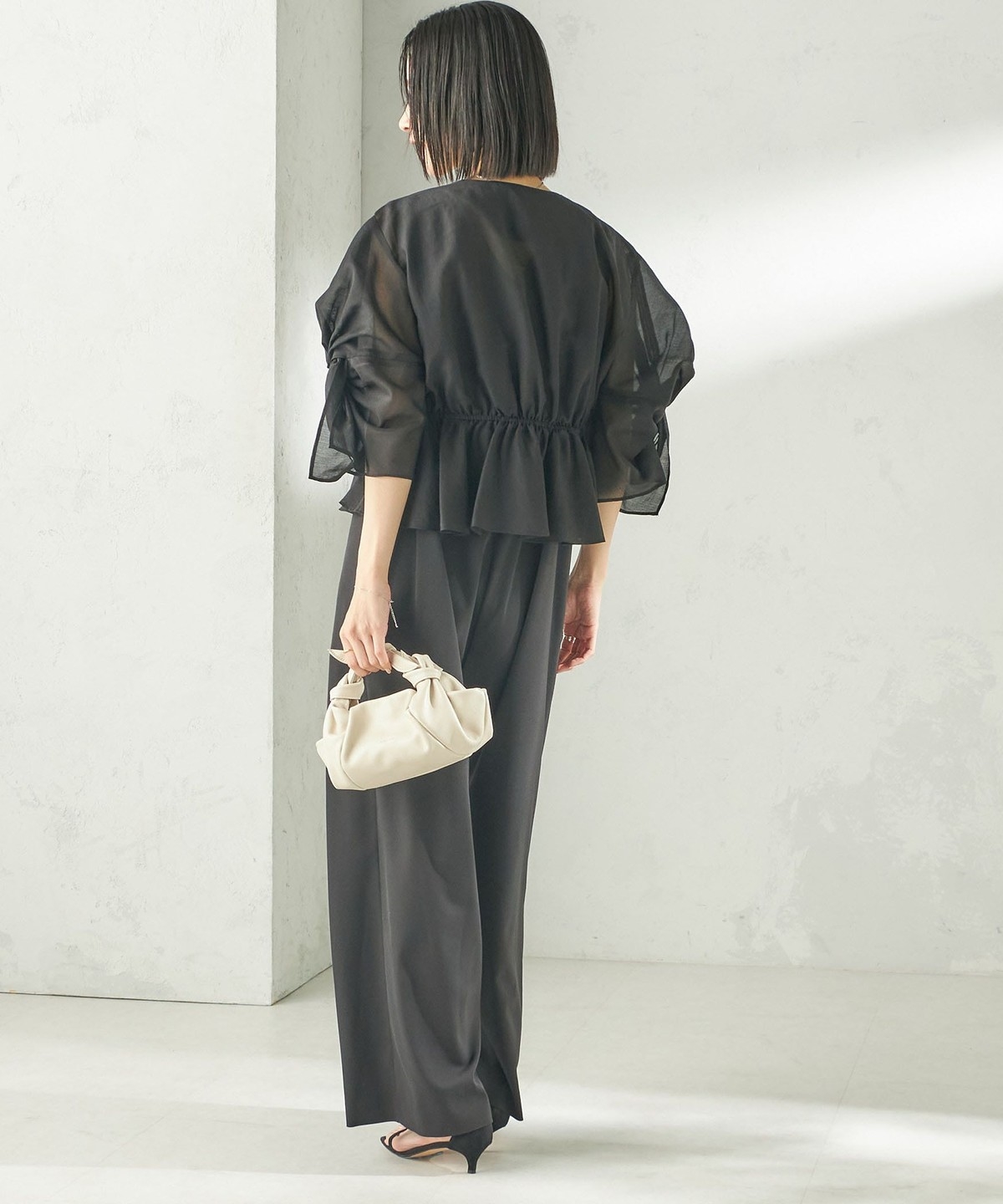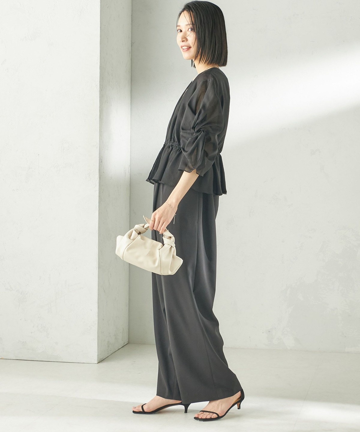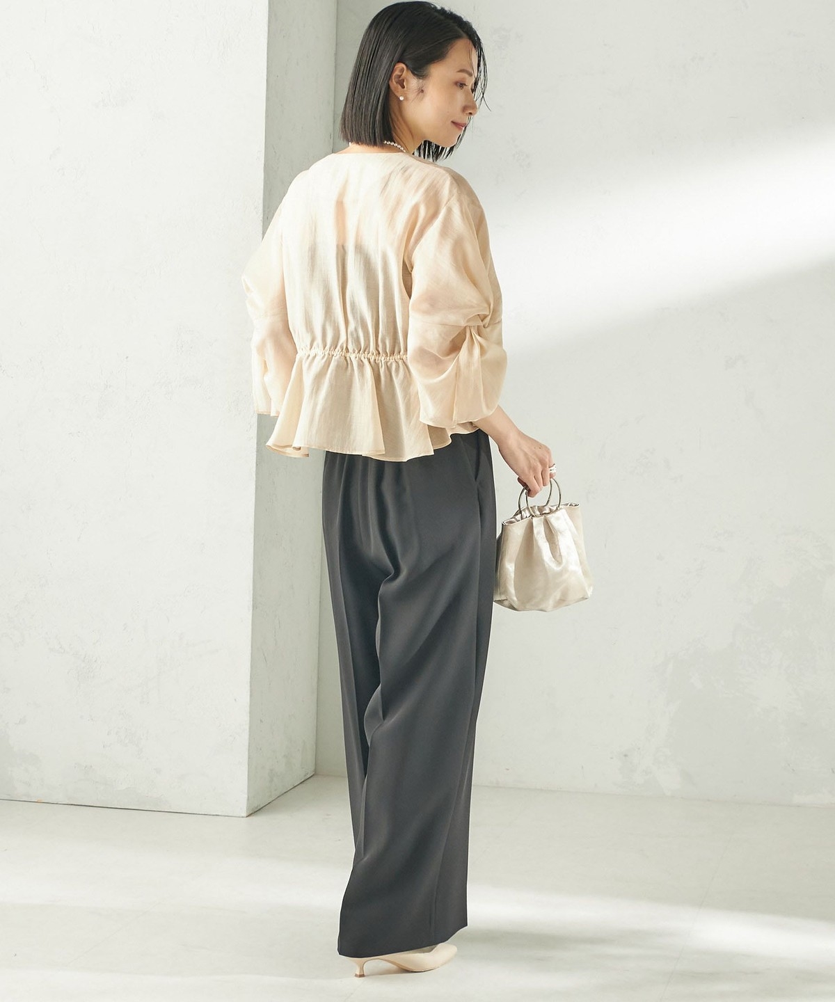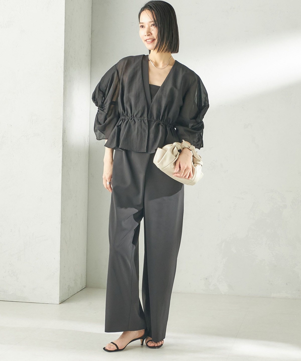 カップ付きインナーに重ね、ワイドパンツを合わせたオケージョンスタイル、またデニムにも相性が良くフォーマルシーンからデイリーまで幅広いシーンでのスタイリングをお楽しみいただけます。