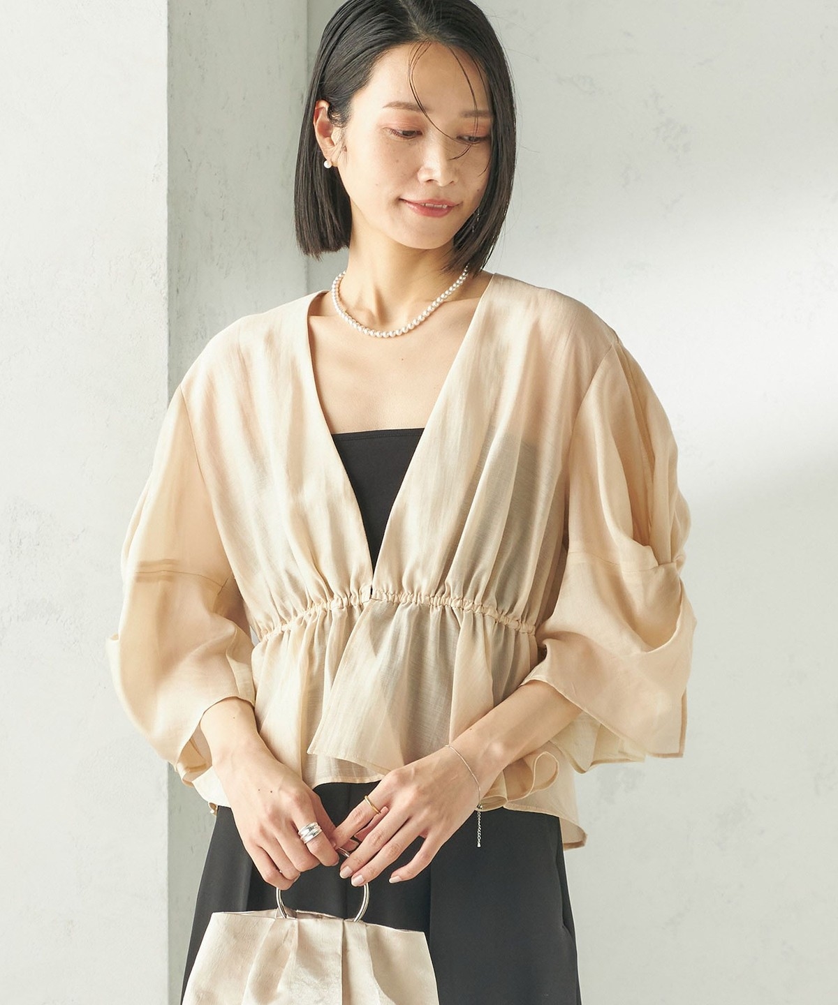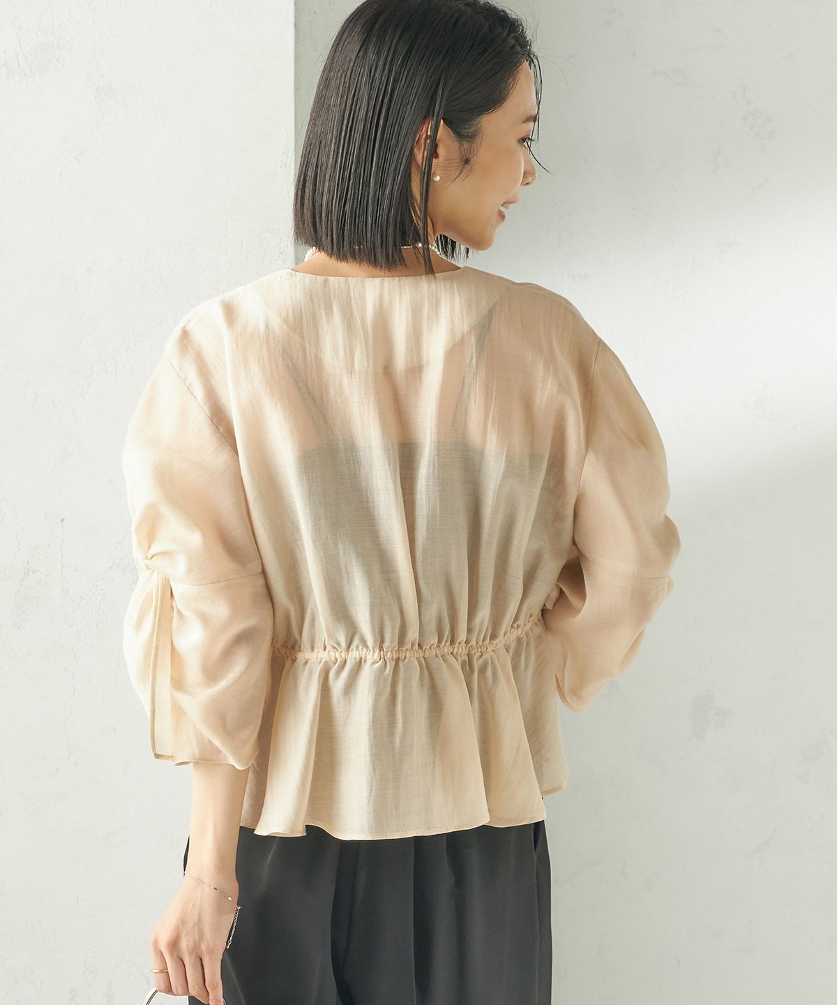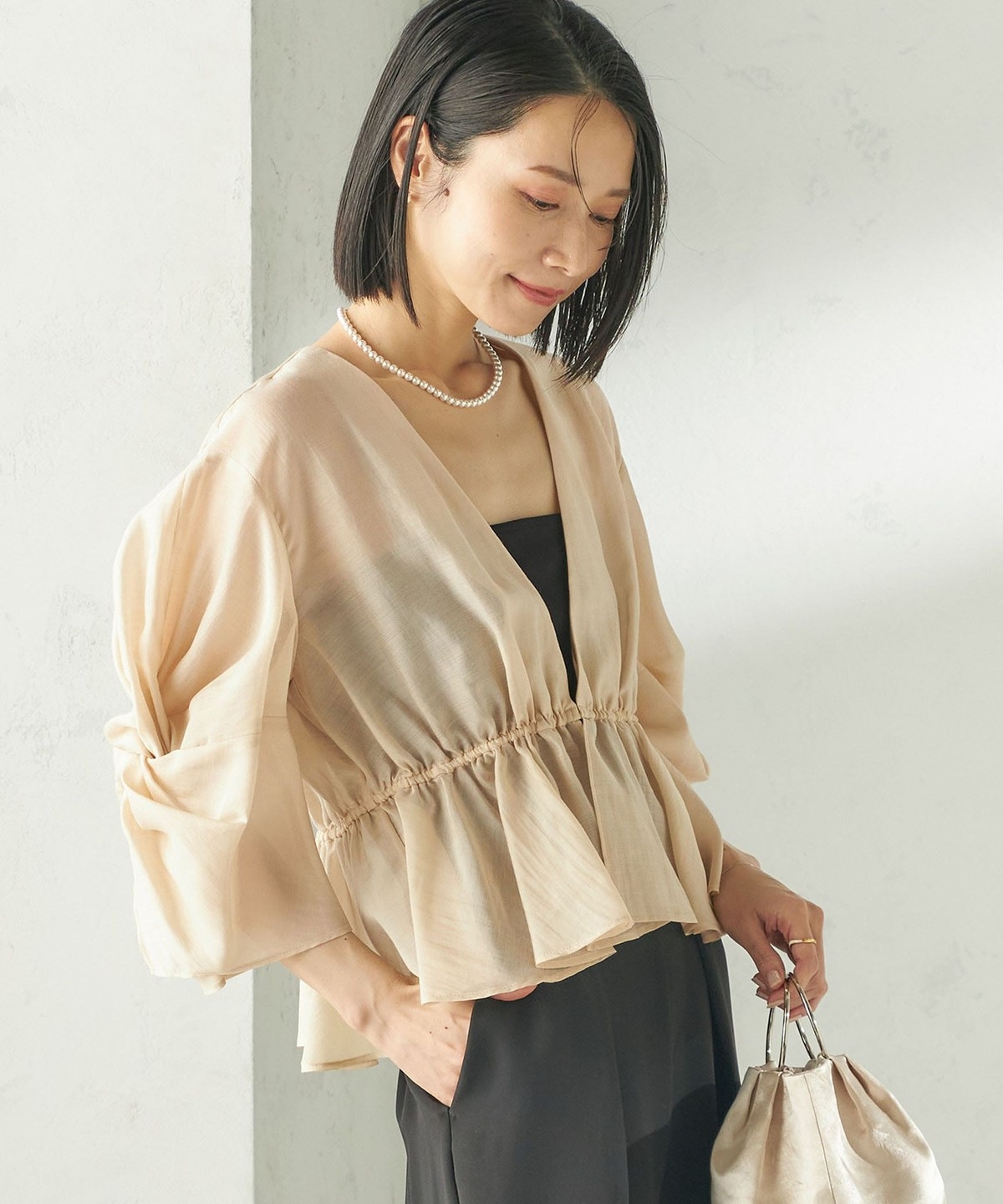 シアー感とふんわりシルエットが柔らかい印象を作る羽織りブラウス