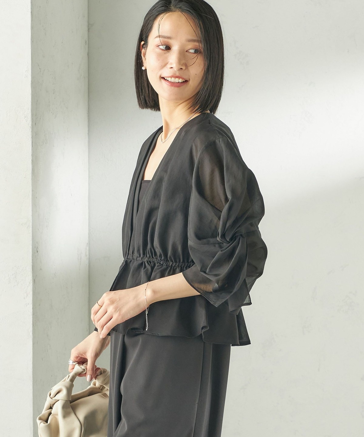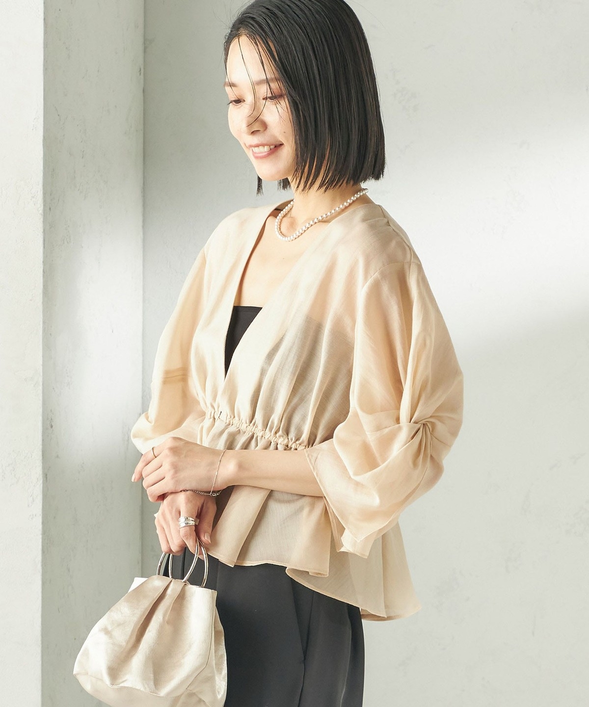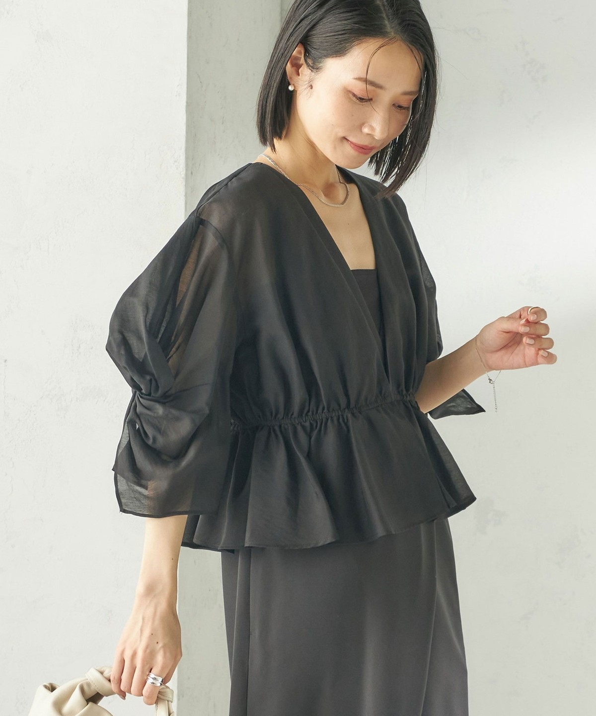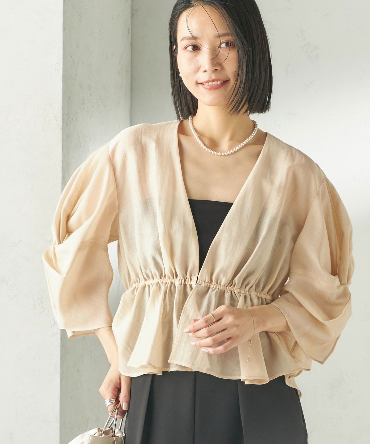 シアー感とふんわりシルエットが柔らかい印象を作る羽織りブラウス