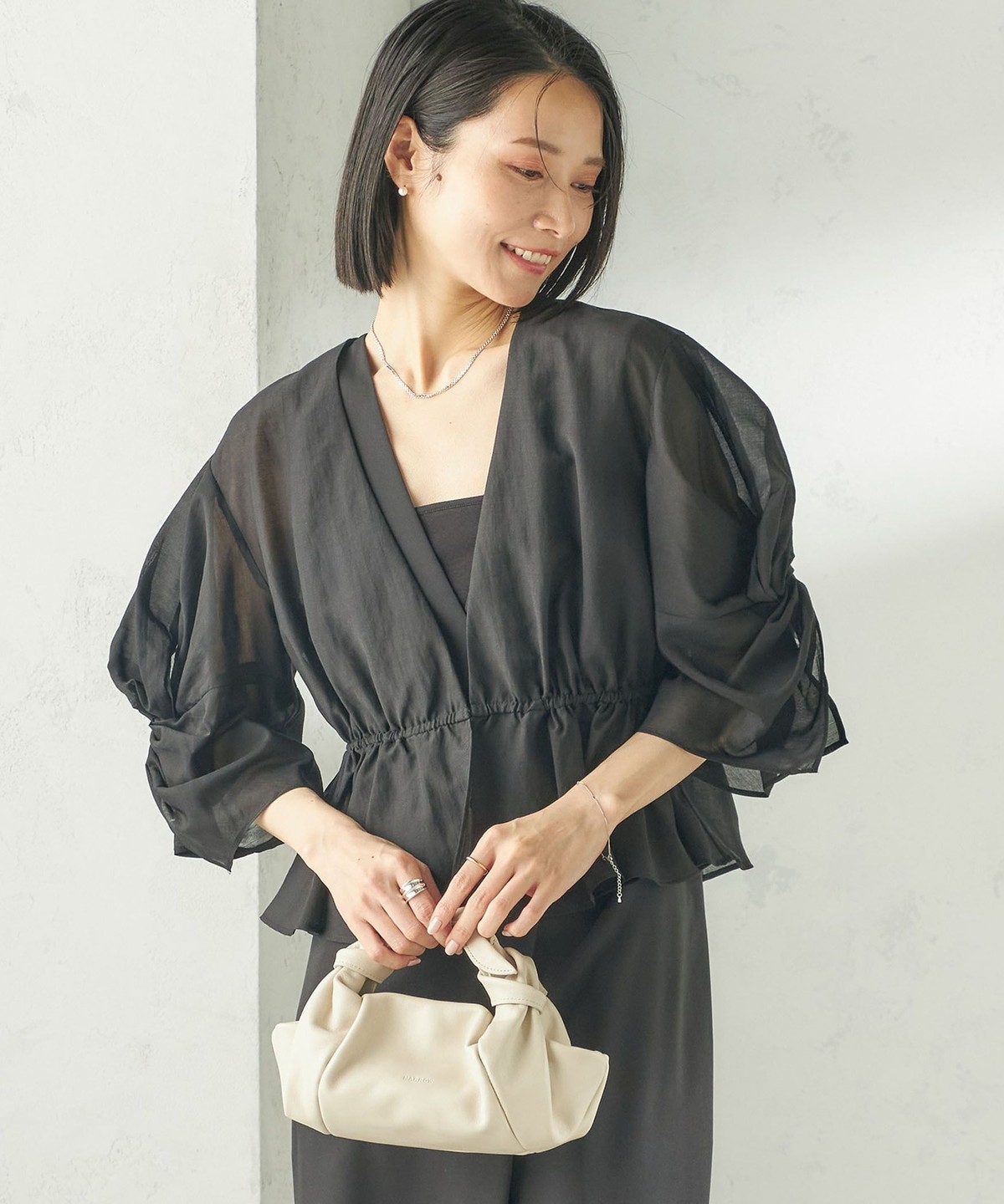 ふんわりとした袖のねじりのディテールが洗練された羽織りブラウスです。