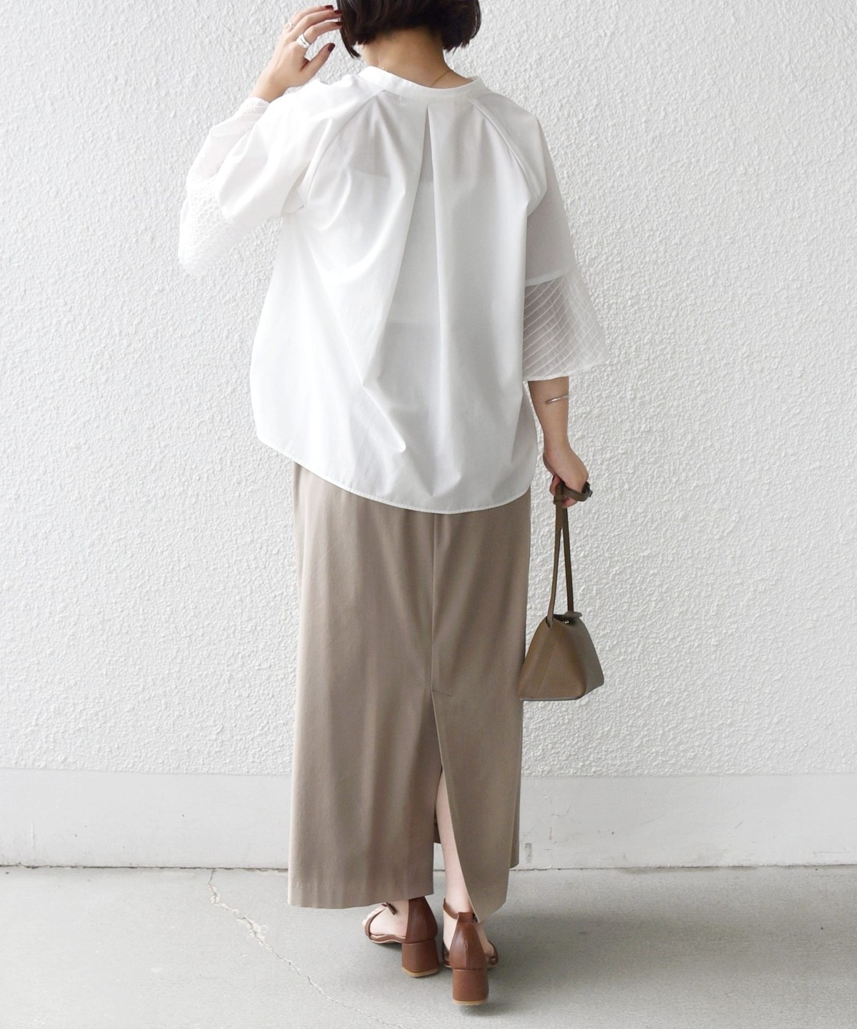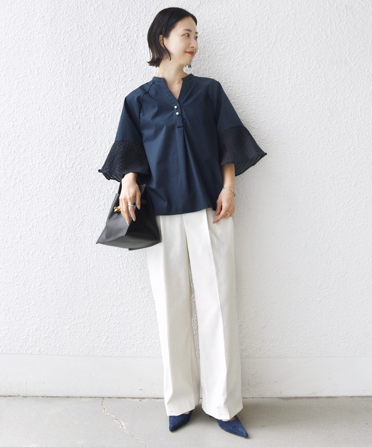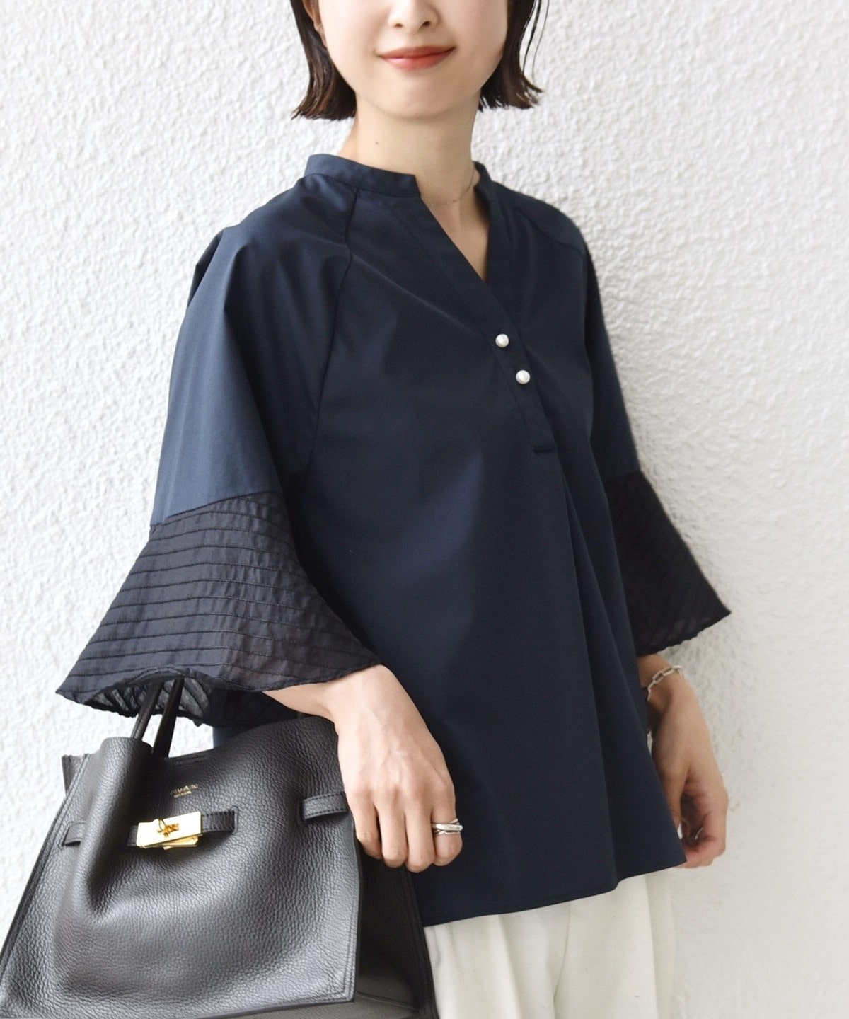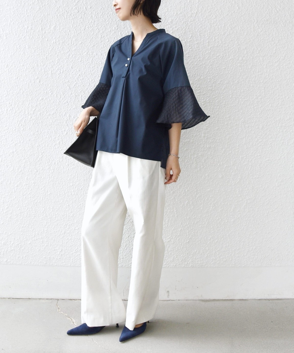 フレア袖でゆったりめのシルエットですが、綿のハリ感を出しきちんと感を演出できるシャツです。