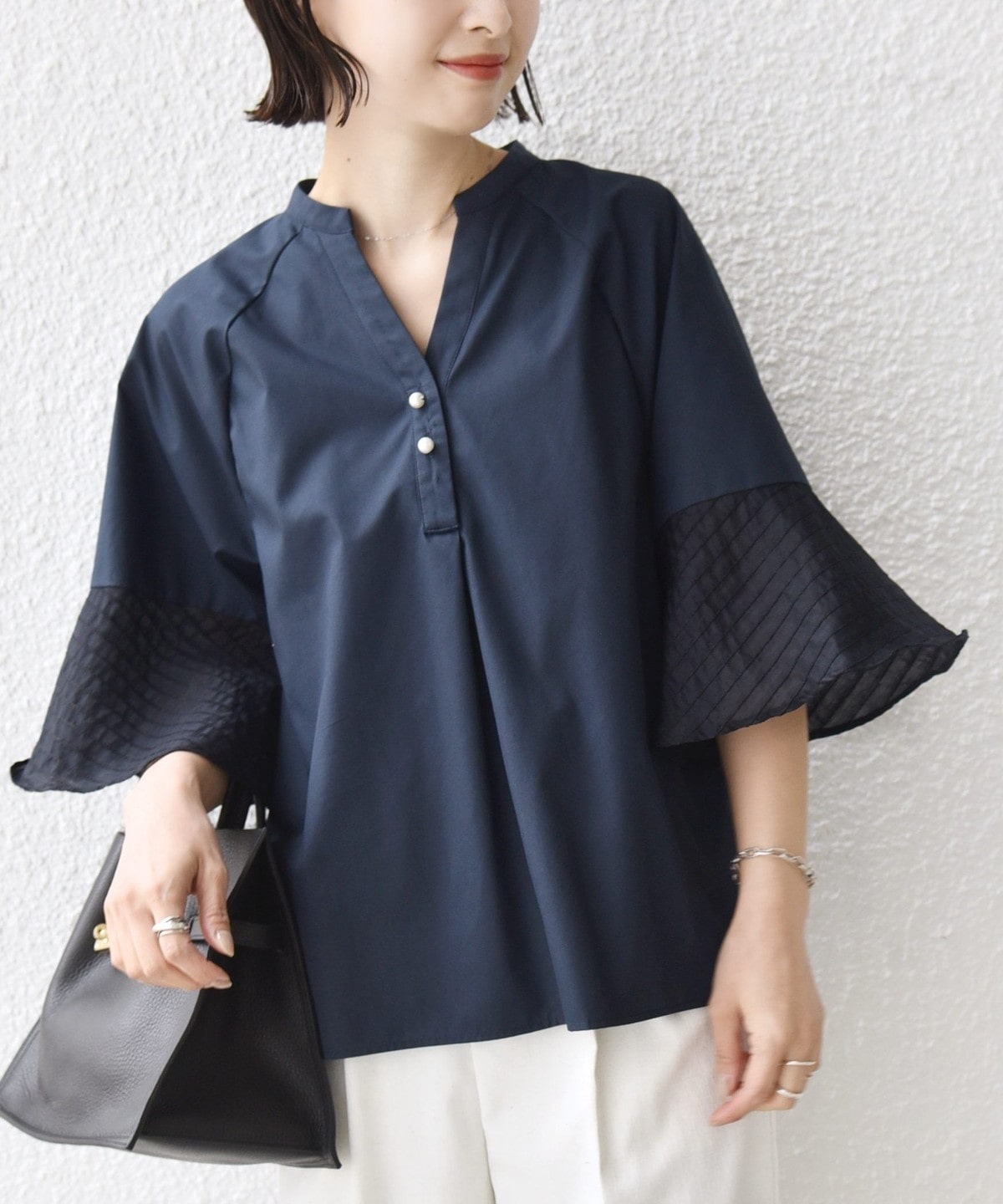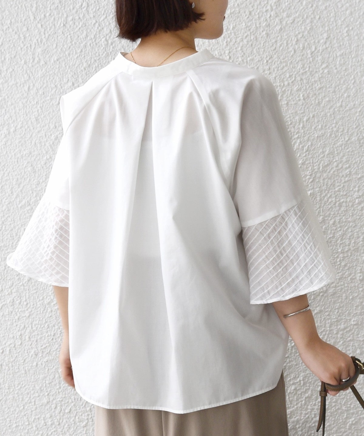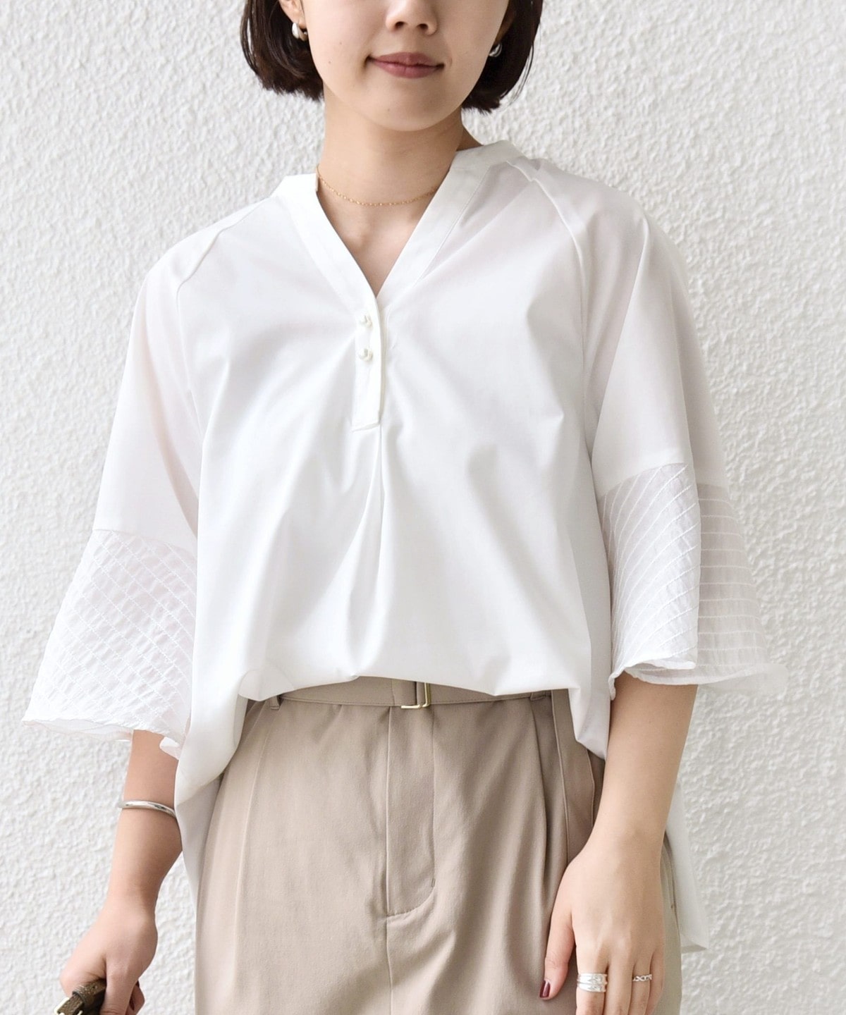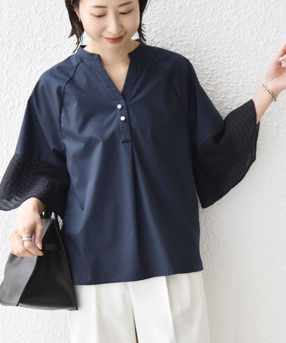 フレア袖でゆったりめのシルエットですが、綿のハリ感を出しきちんと感を演出できるシャツです。