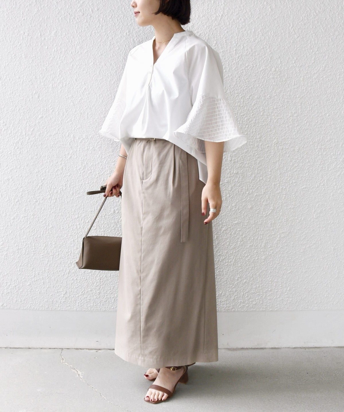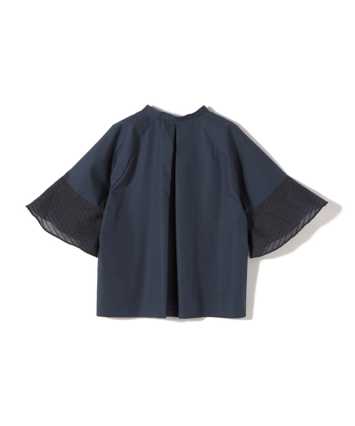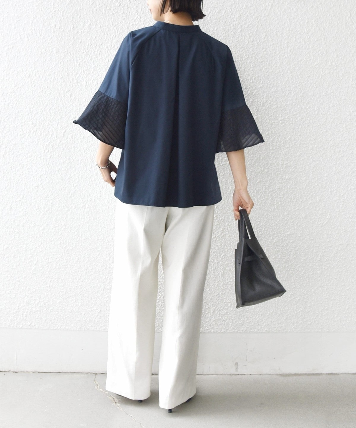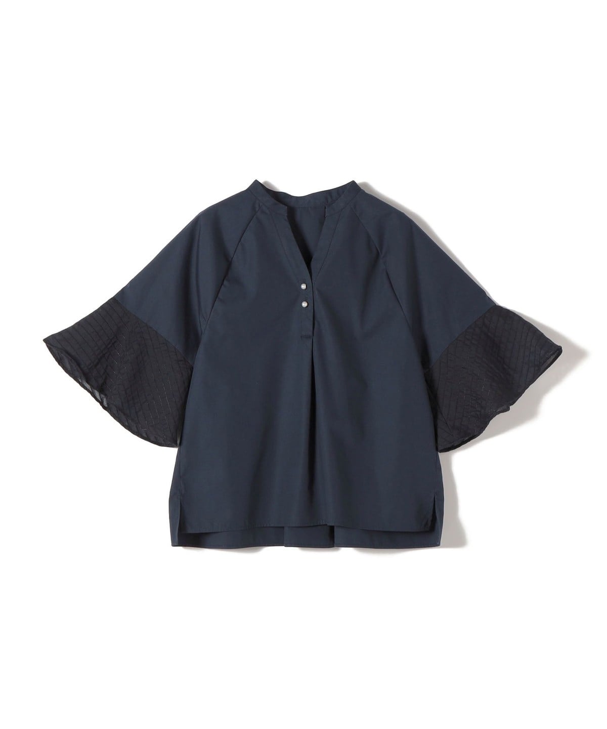 フレア袖でゆったりめのシルエットですが、綿のハリ感を出しきちんと感を演出できるシャツです。