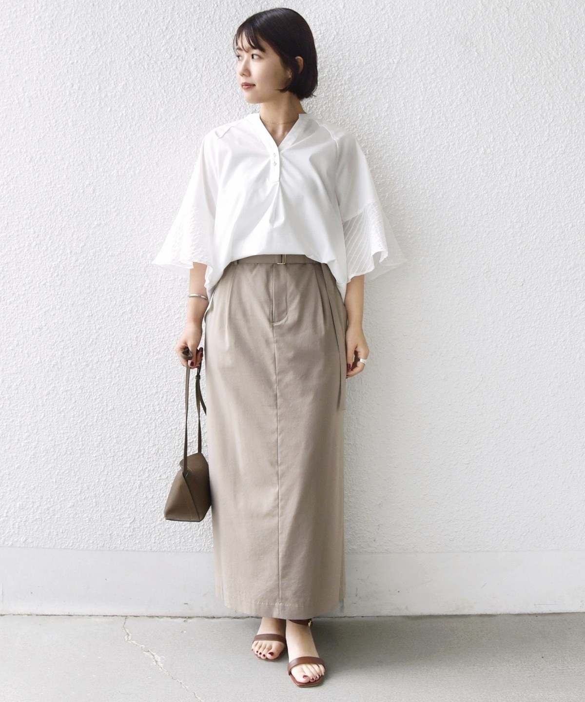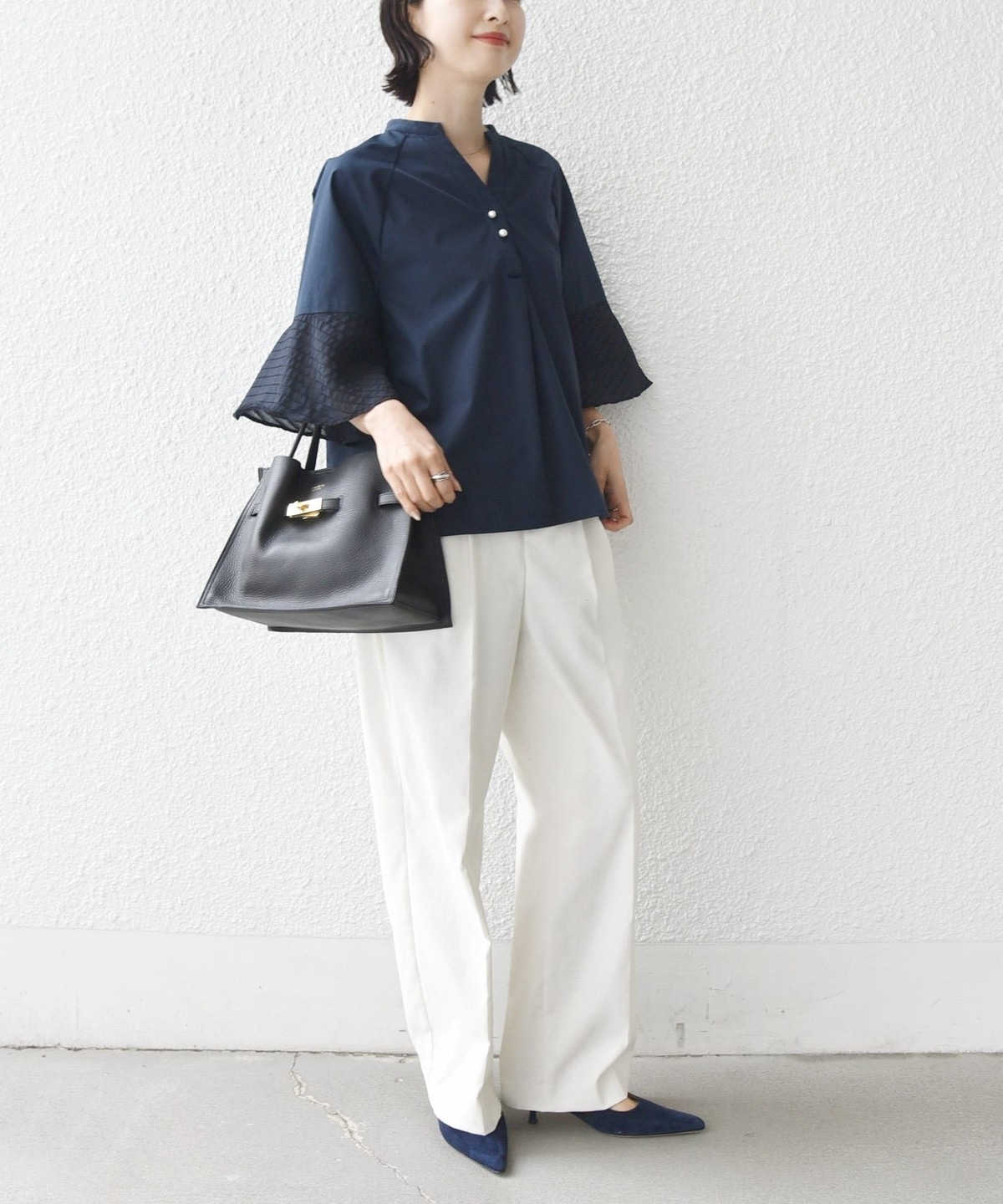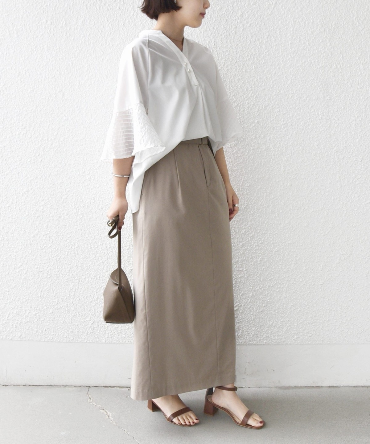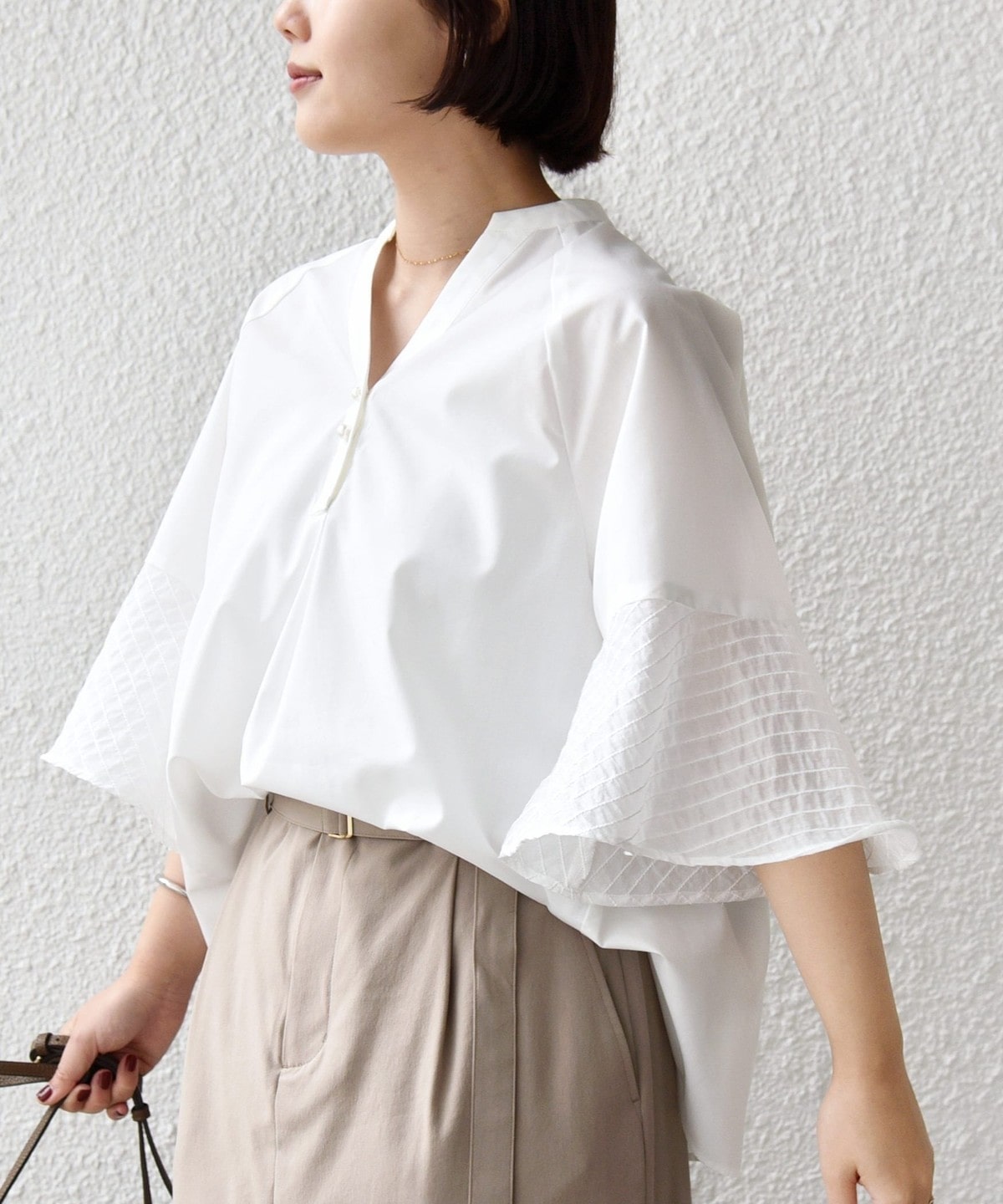 フレア袖でゆったりめのシルエットですが、綿のハリ感を出しきちんと感を演出できるシャツです。