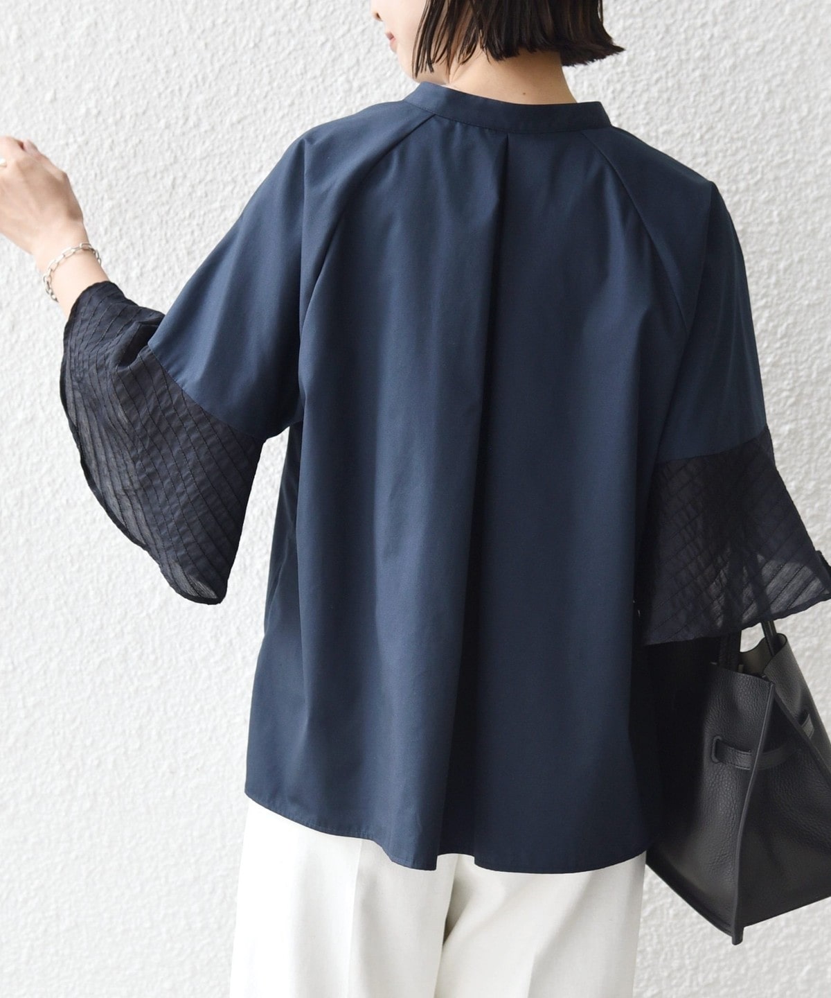 袖をシアーのボーダー素材で切り替えて立体感のある印象にしています。