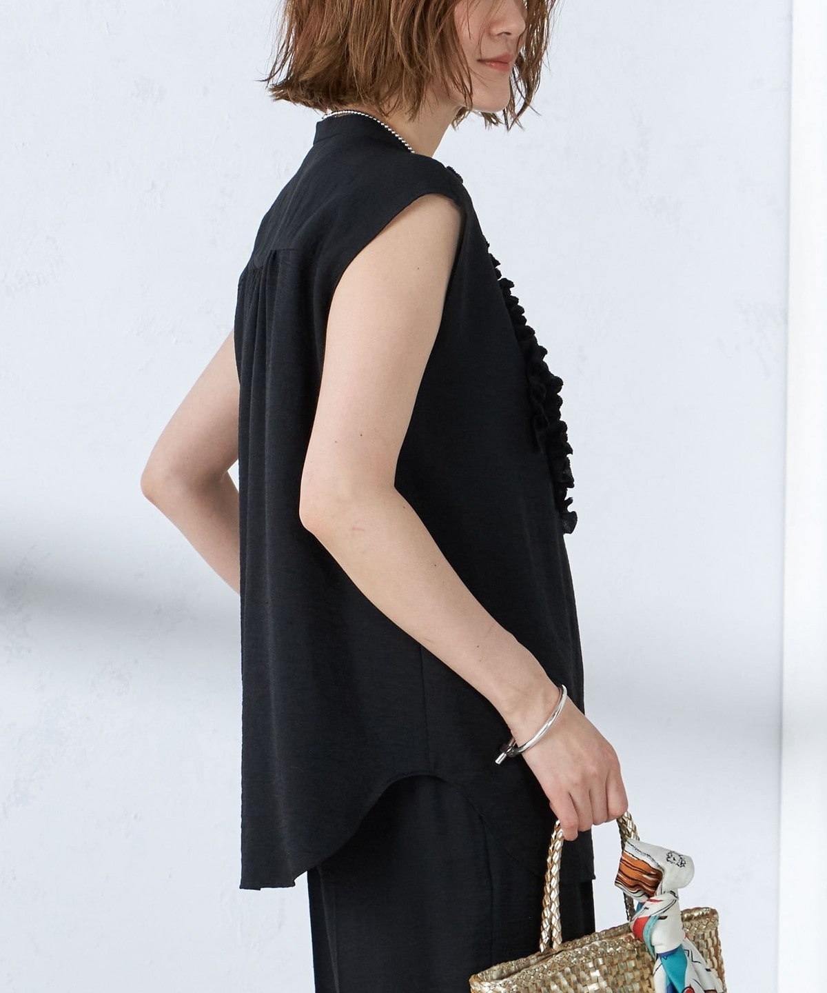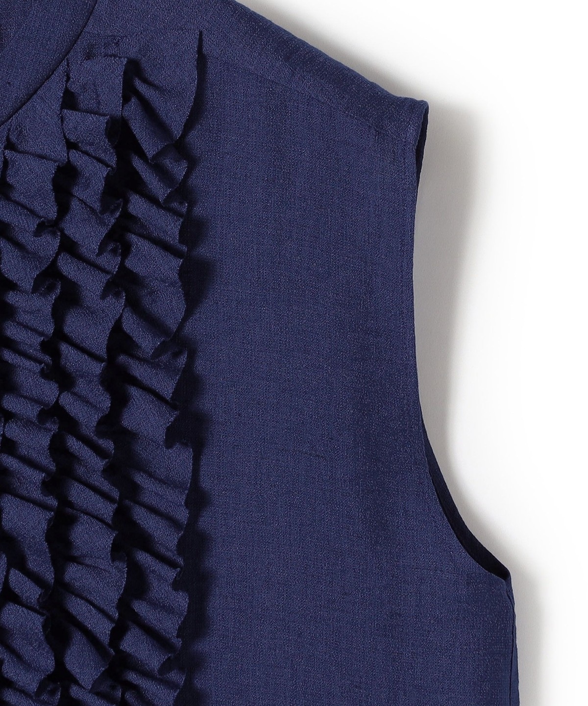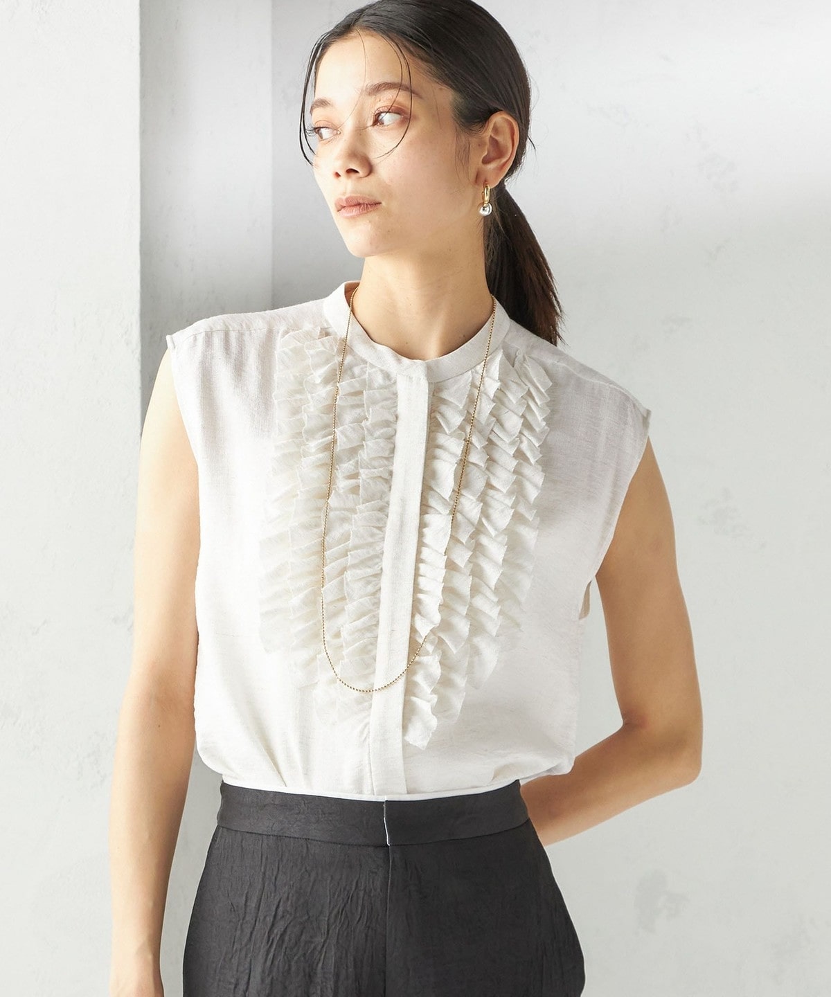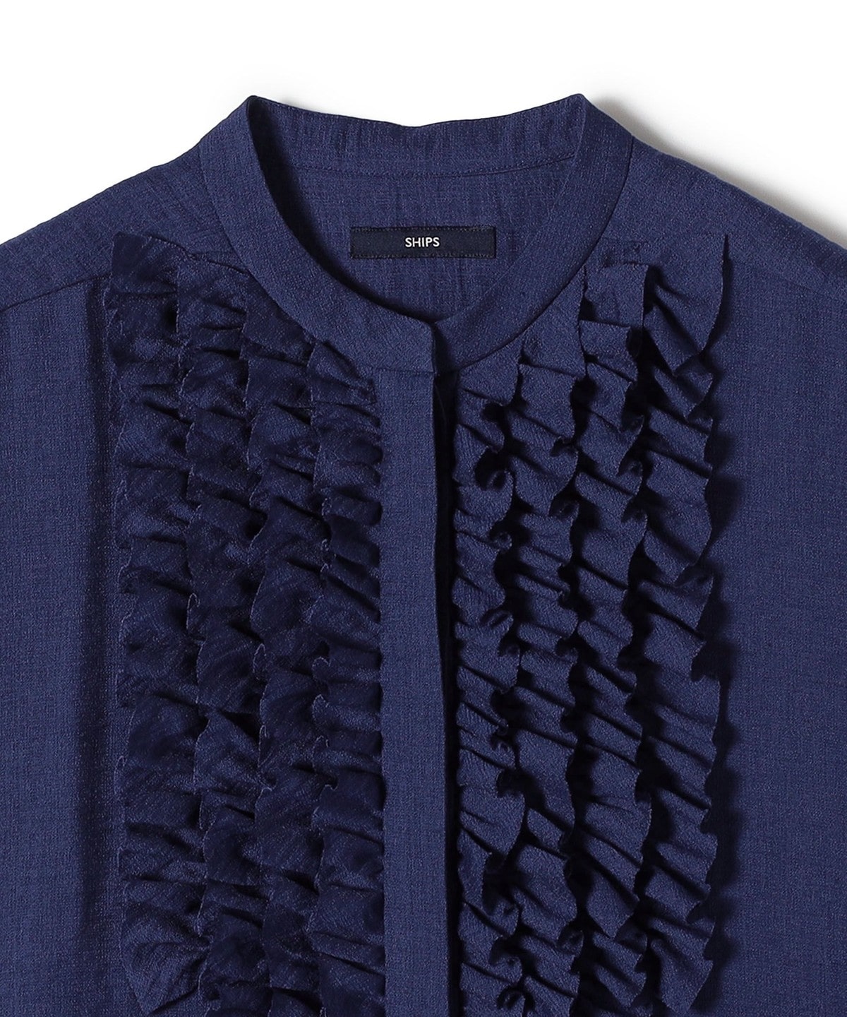 首回りはすっきりとしたバンドカラーで、甘すぎず大人っぽいバランスで入ったたっぷりのフリルが魅力。