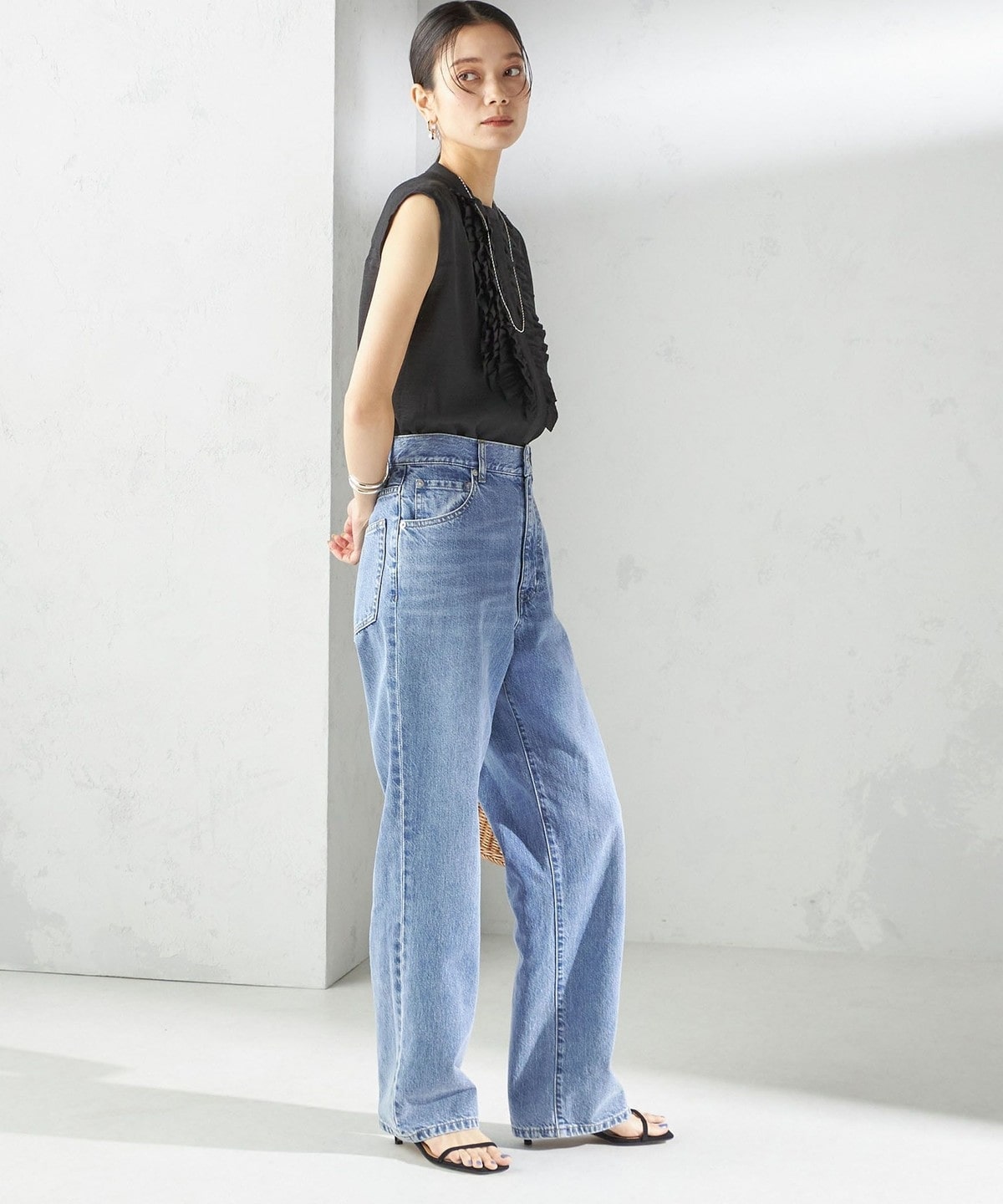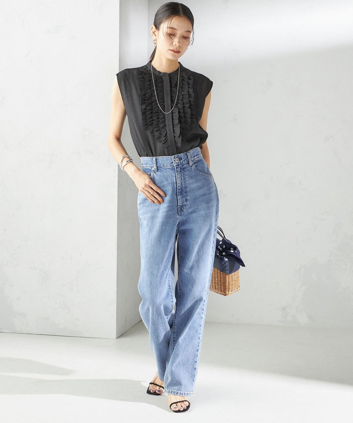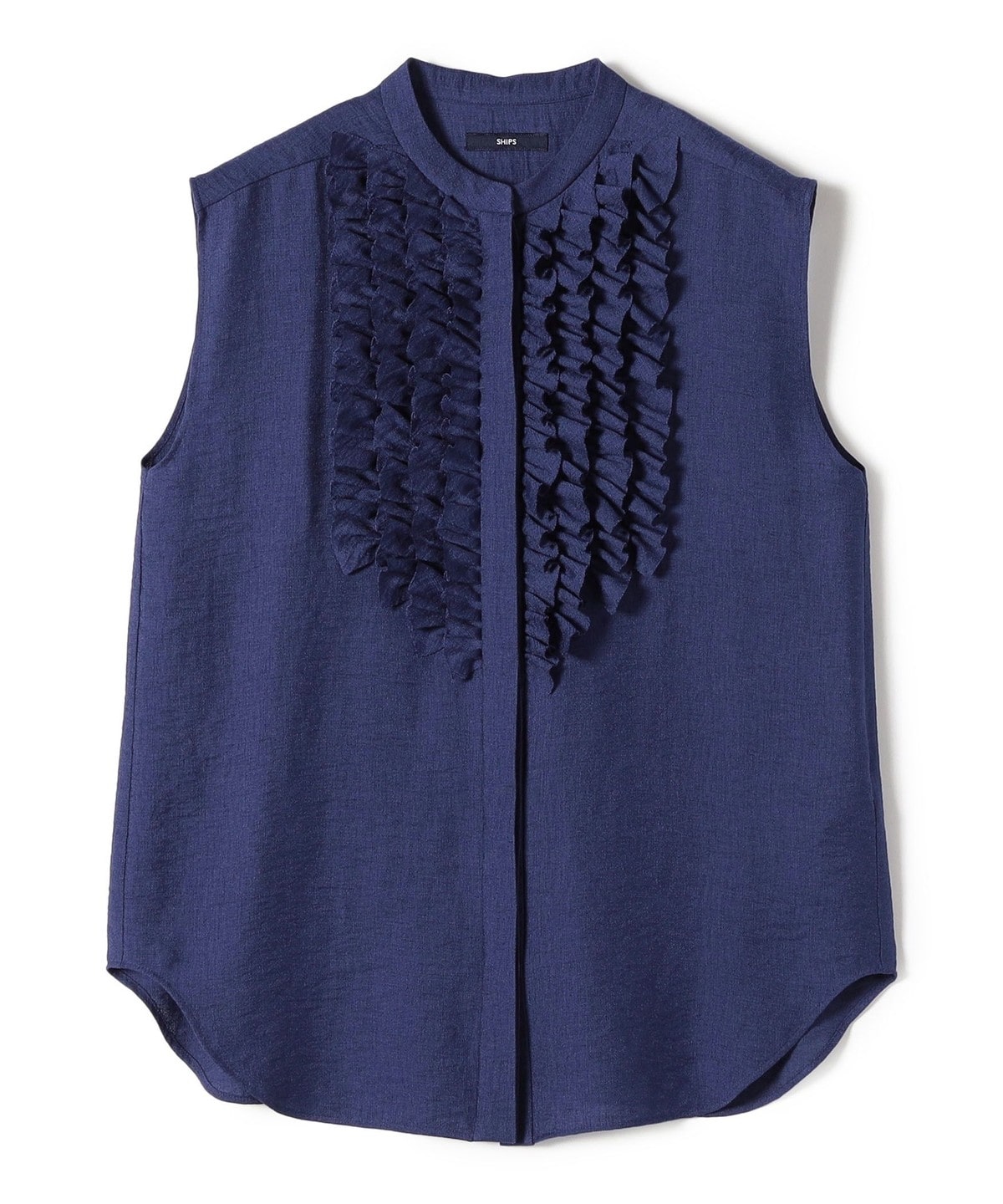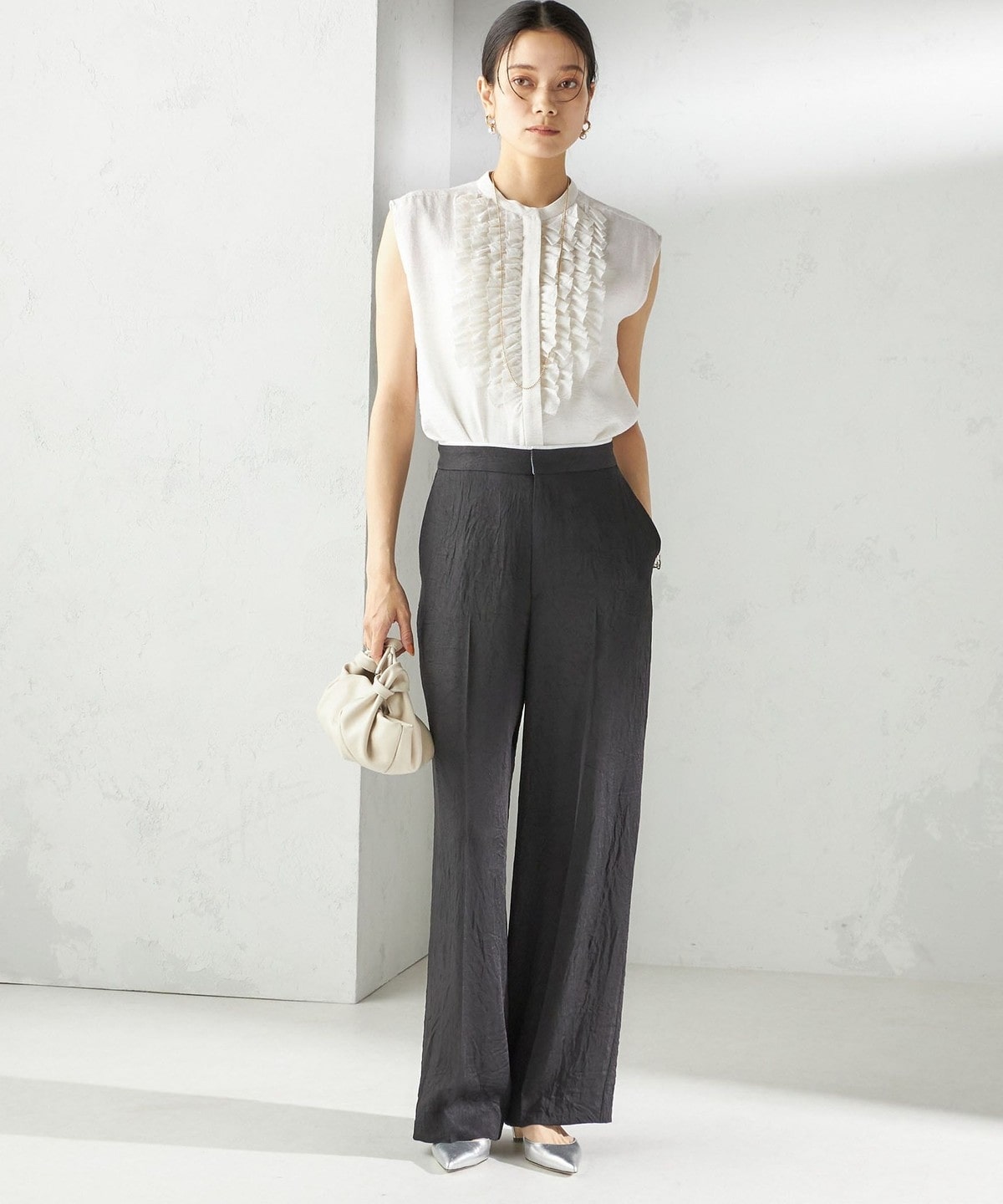 首回りはすっきりとしたバンドカラーで、甘すぎず大人っぽいバランスで入ったたっぷりのフリルが魅力。