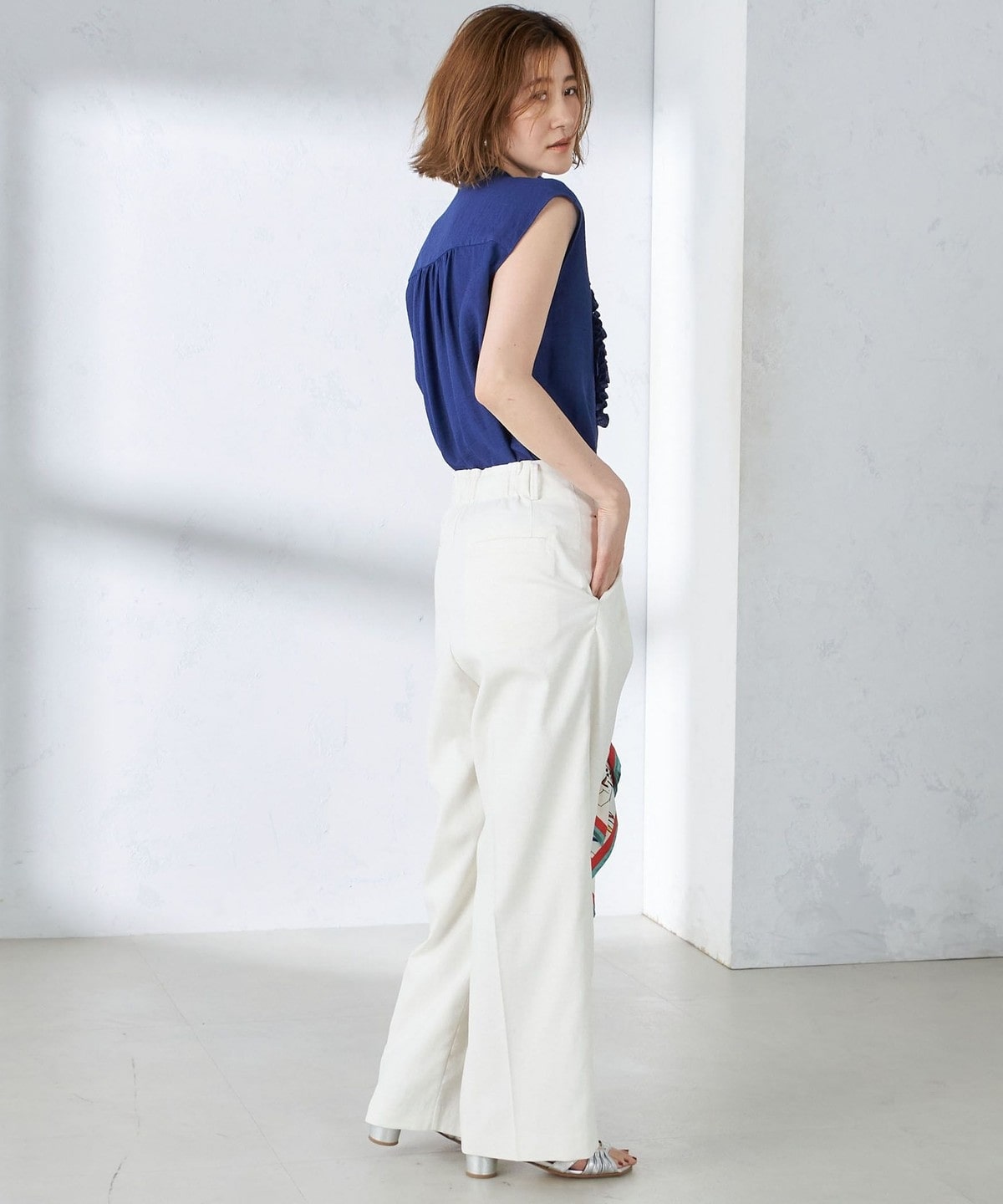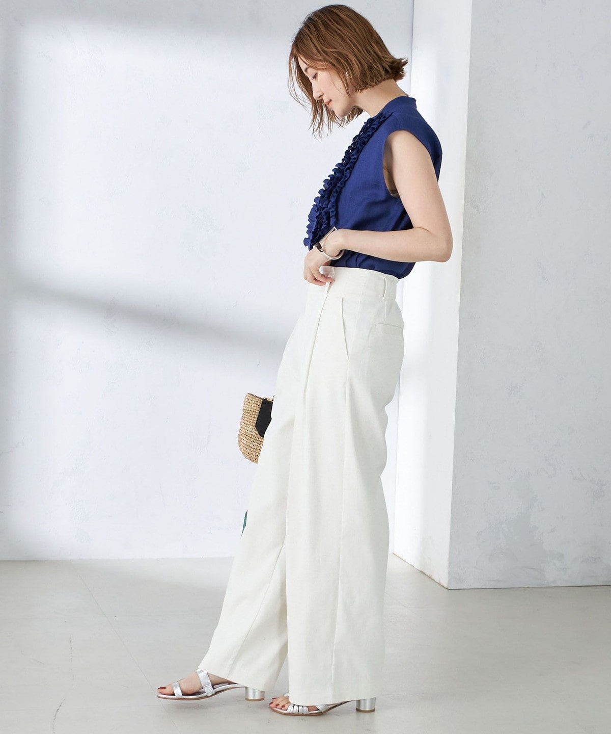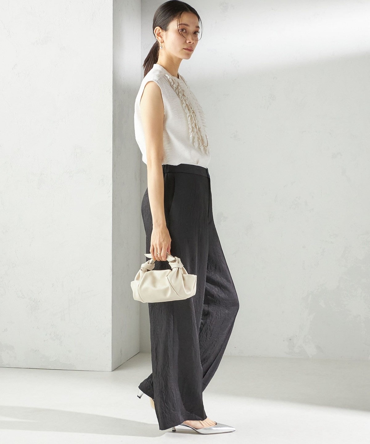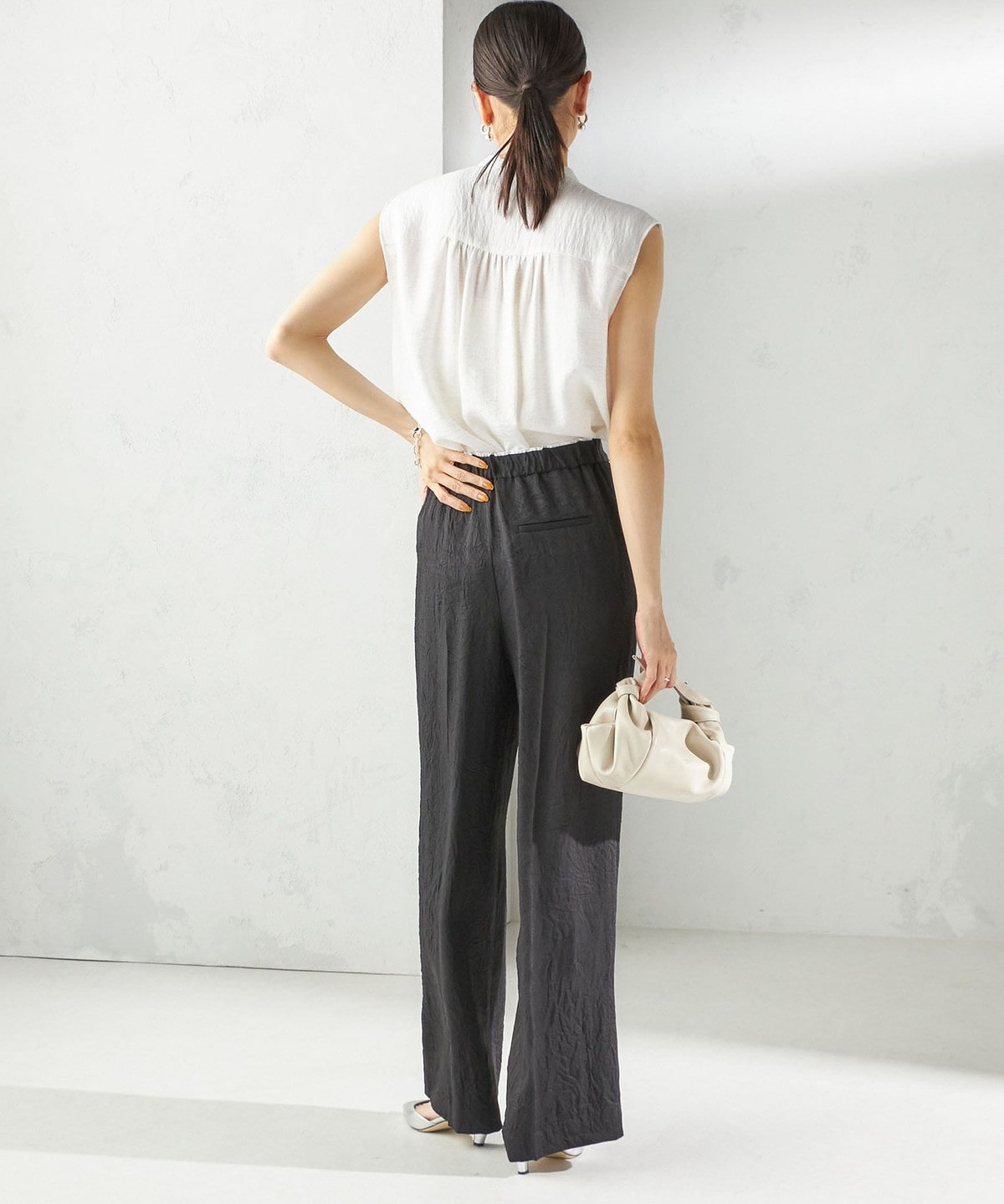 盛夏におすすめな麻混素材で、上品な光沢と落ち感が洗練された印象に。