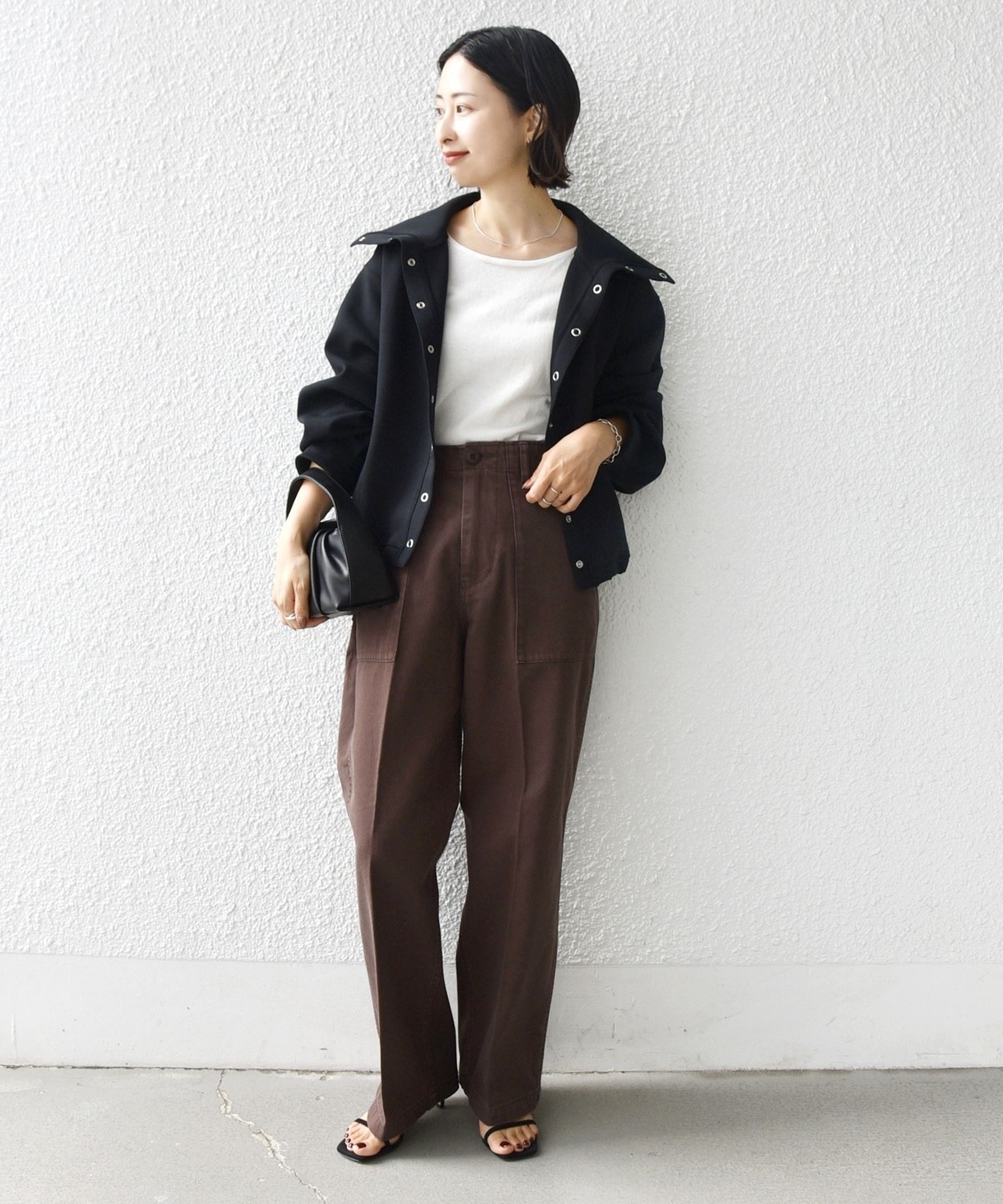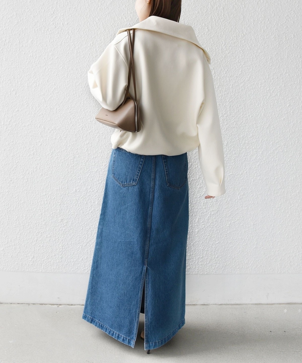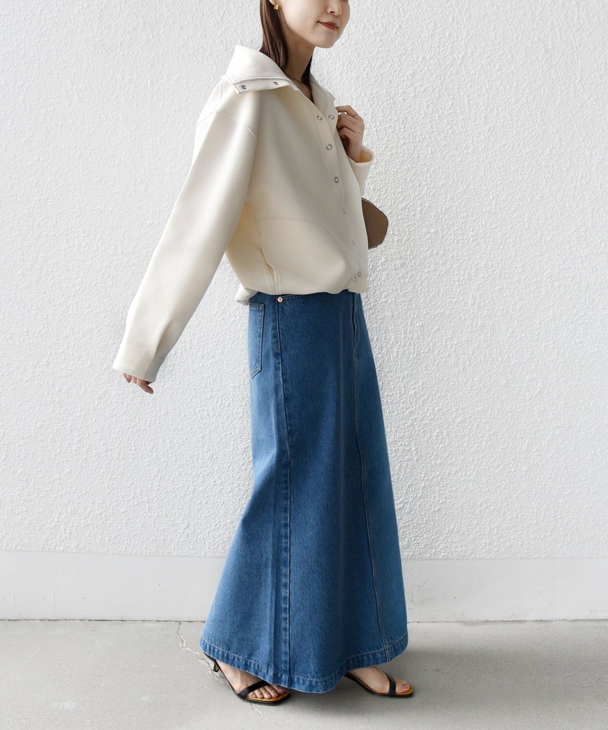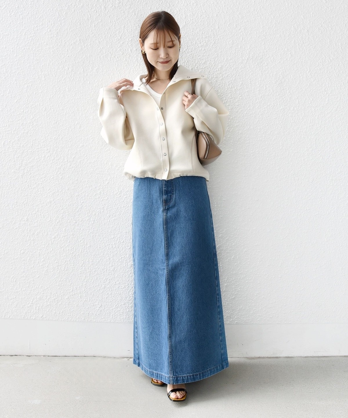 裾のドロストを絞ってバランスを調整できるので、ワイドパンツからIラインのスカートまで幅広く合わせられます。