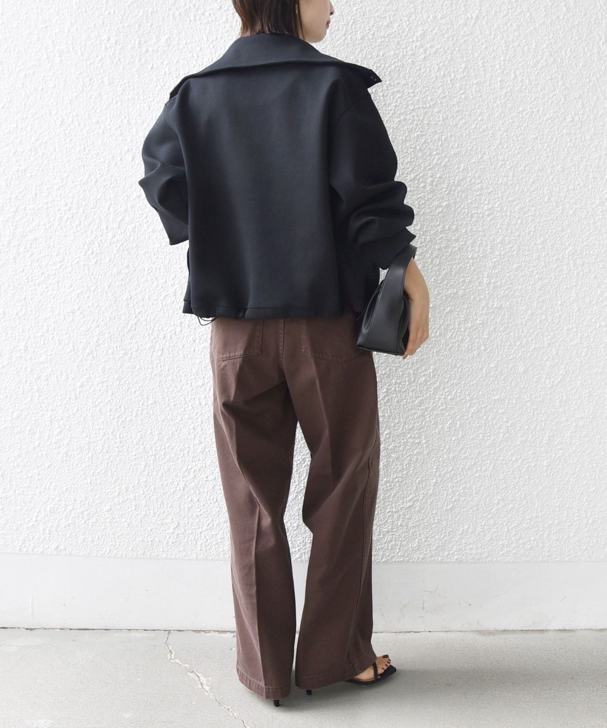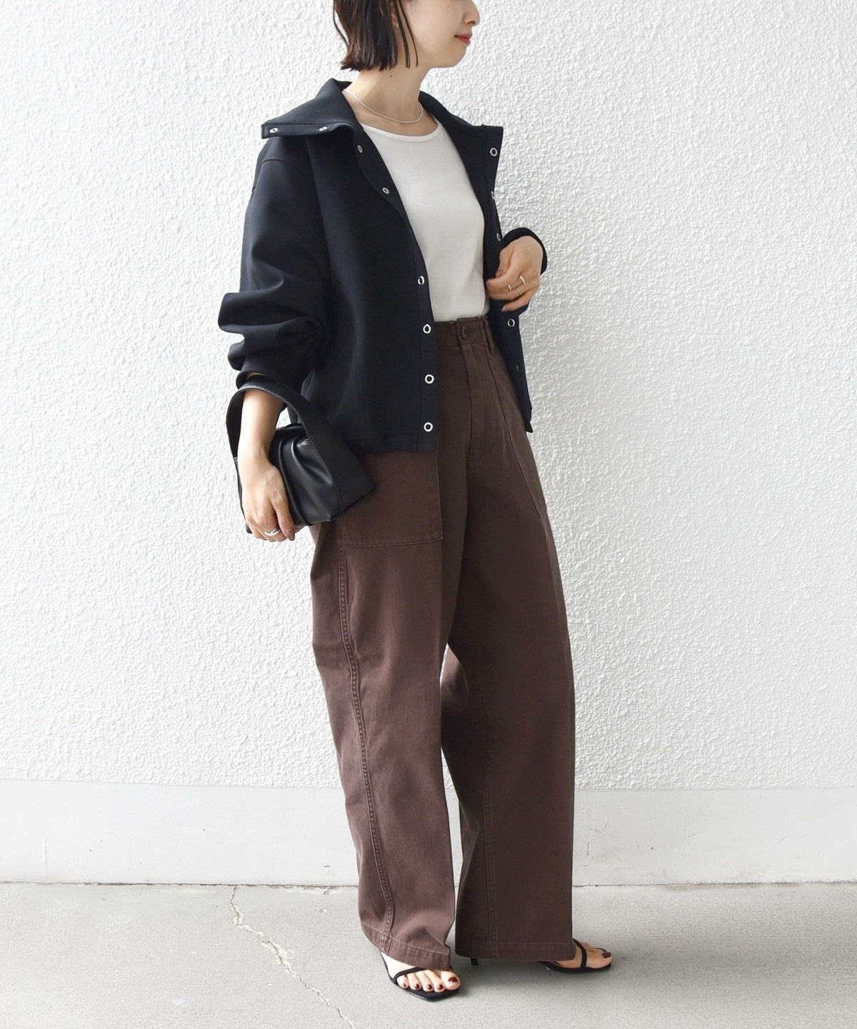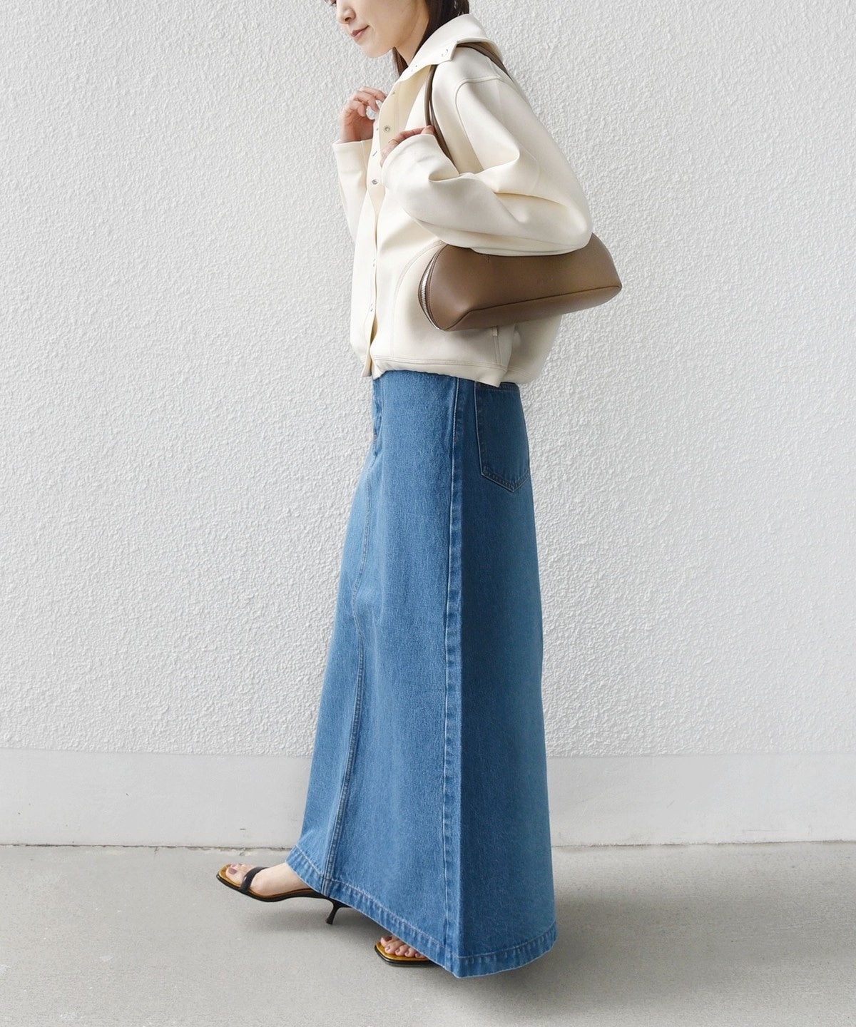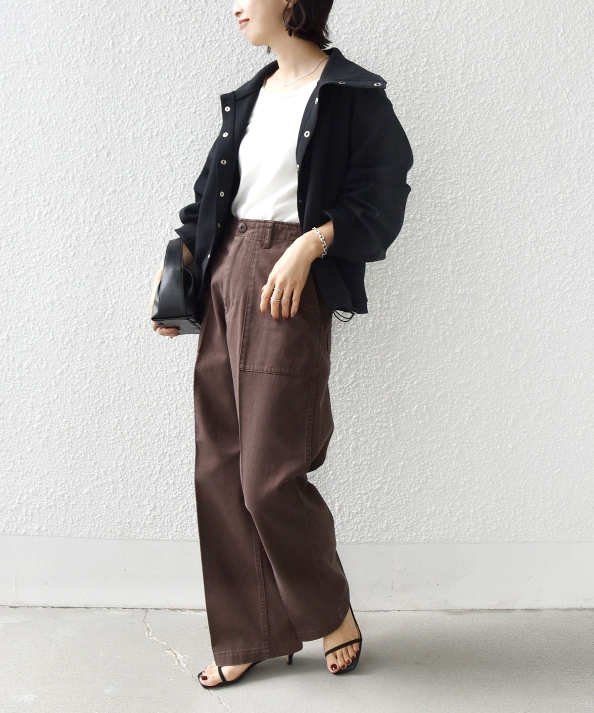 裾のドロストを絞ってバランスを調整できるので、ワイドパンツからIラインのスカートまで幅広く合わせられます。