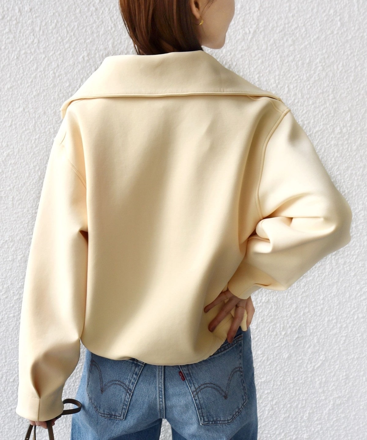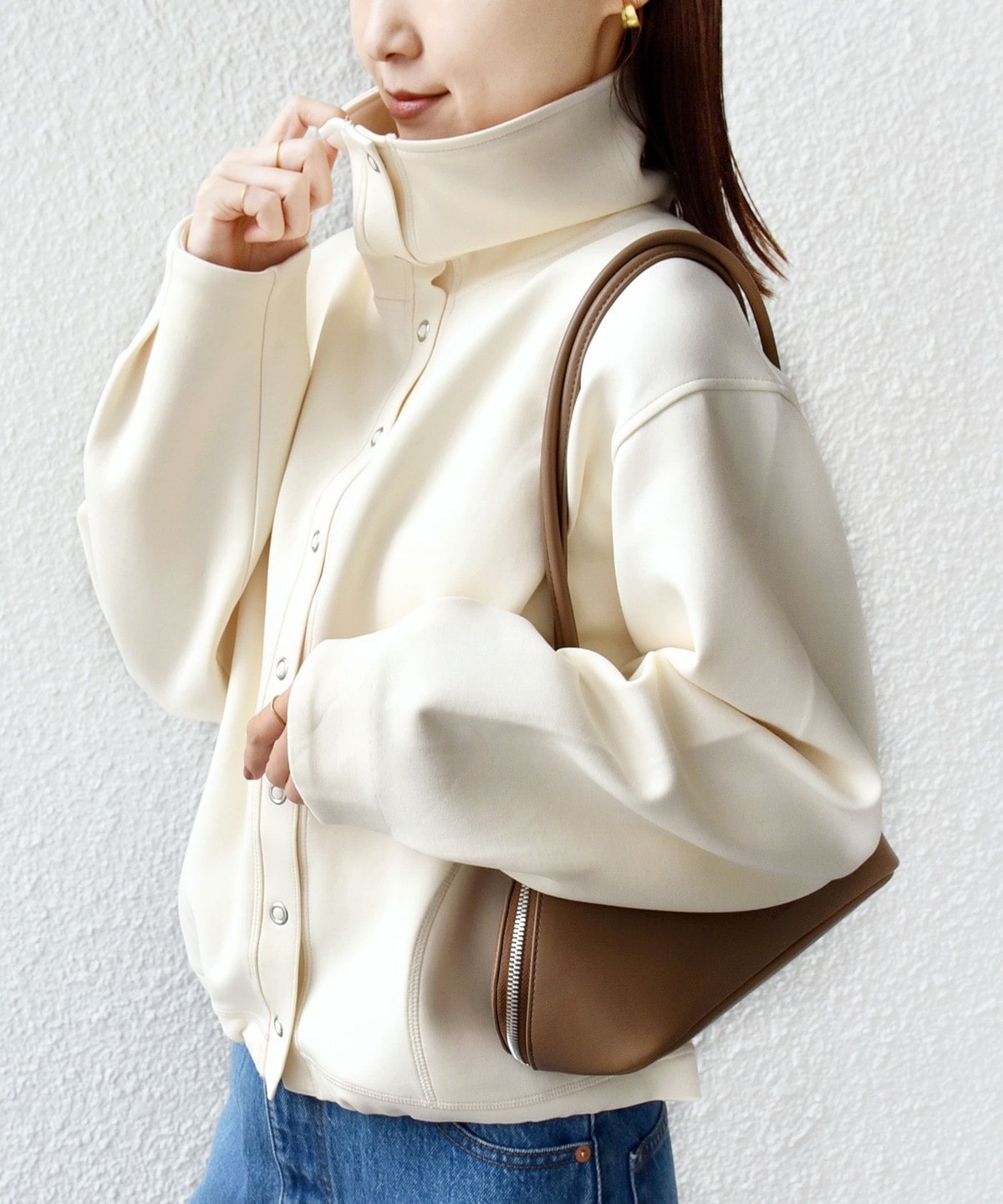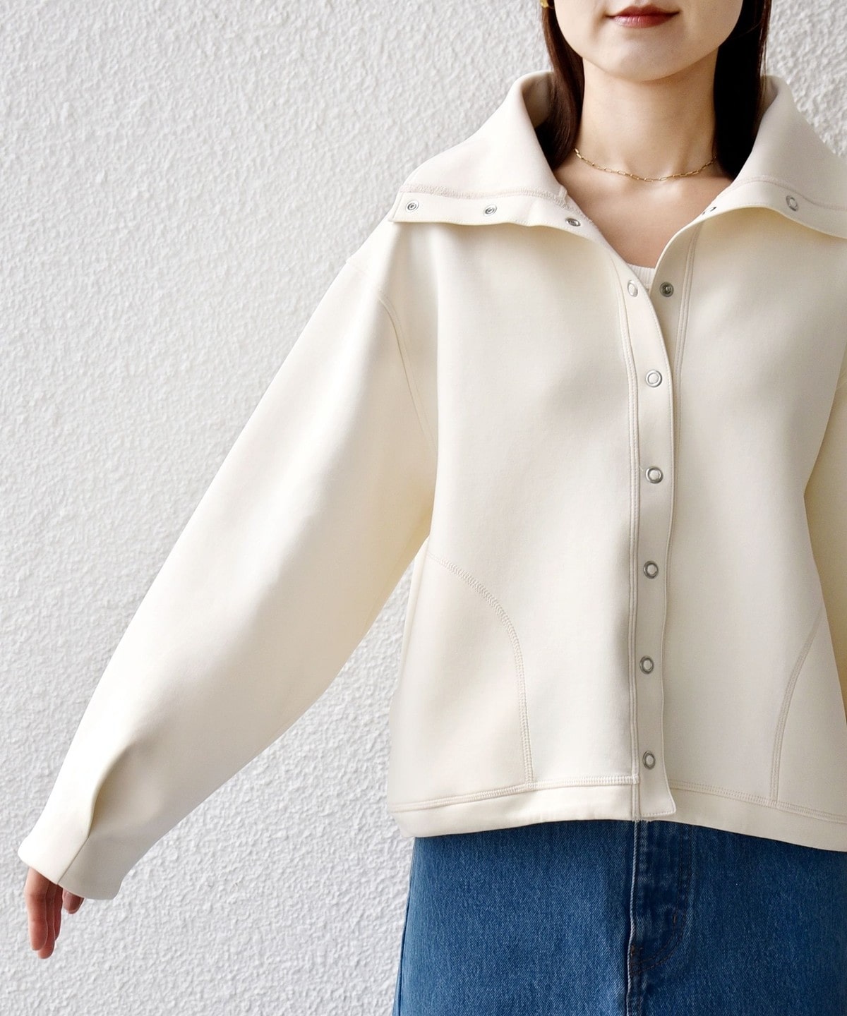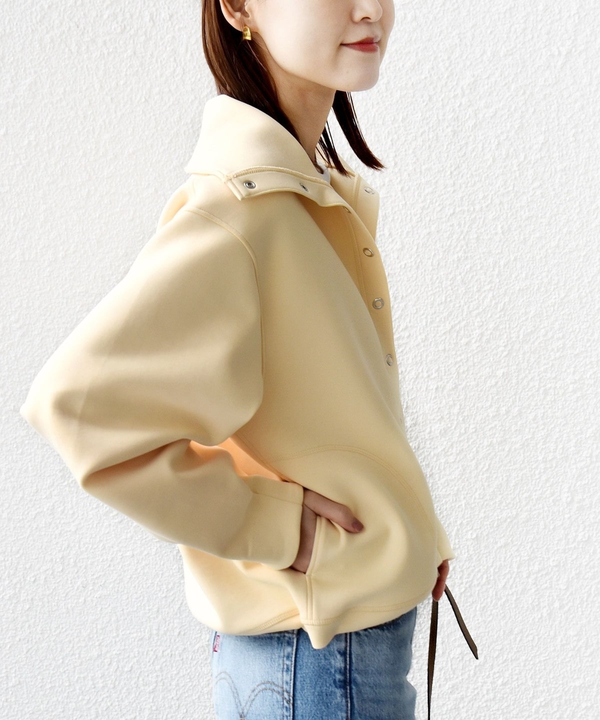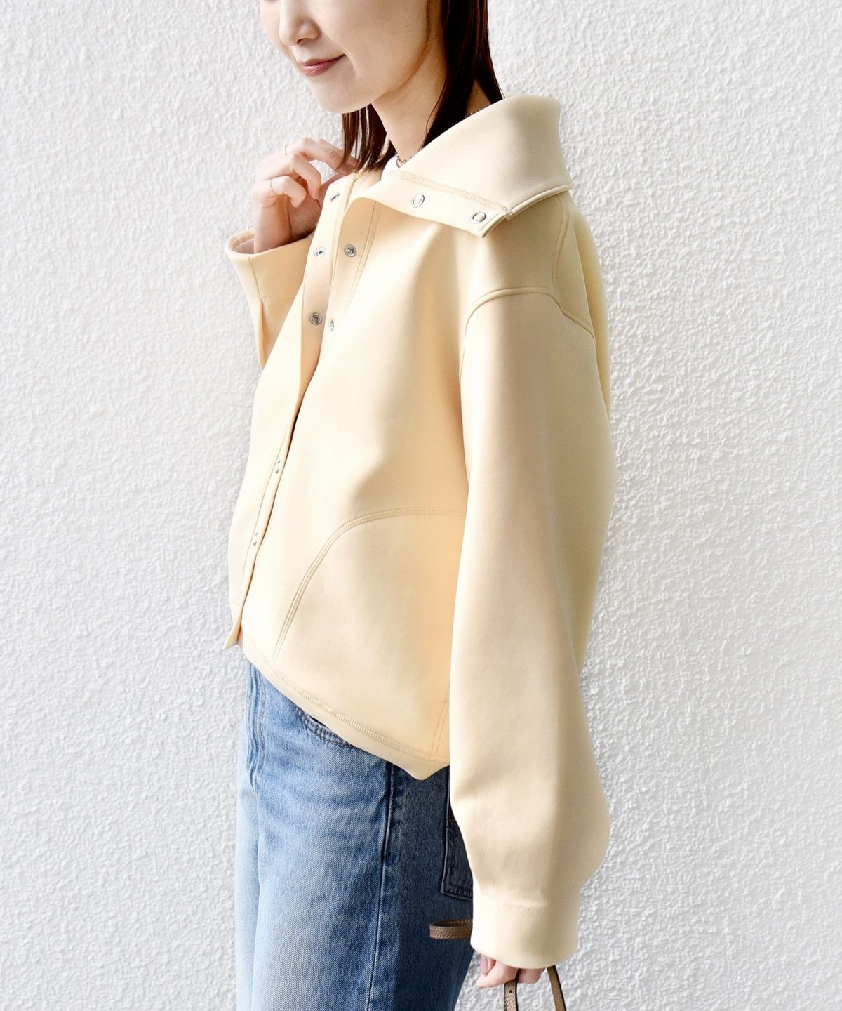 ネックアレンジを楽しめるデザインで、襟を大きく開けてインナーを覗かせたレイヤードスタイルやハイネックとしての着用など、幅広くアレンジのきく襟のデザインが特徴です。