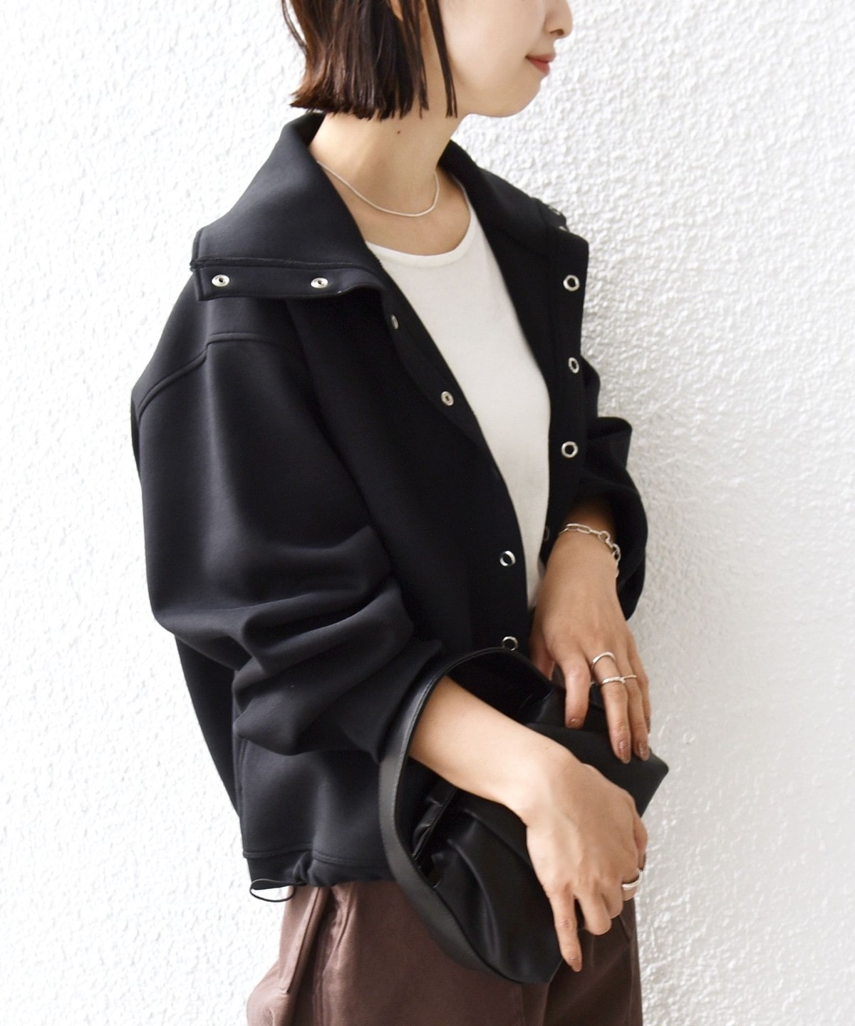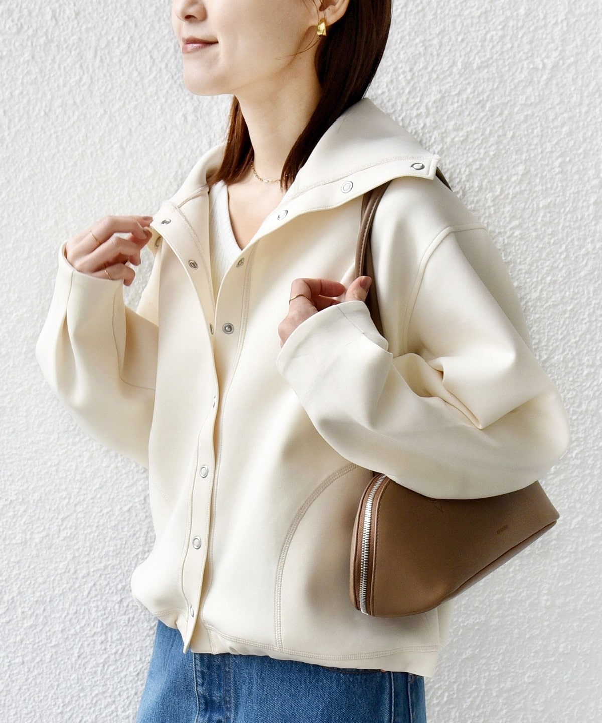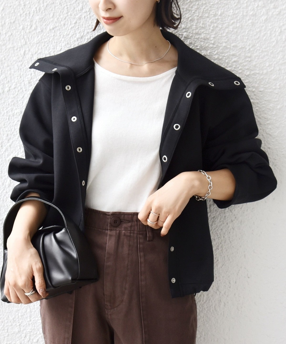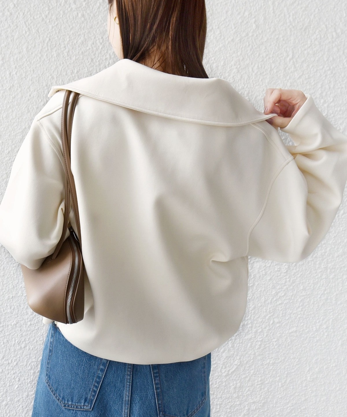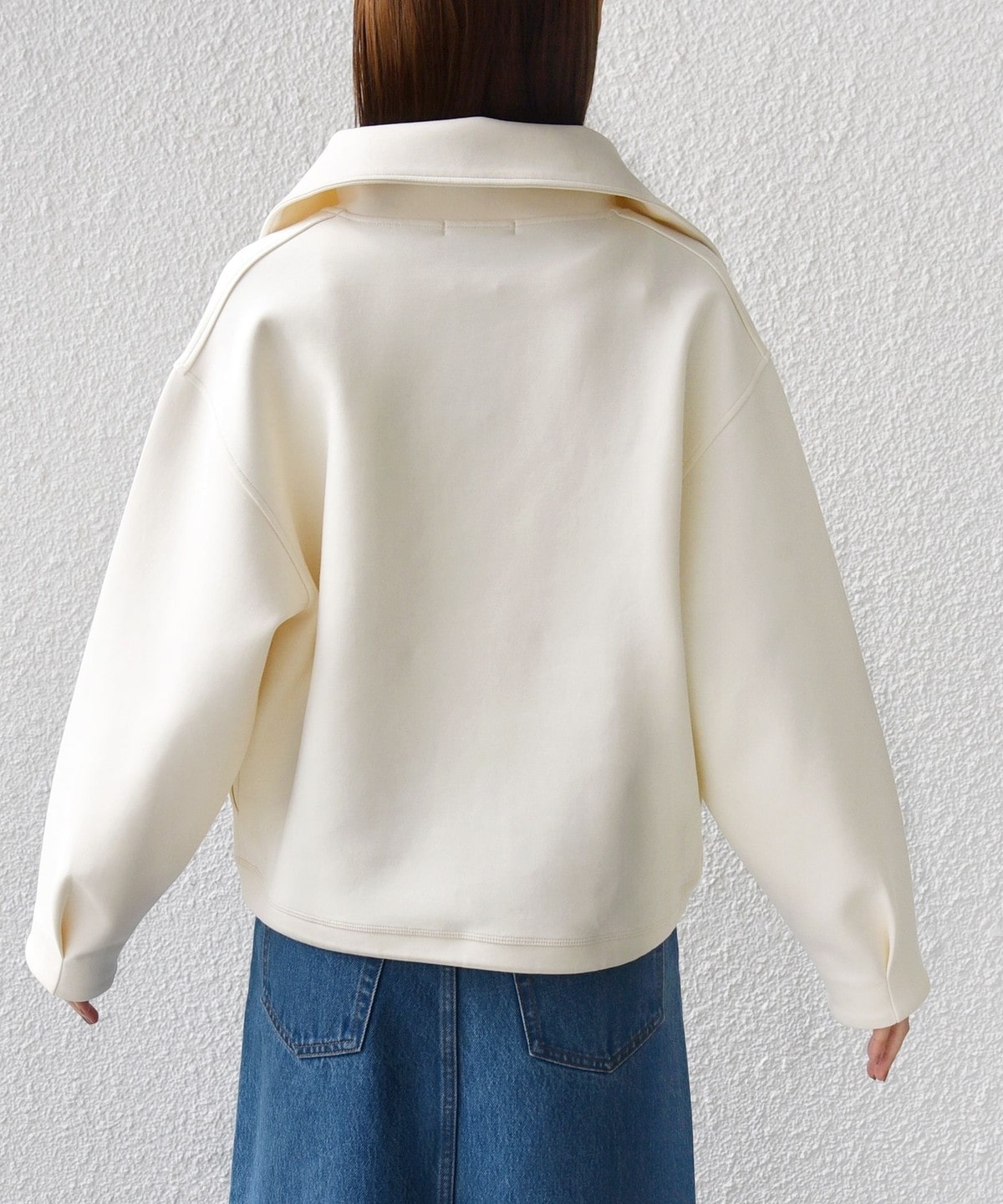 ネックアレンジを楽しめるデザインで、襟を大きく開けてインナーを覗かせたレイヤードスタイルやハイネックとしての着用など、幅広くアレンジのきく襟のデザインが特徴です。
