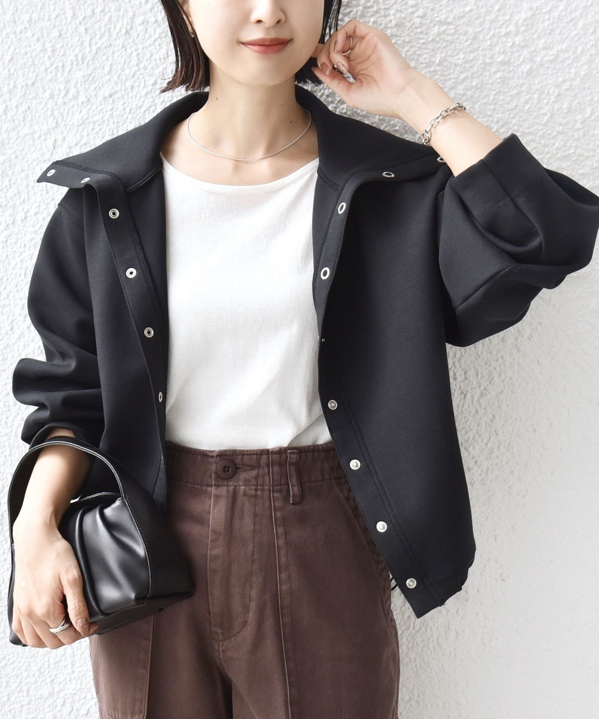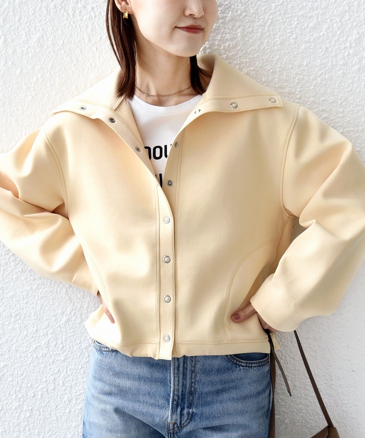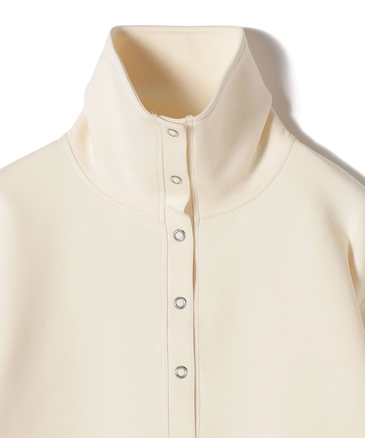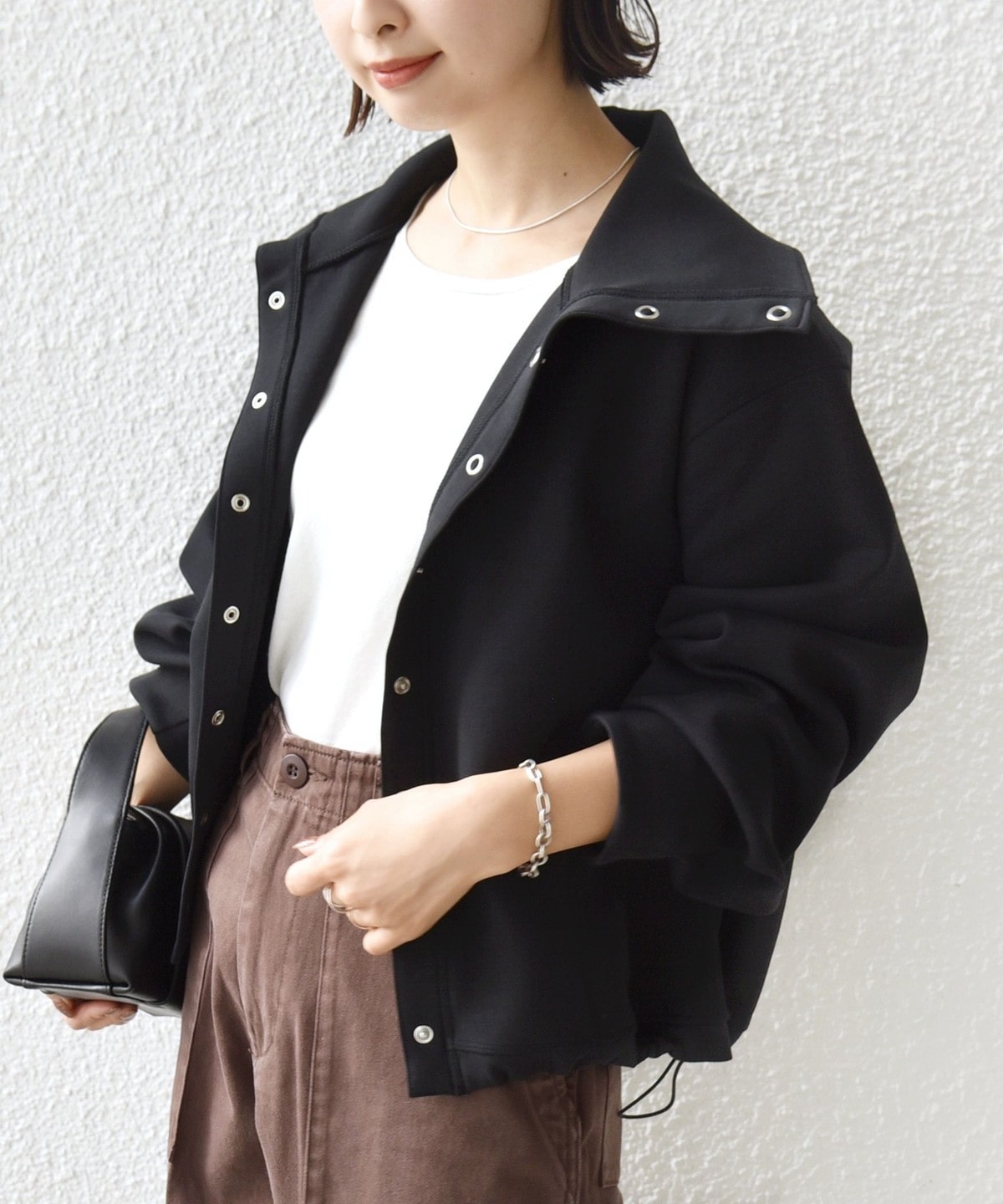 ネックアレンジを楽しめるデザインで、襟を大きく開けてインナーを覗かせたレイヤードスタイルやハイネックとしての着用など、幅広くアレンジのきく襟のデザインが特徴です。