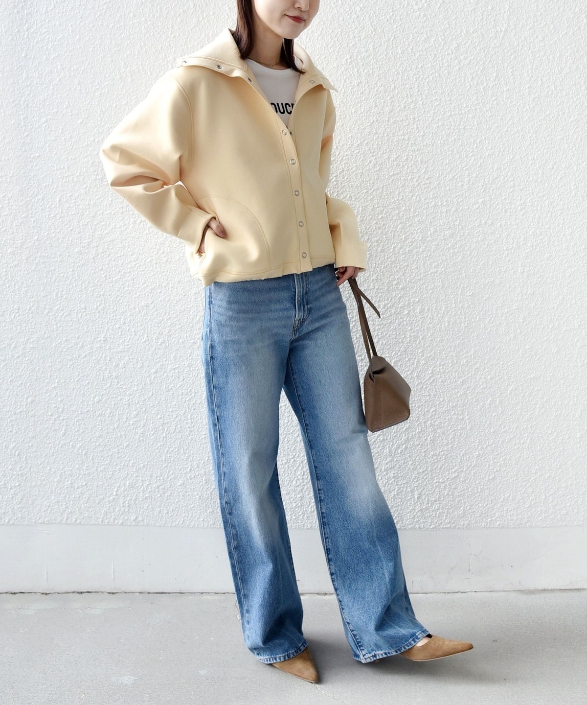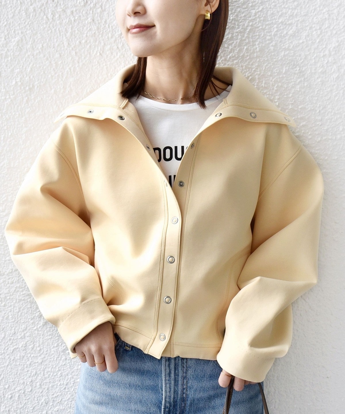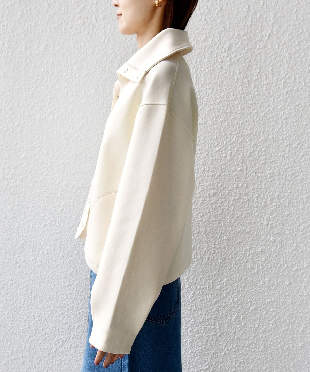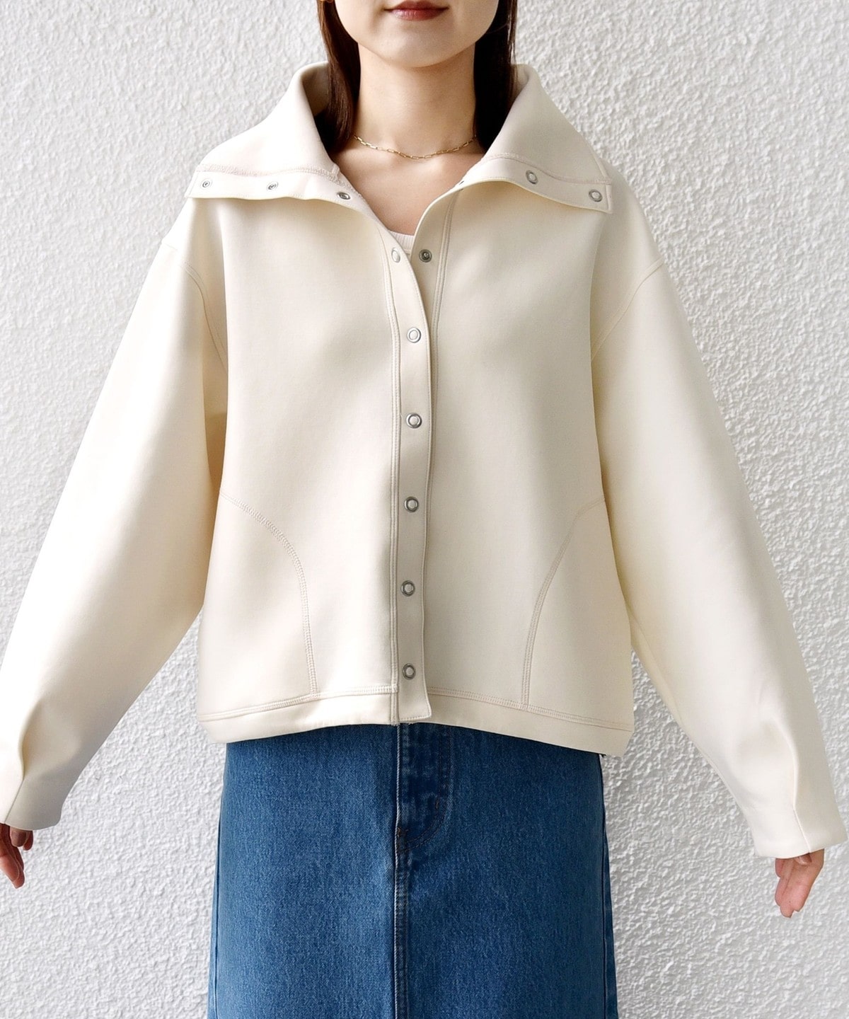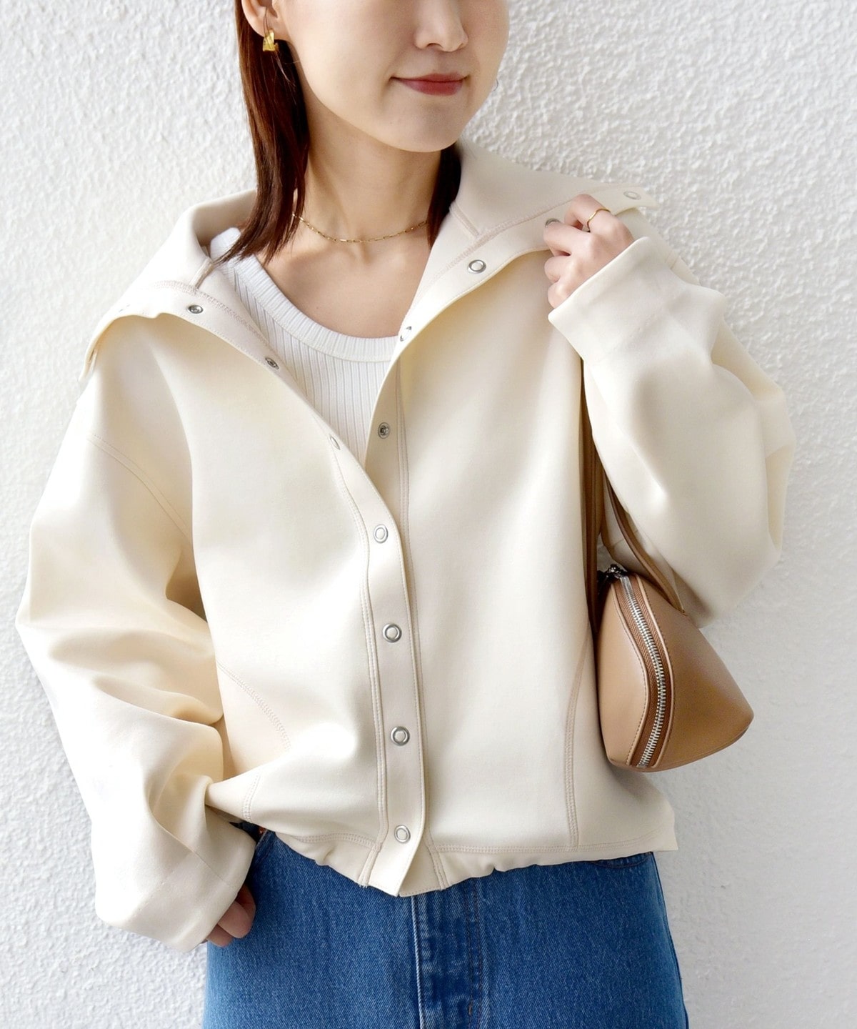 ネックアレンジを楽しめるデザインで、襟を大きく開けてインナーを覗かせたレイヤードスタイルやハイネックとしての着用など、幅広くアレンジのきく襟のデザインが特徴です。