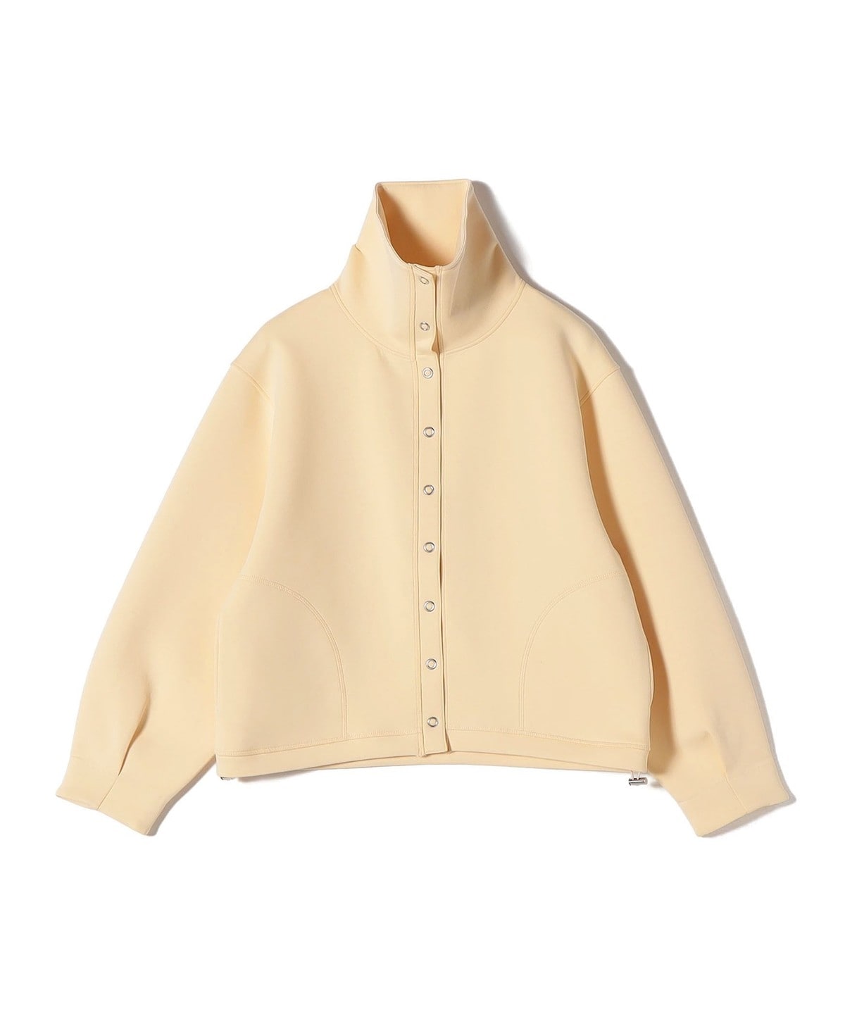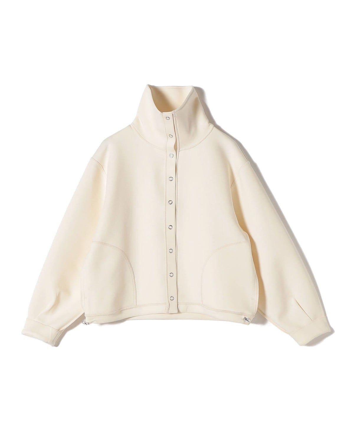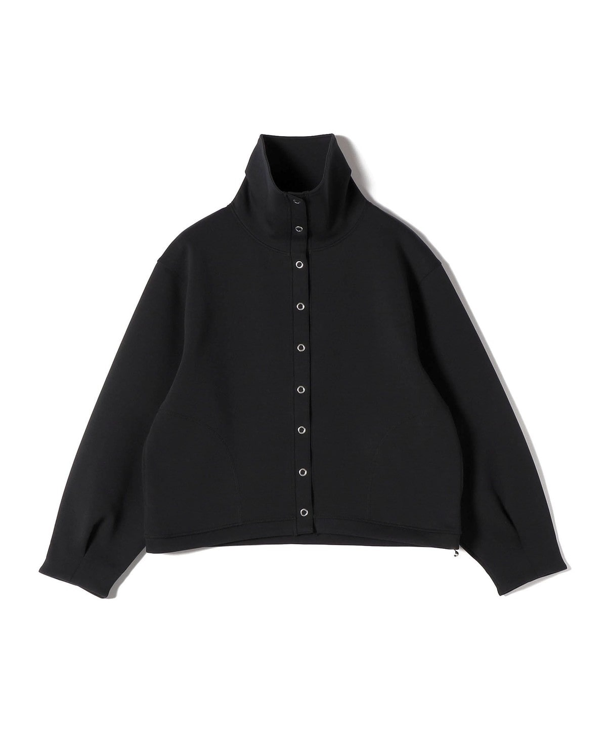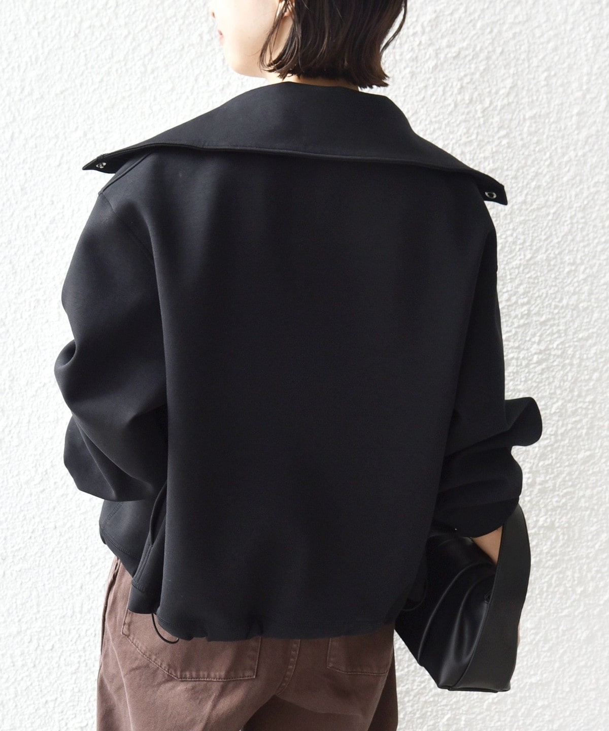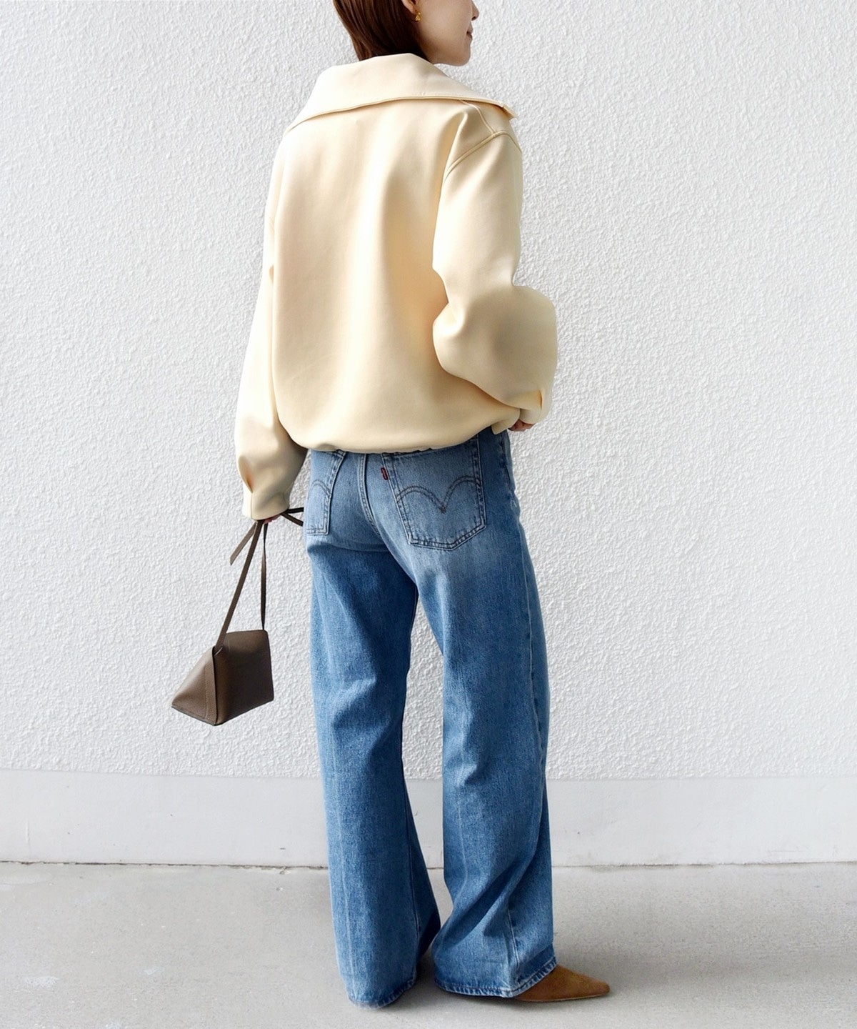 ネックアレンジを楽しめるデザインで、襟を大きく開けてインナーを覗かせたレイヤードスタイルやハイネックとしての着用など、幅広くアレンジのきく襟のデザインが特徴です。