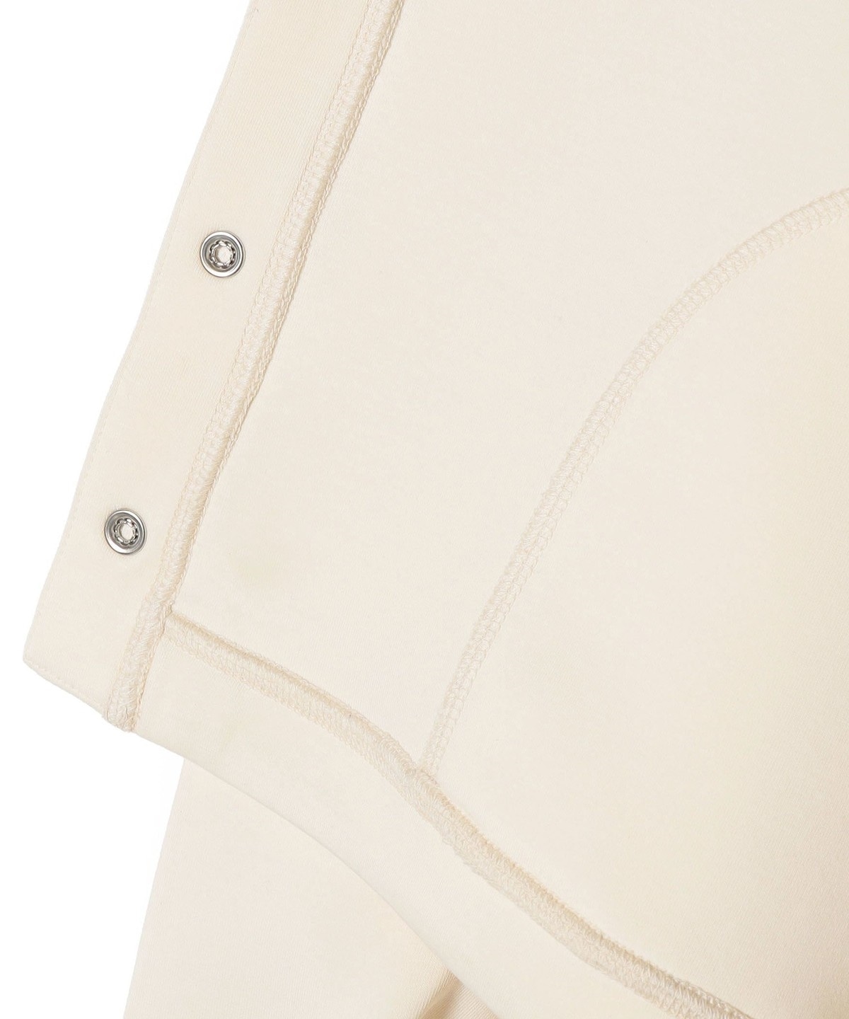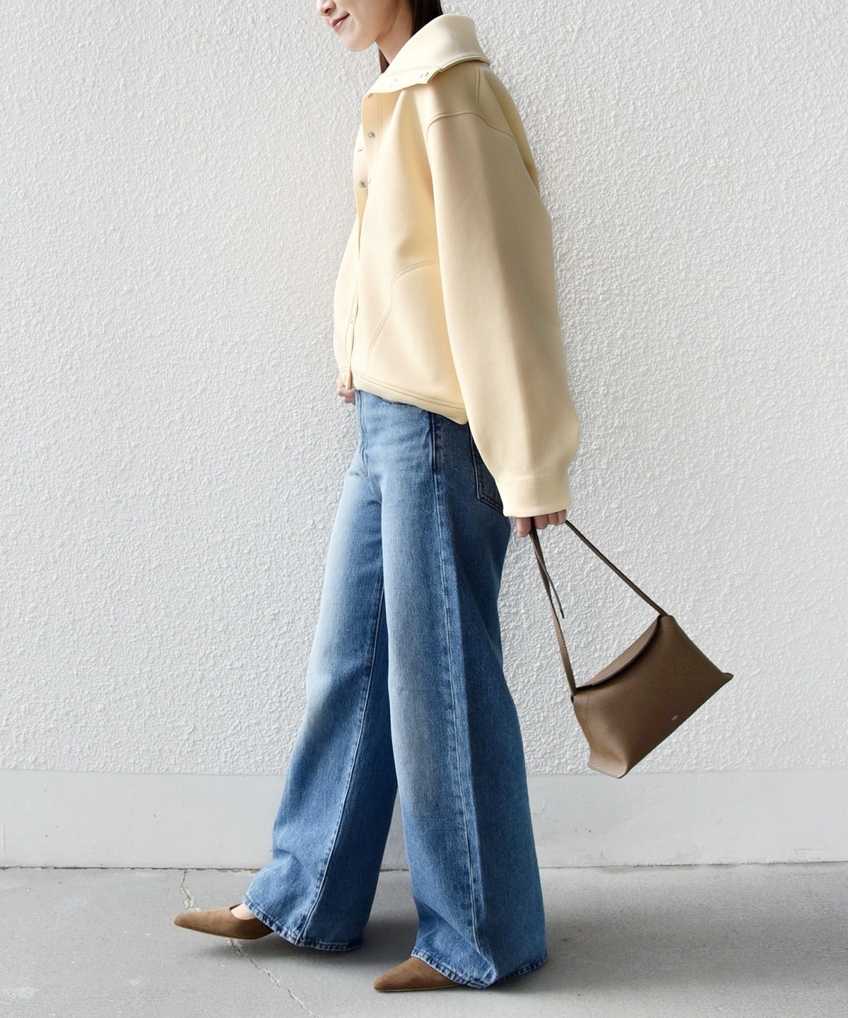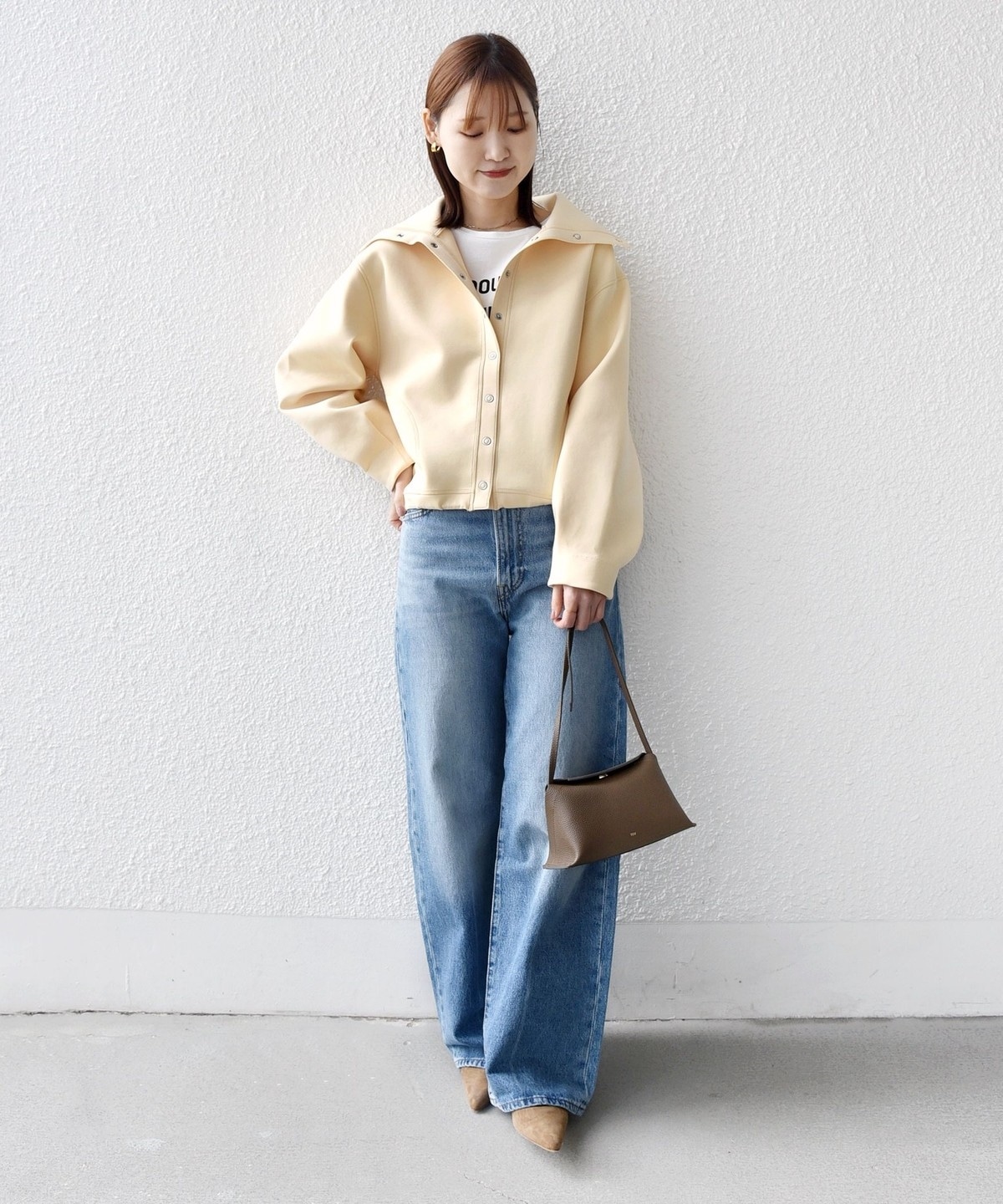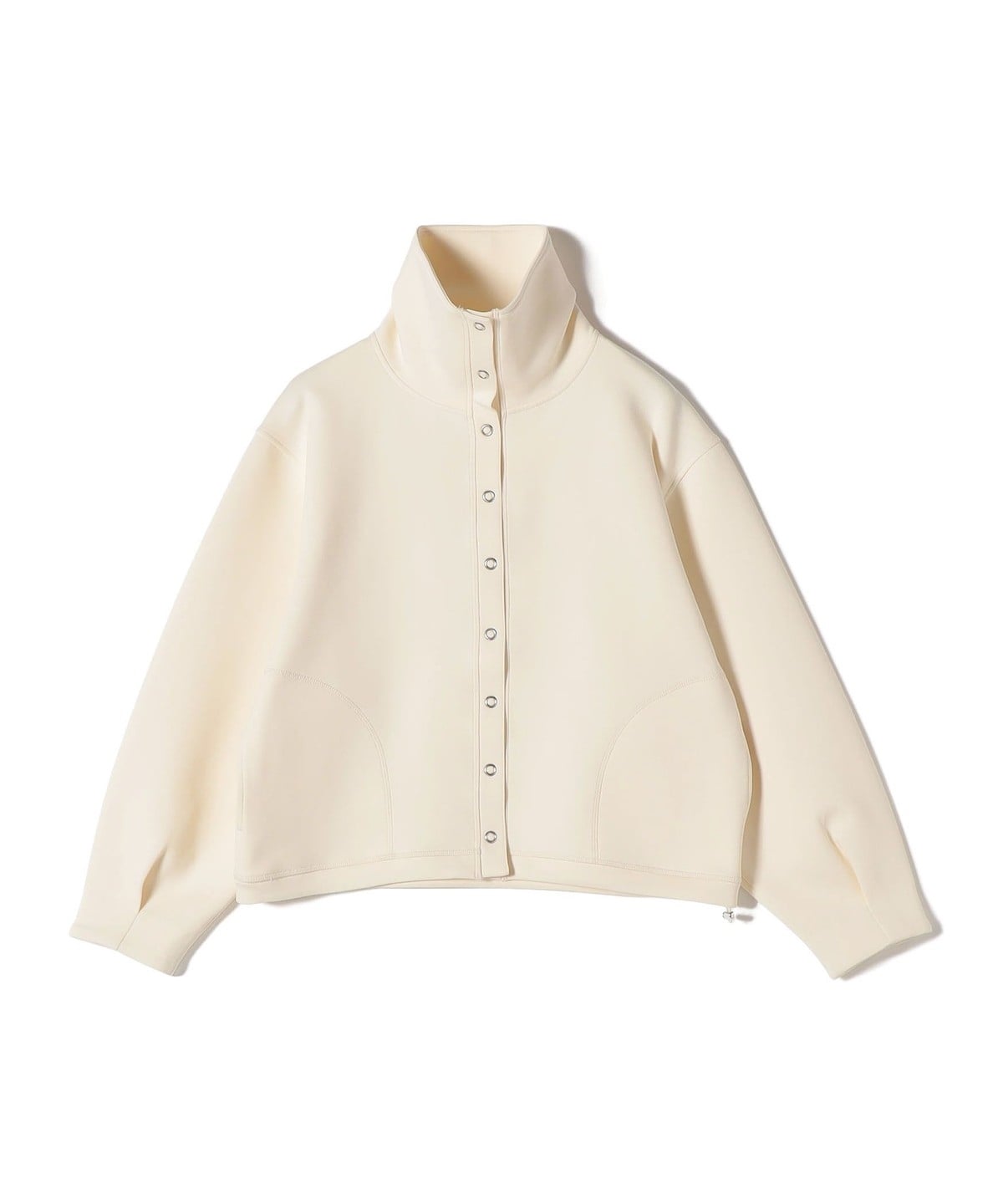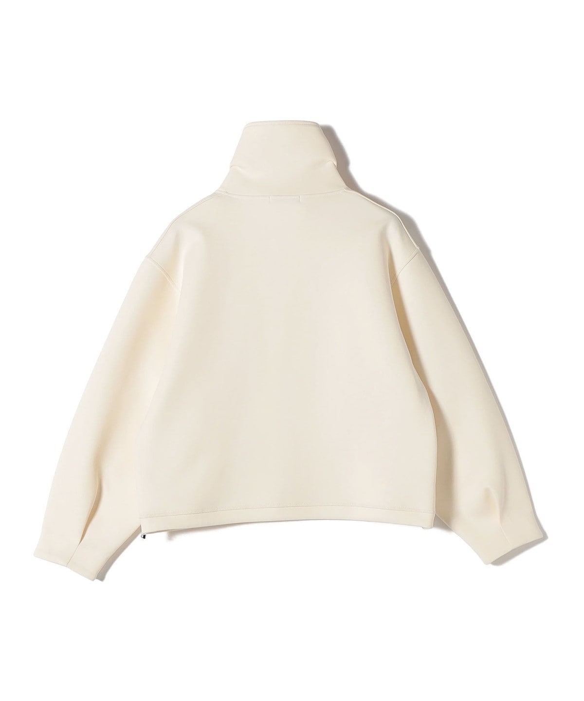 ネックアレンジを楽しめるデザインで、襟を大きく開けてインナーを覗かせたレイヤードスタイルやハイネックとしての着用など、幅広くアレンジのきく襟のデザインが特徴です。