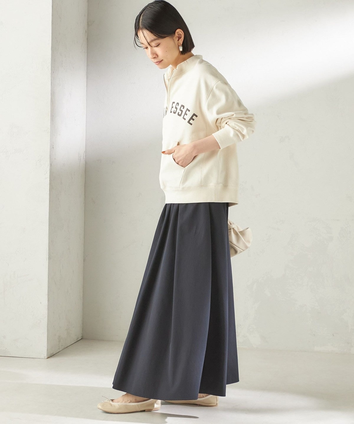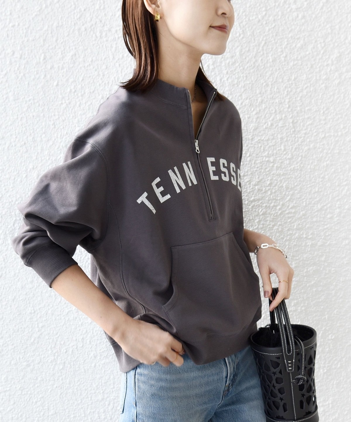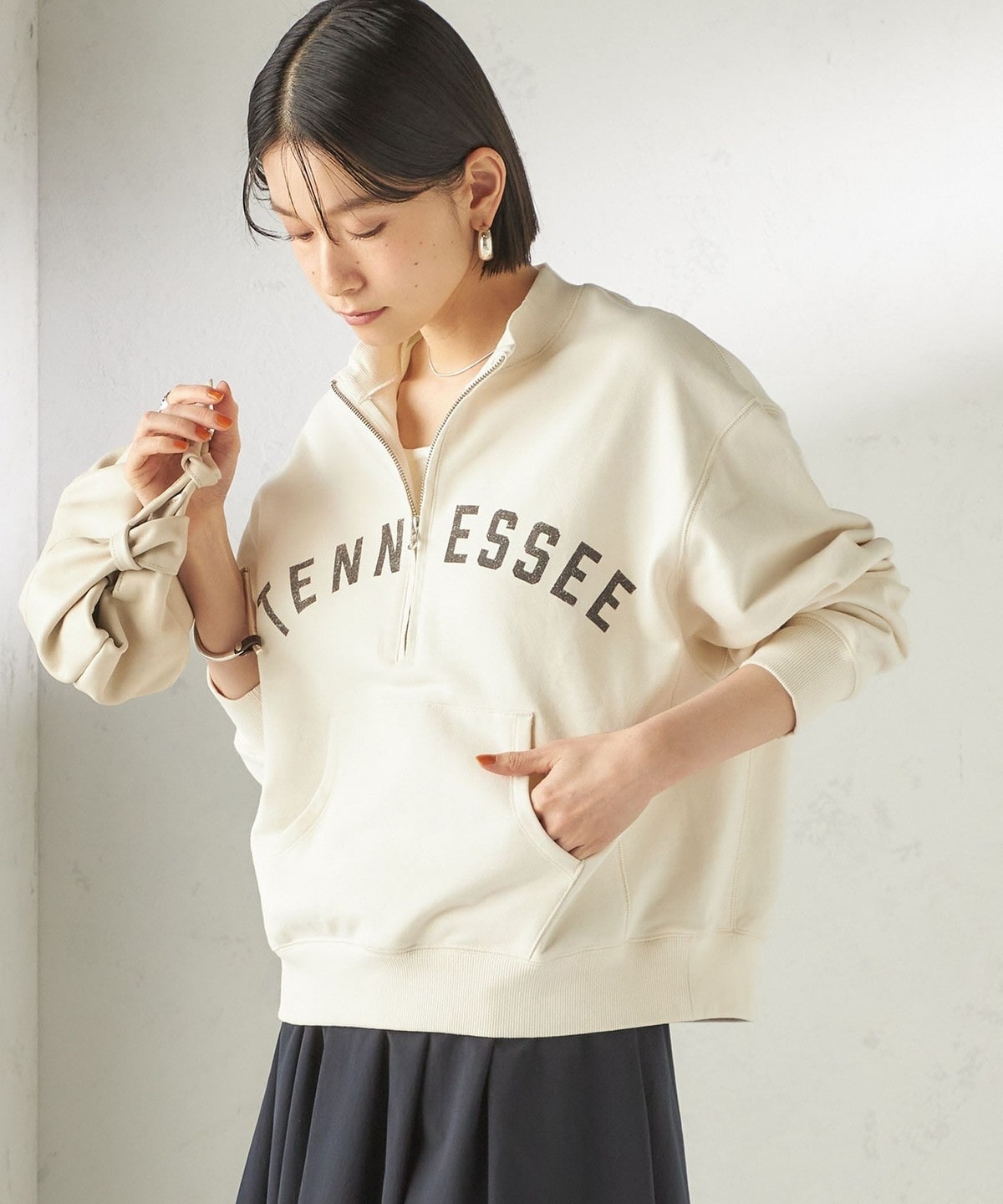 深めに開くハーフジップデザインで、インナー次第で旬のレイヤードスタイルを楽しめます。