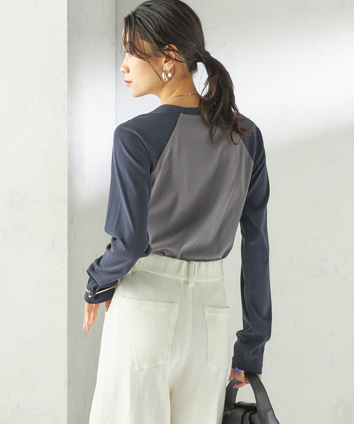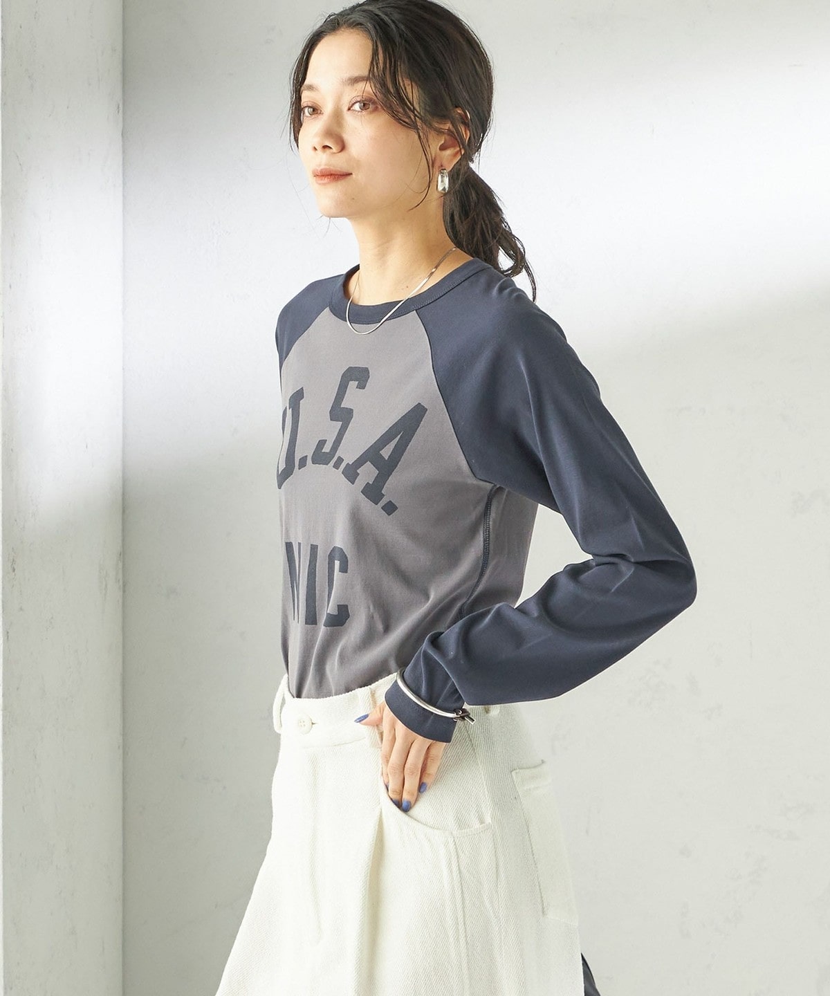 シアー感のある長袖のラグランTシャツ。