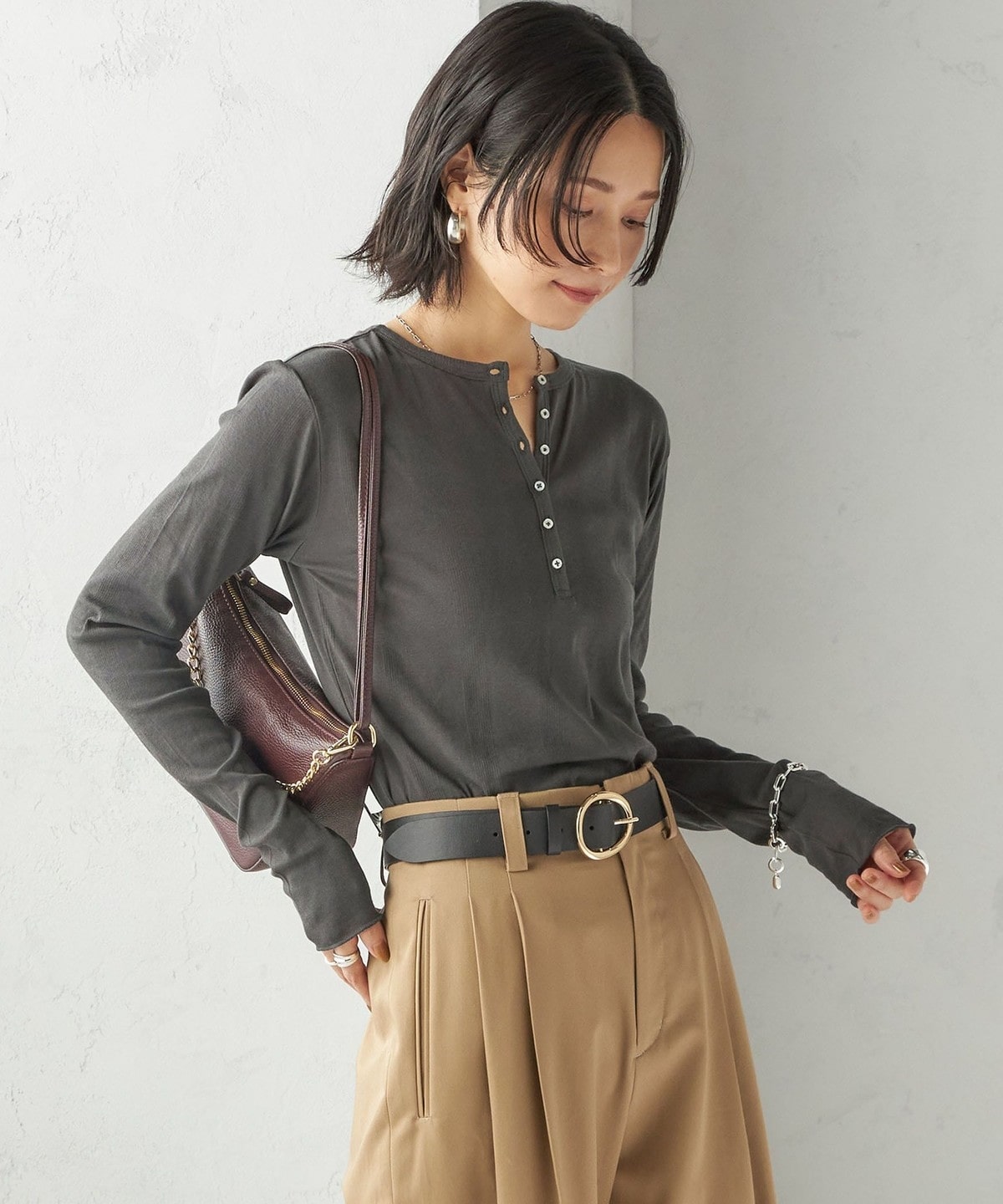3. 《一部追加予約》【SHIPS別注】miller: シアー ヘンリー ネック ロング スリーブ TEE ダークグレー