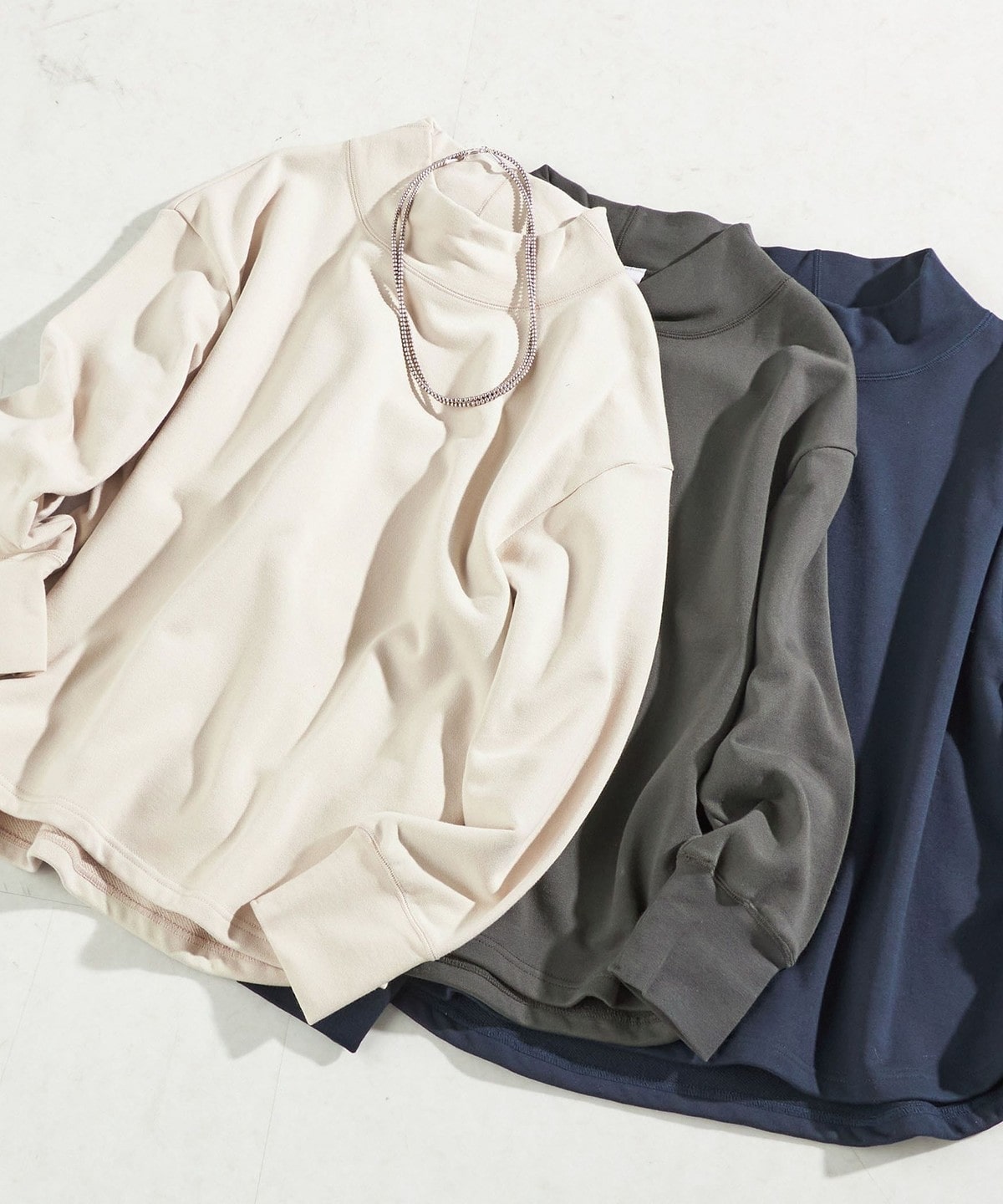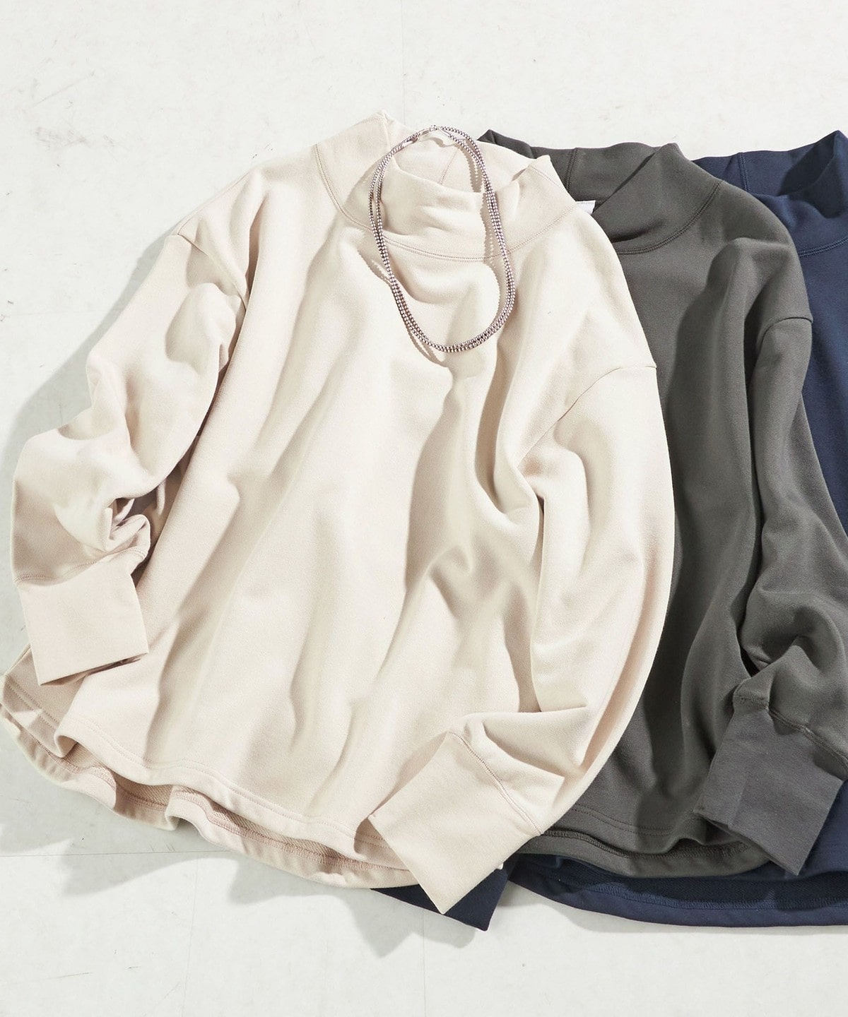 少しゆとりのある高めのオフタートル衿と裾ラウンドデザインでシンプルながらもニュアンス感を出したアイテム。