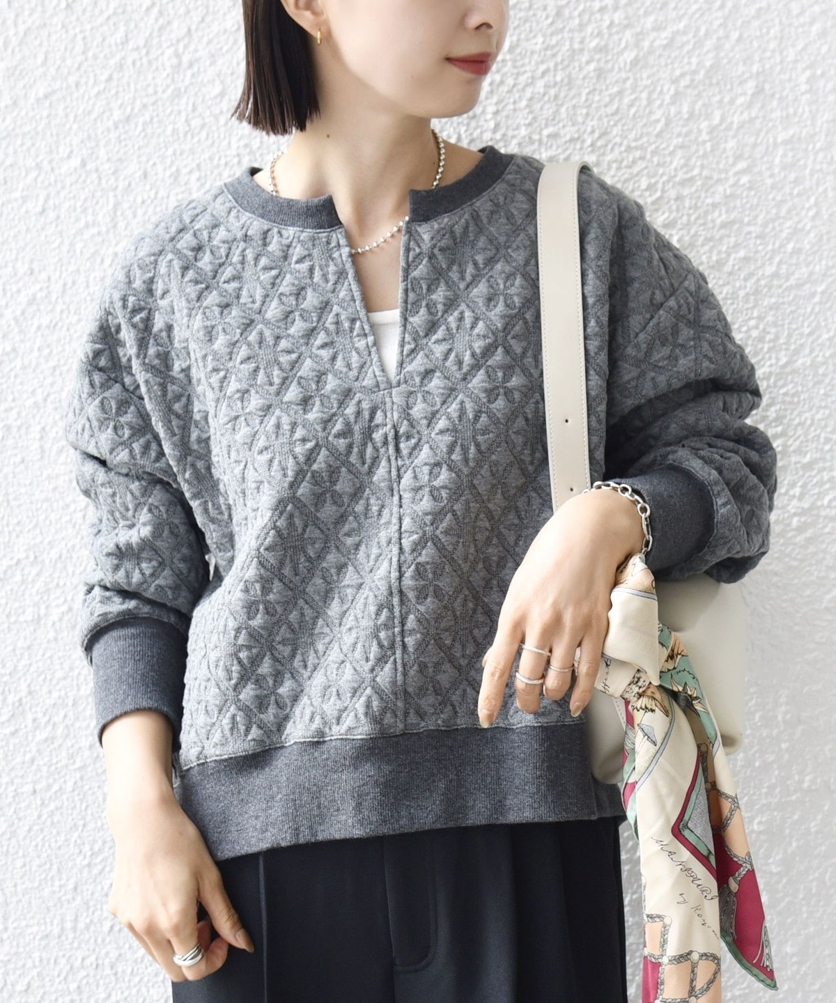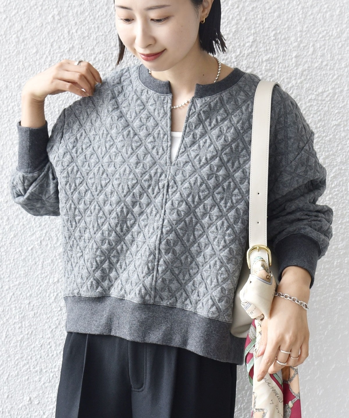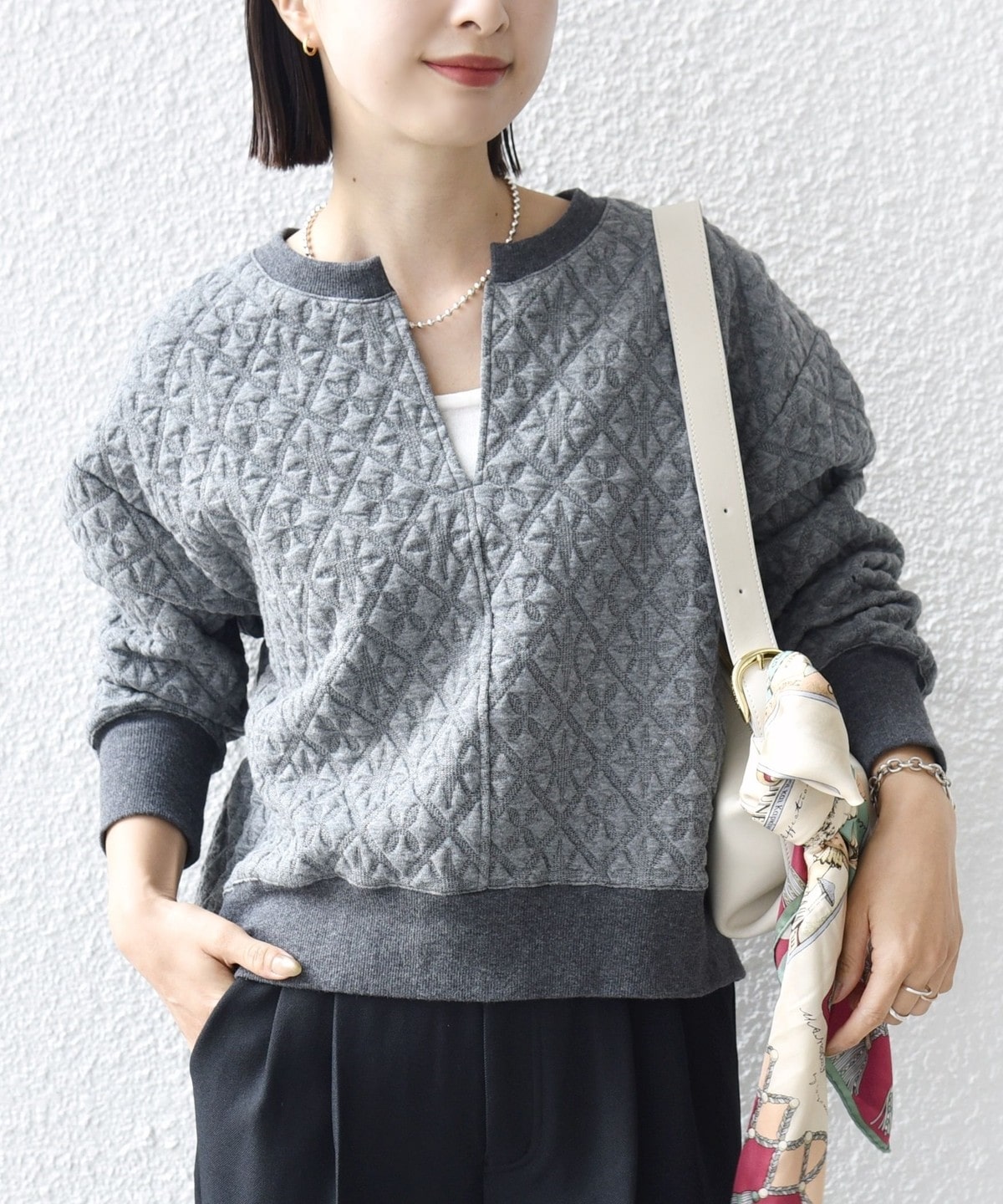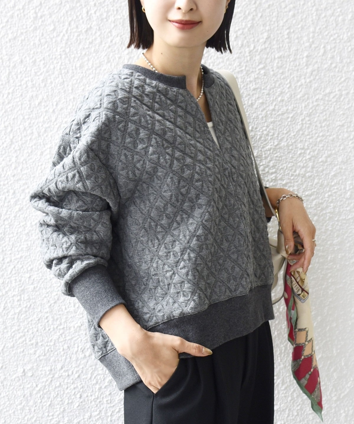 2. 【WEB限定】〈手洗い可能〉キルティング ジャカード キーネック プルオーバー グレー