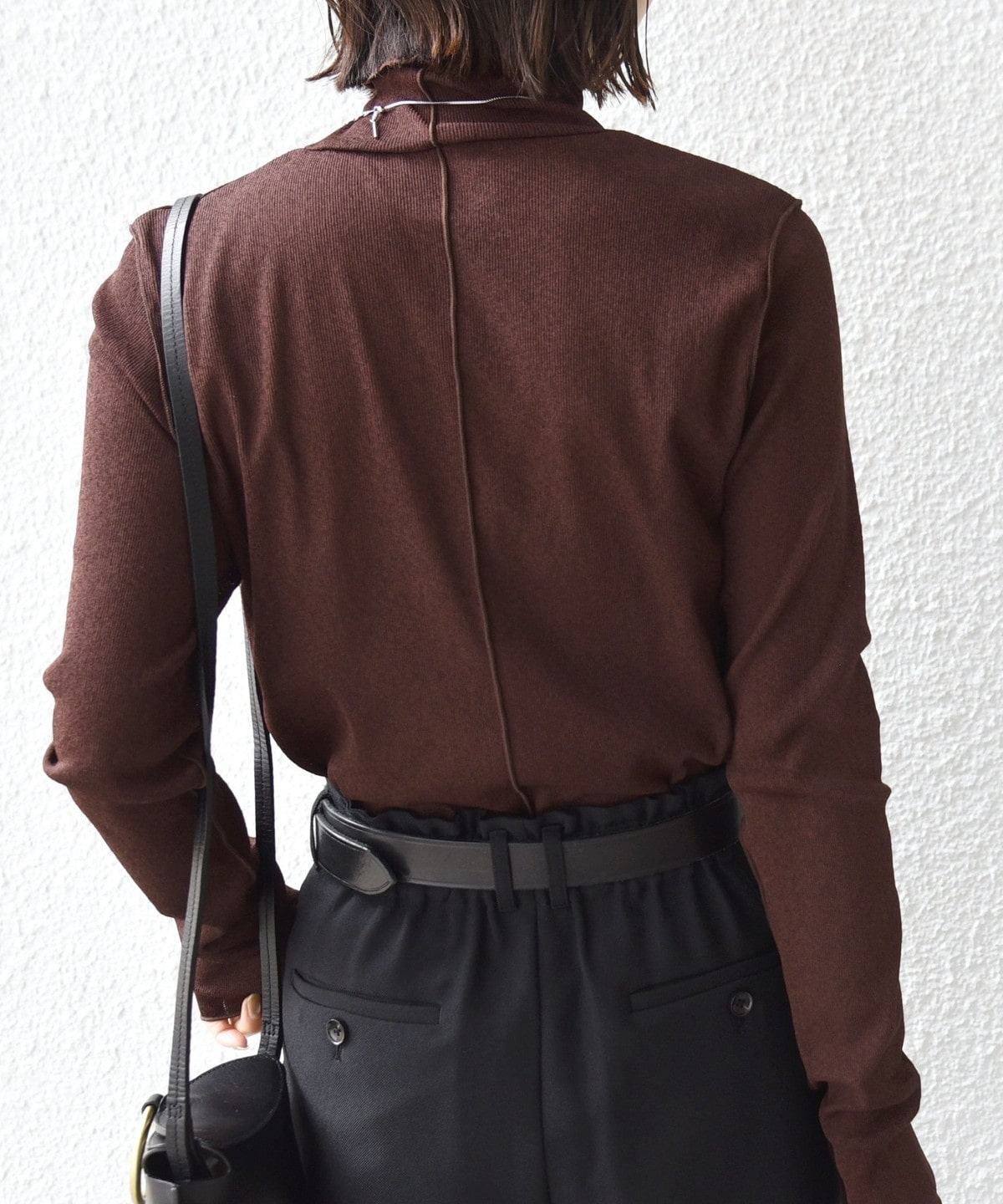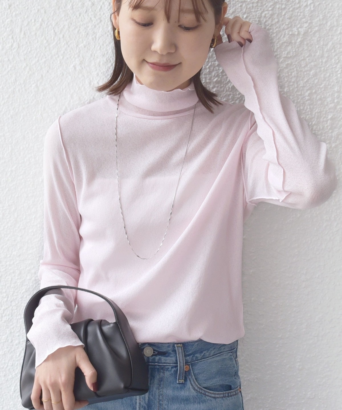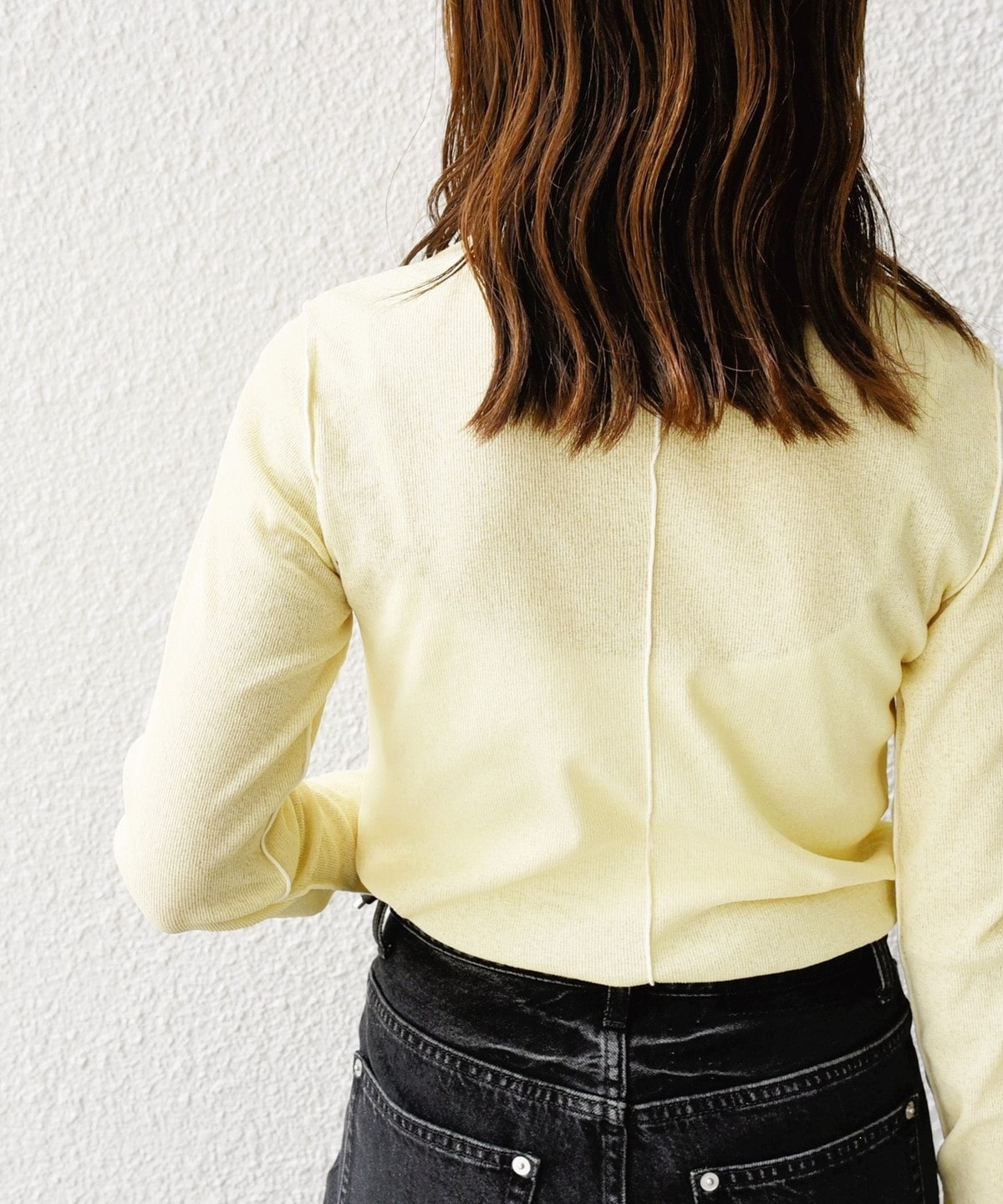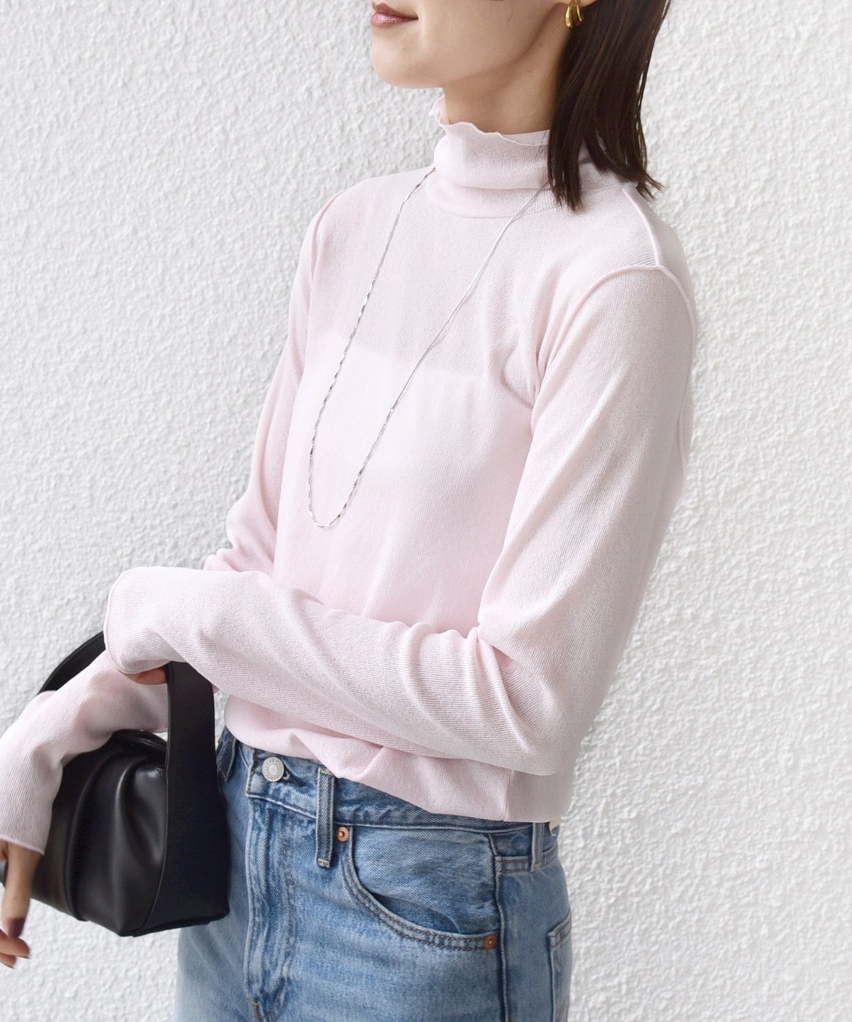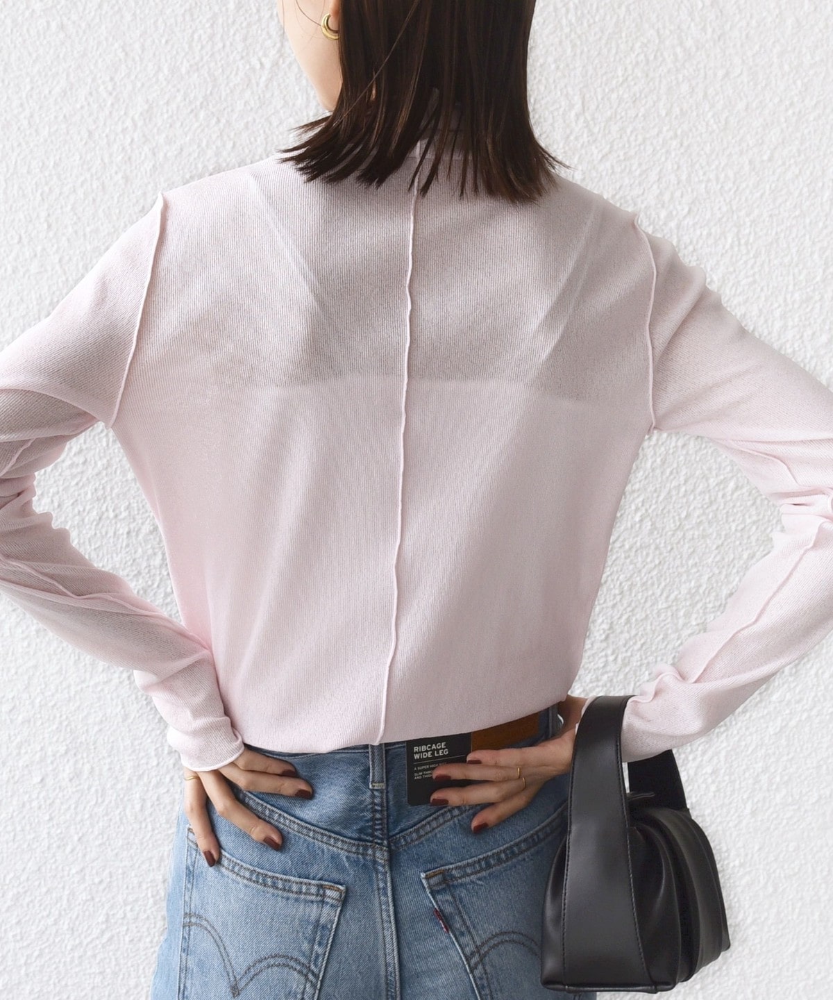 サイズ感:ボディラインを拾いすぎない程良いフィット感。着丈はヒップにかかるくらい。