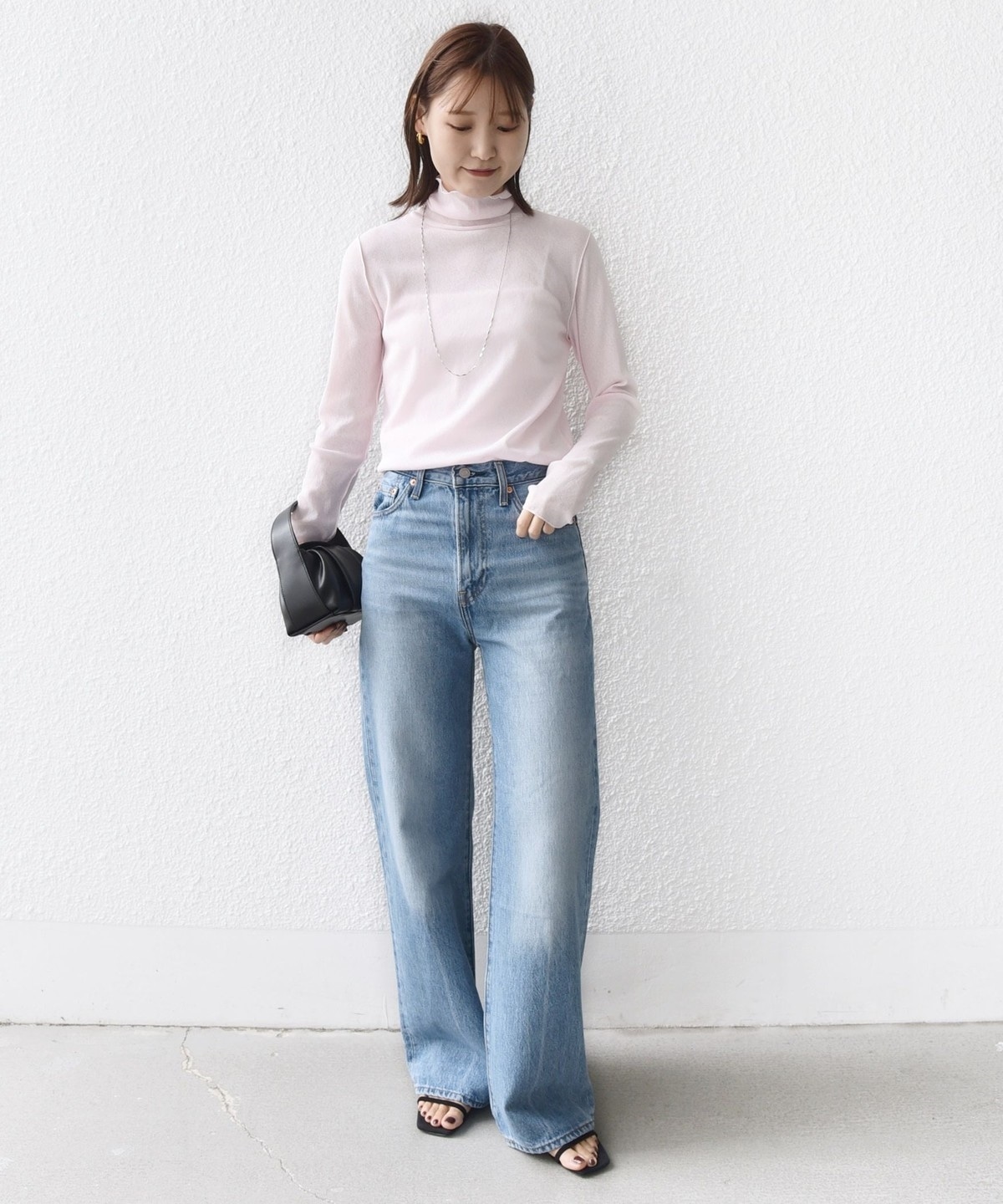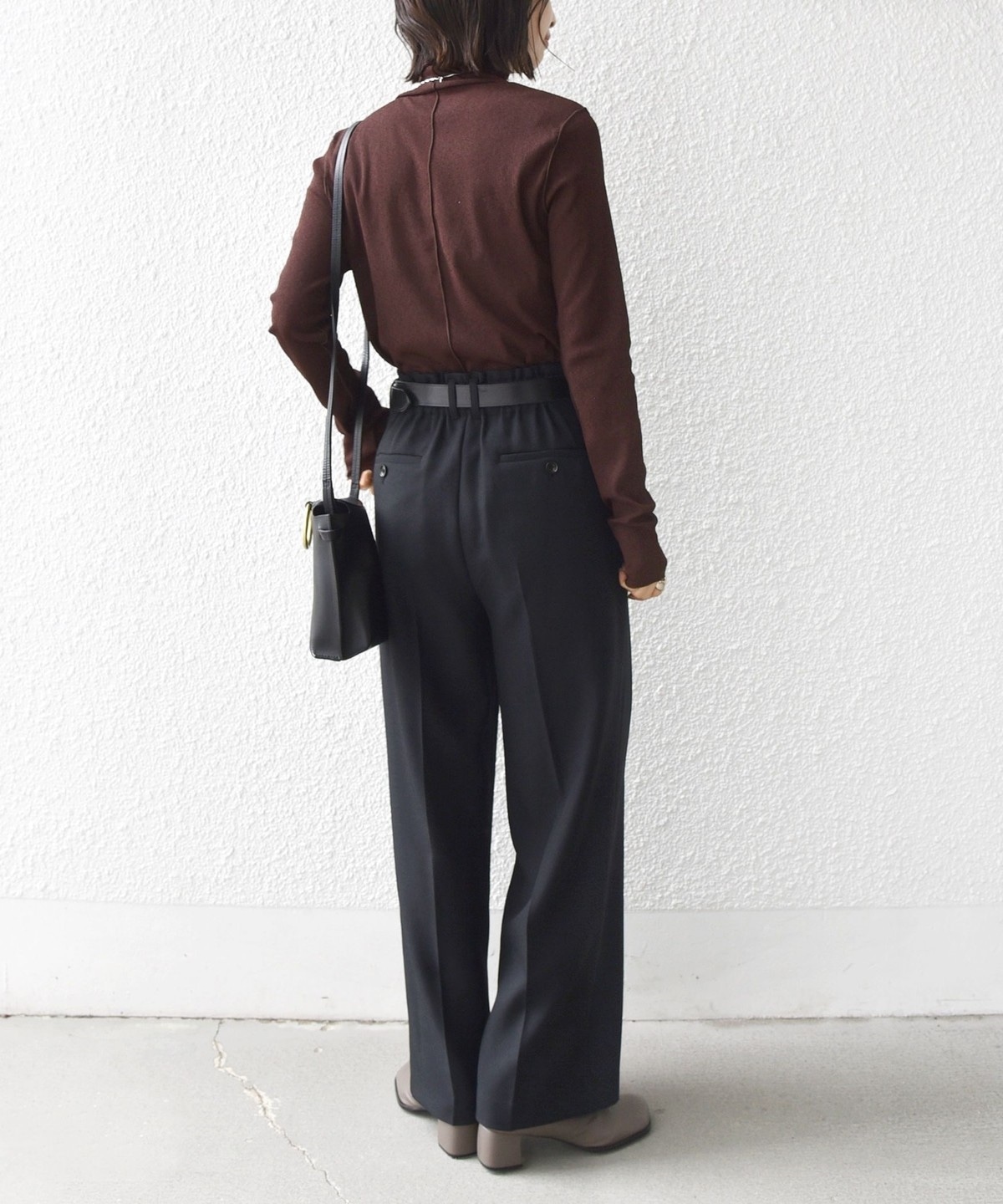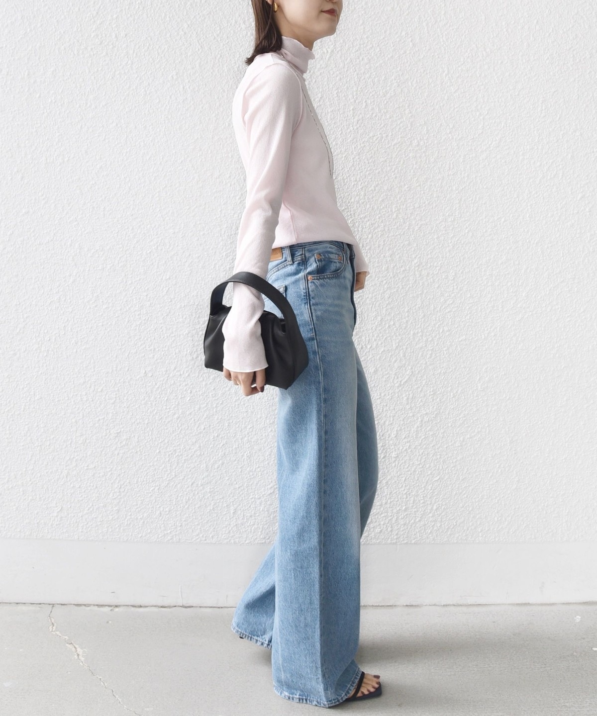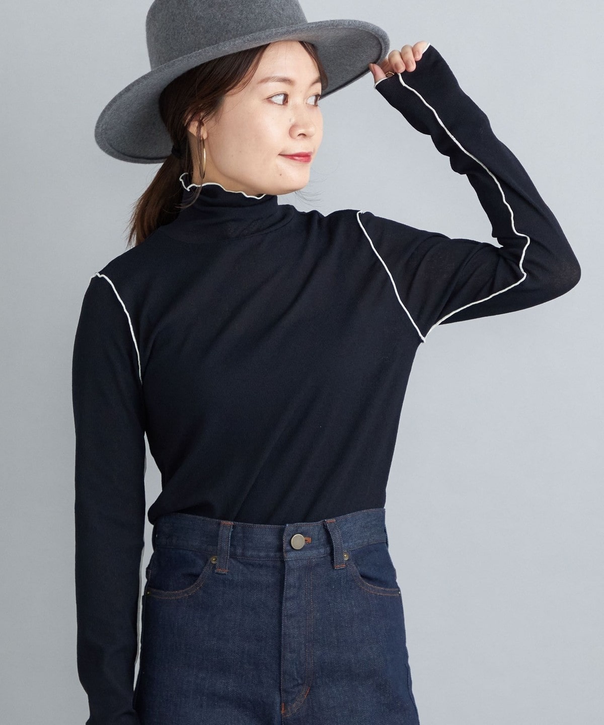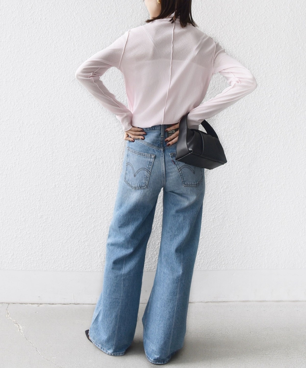 サイズ感:ボディラインを拾いすぎない程良いフィット感。着丈はヒップにかかるくらい。