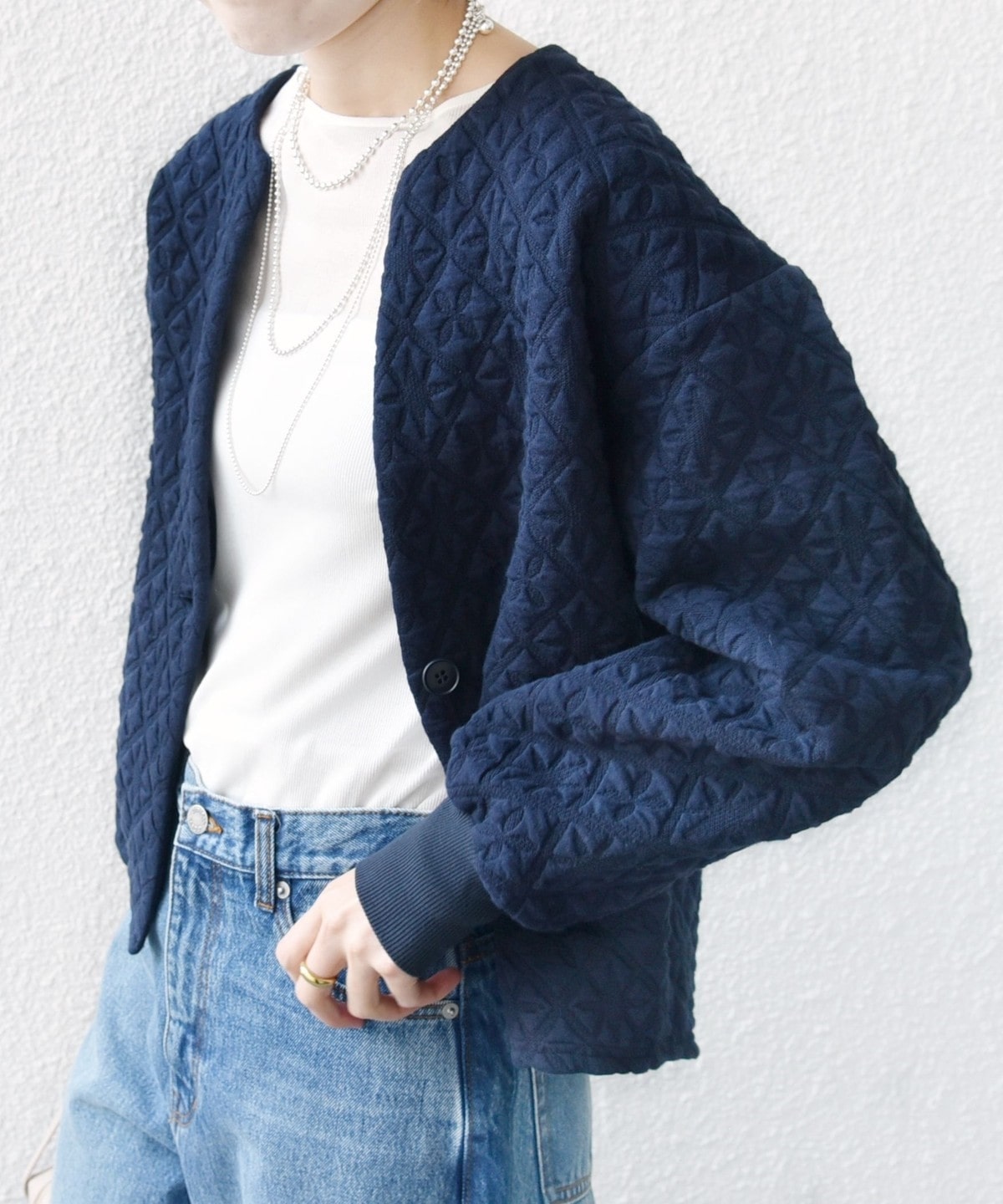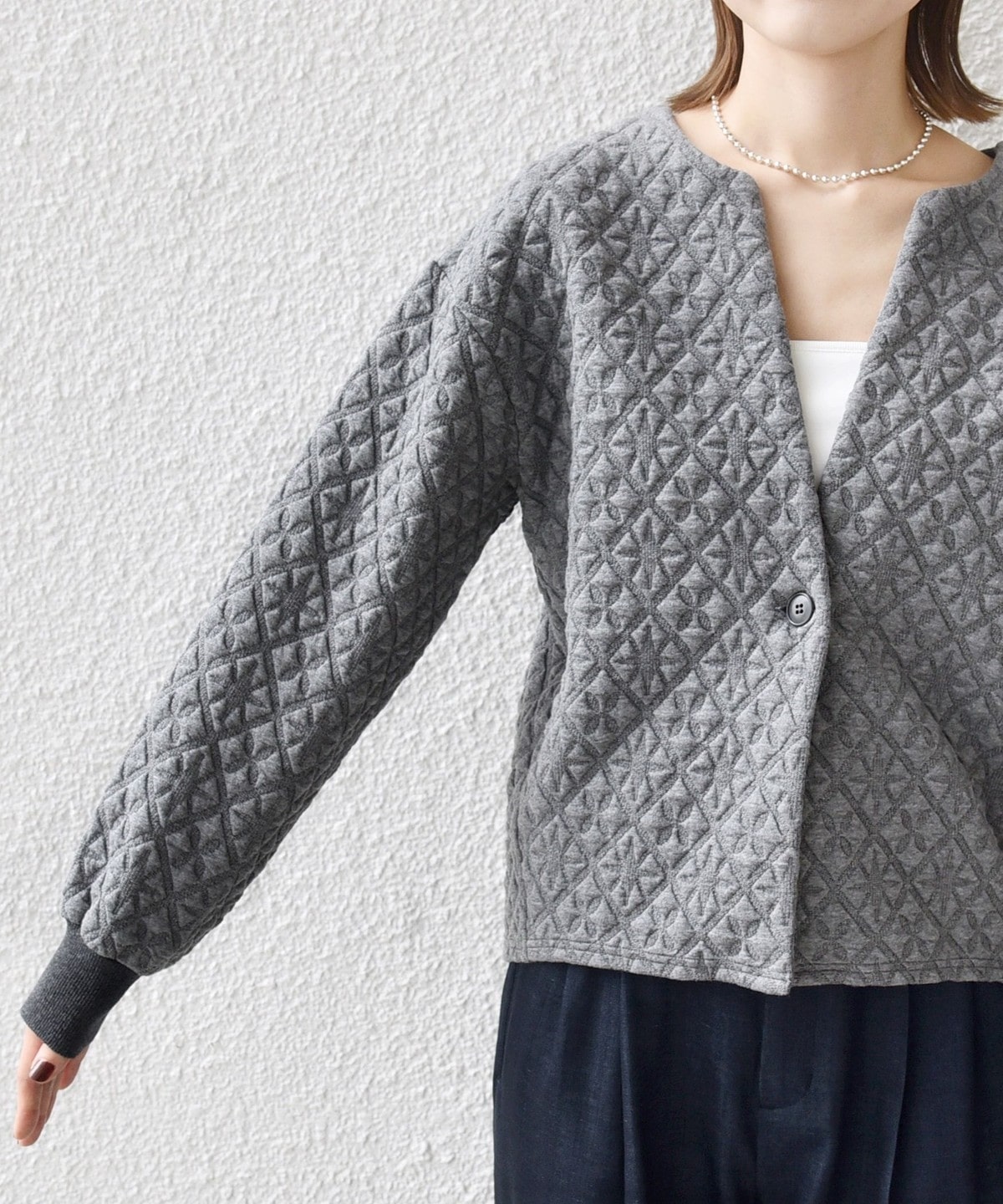 表面感のあるキルティングジャカード生地が可愛いカーディガンです。