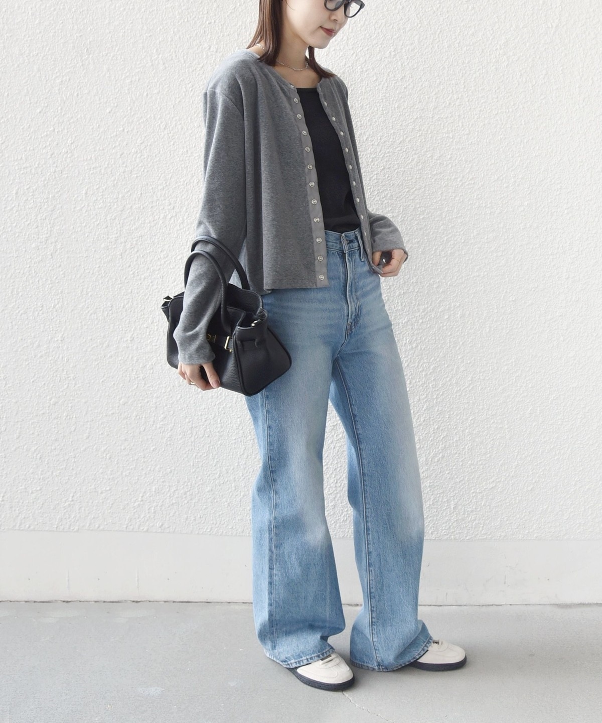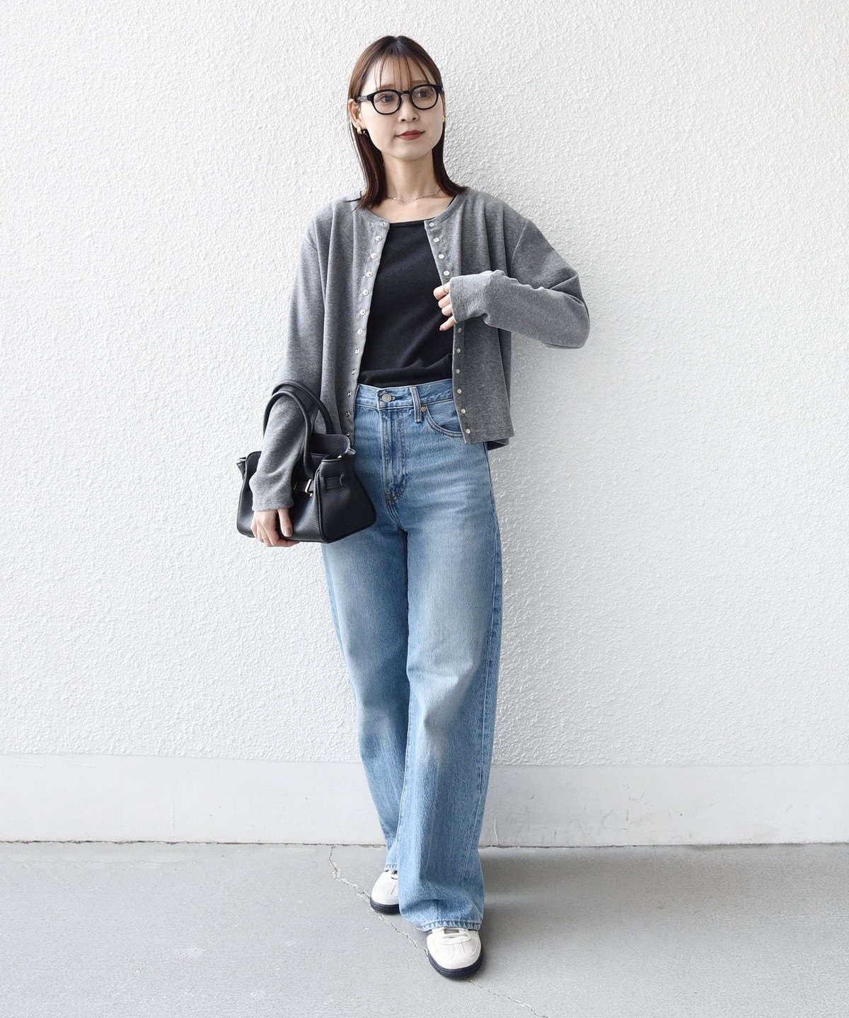 Tシャツとデニムにさらっと羽織るだけでカジュアルすぎず上品な印象にまとまります。