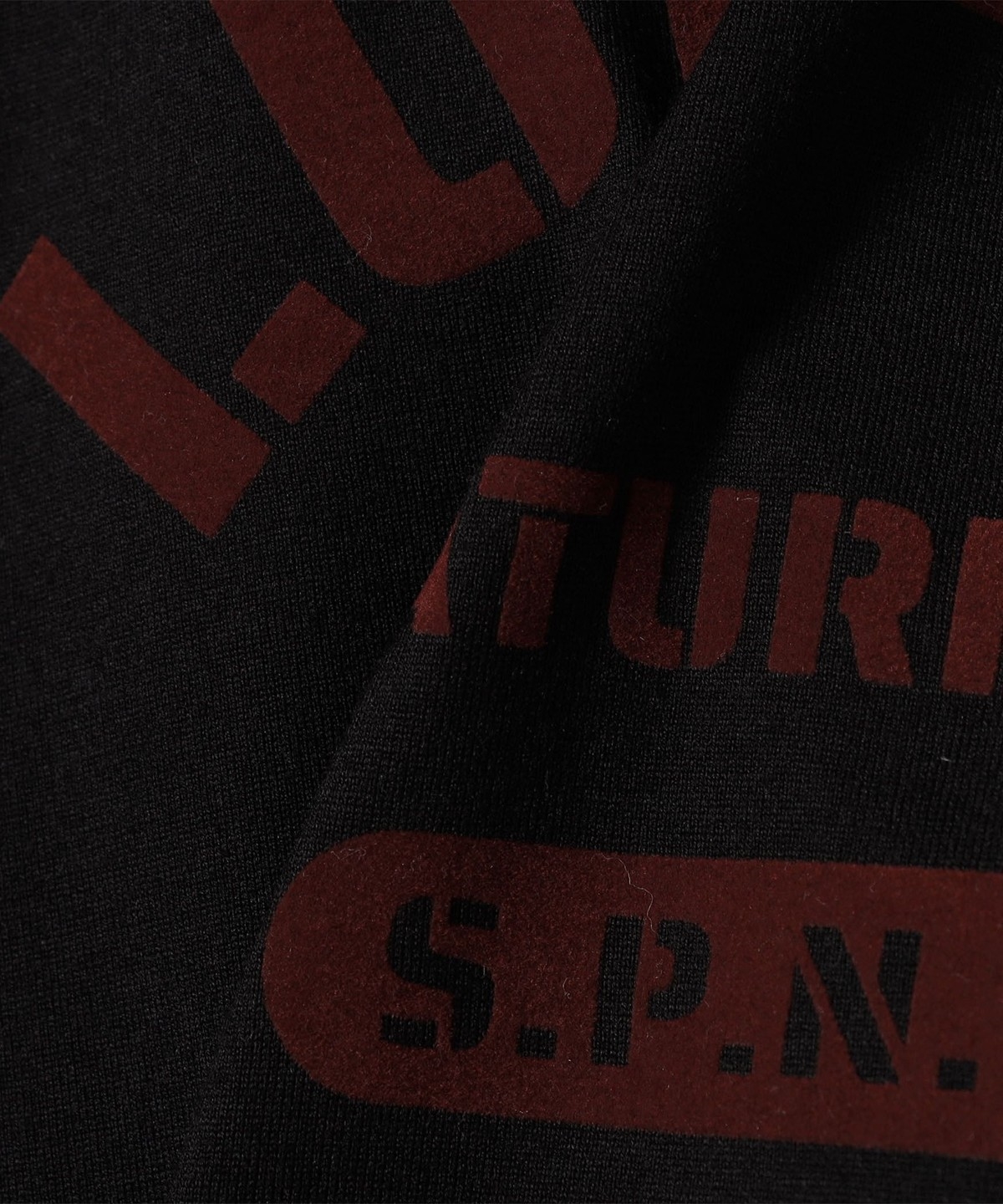 フロントのロゴはミリタリー調のステンシルタイプのロゴをフロッキープリントで入れることでクラシックムードに陰影ある見え掛を作ってあります