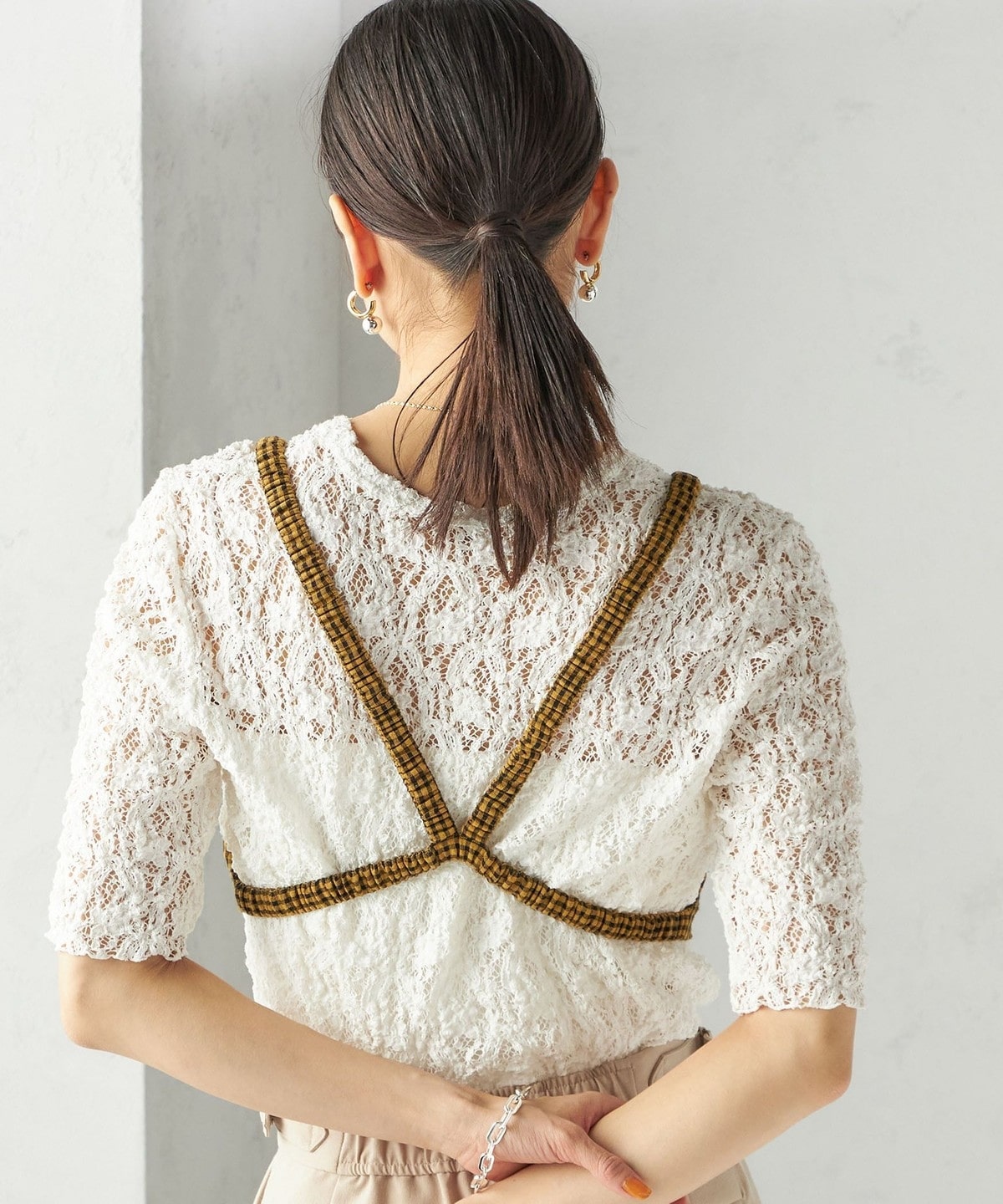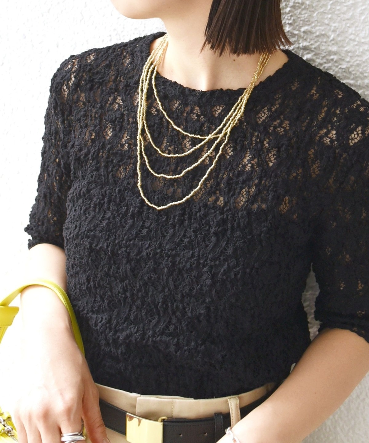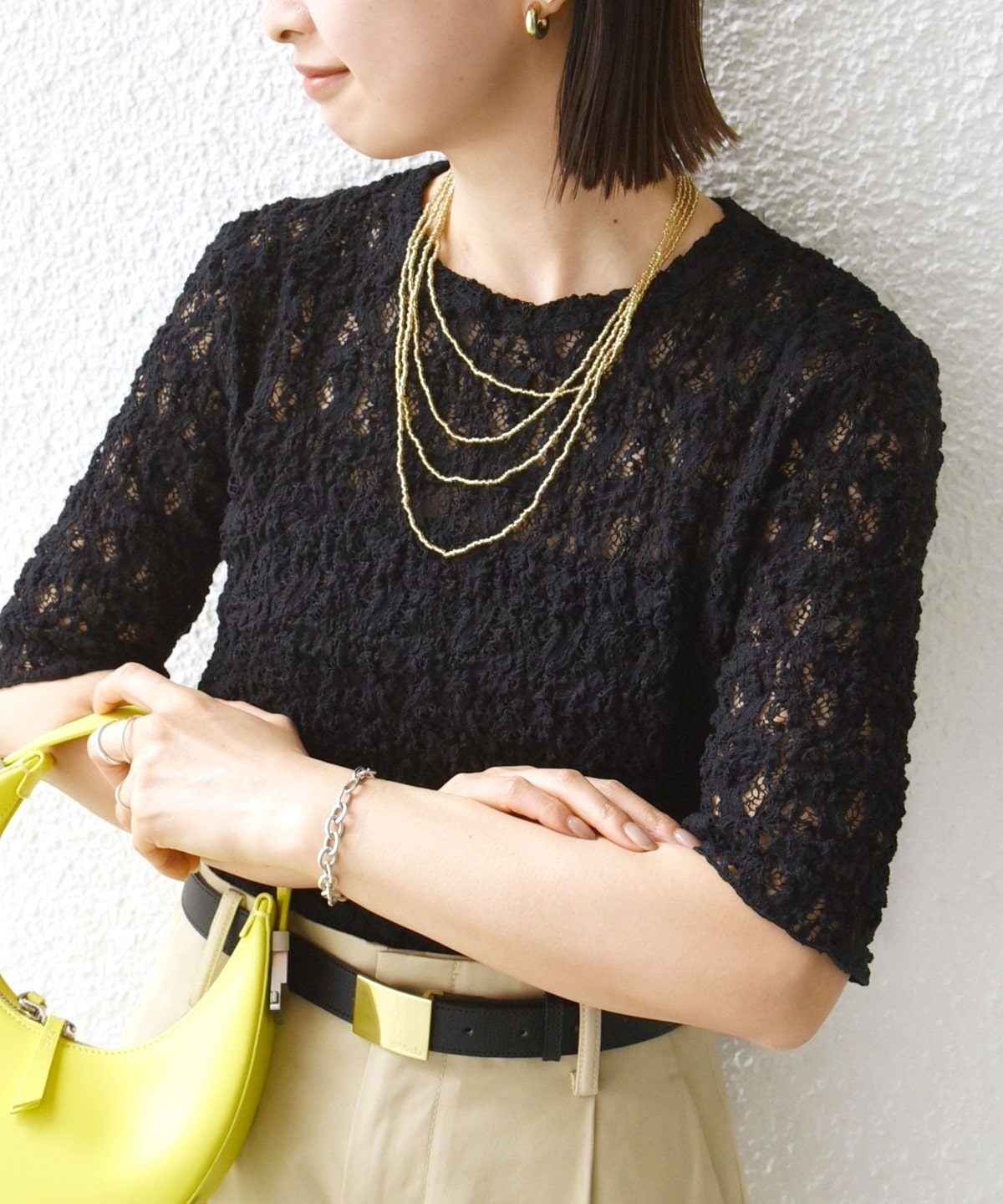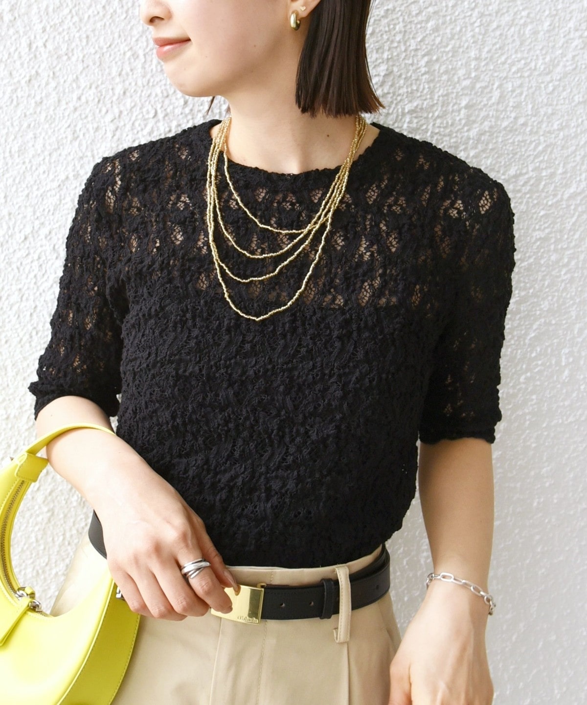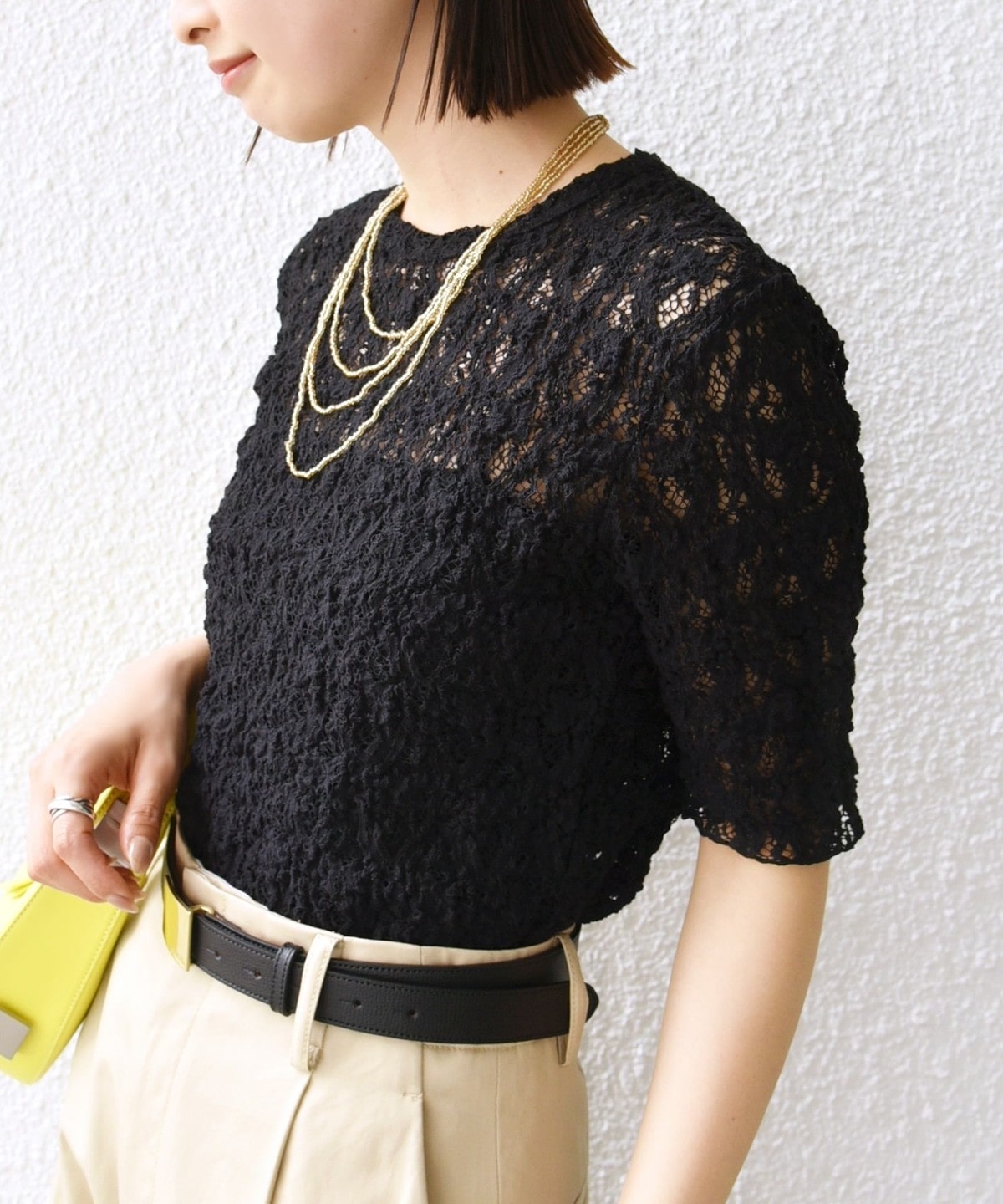 レースの繊細な表情が、コーディネートに女性らしいアクセントを加えてくれます。