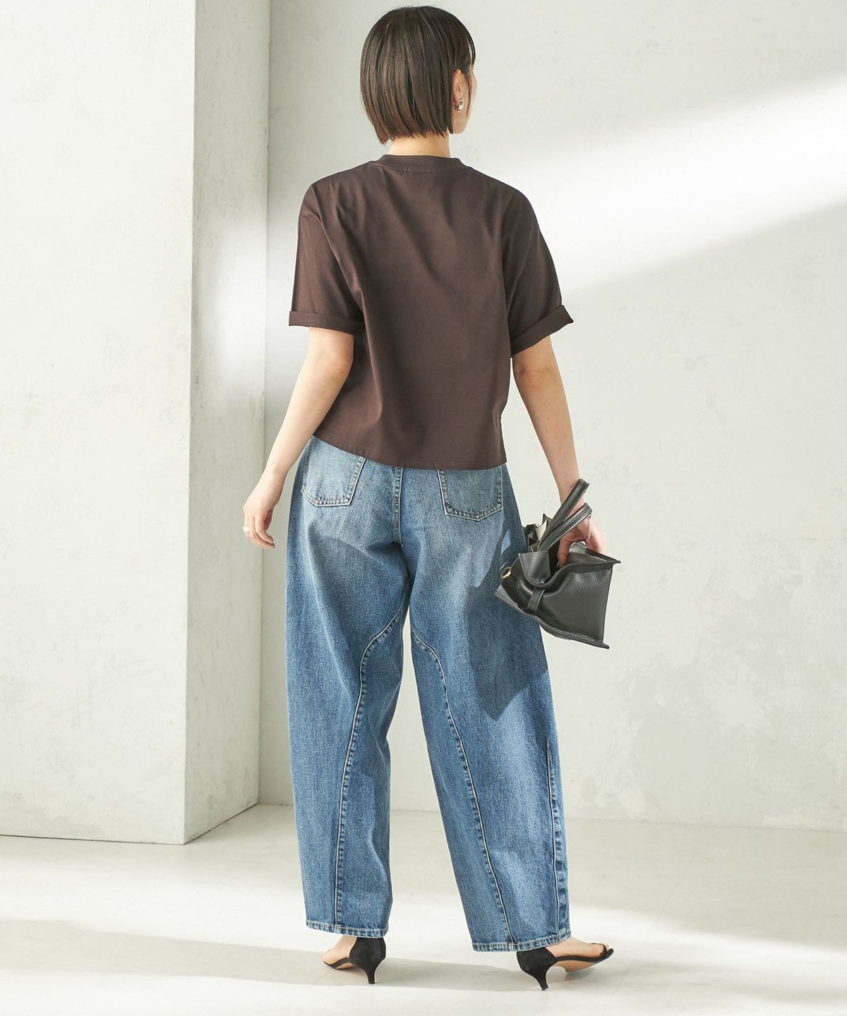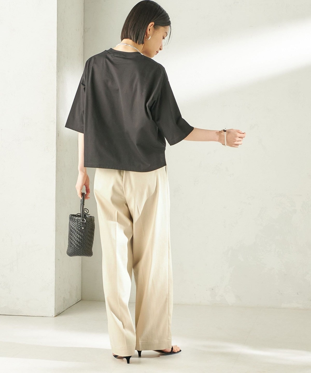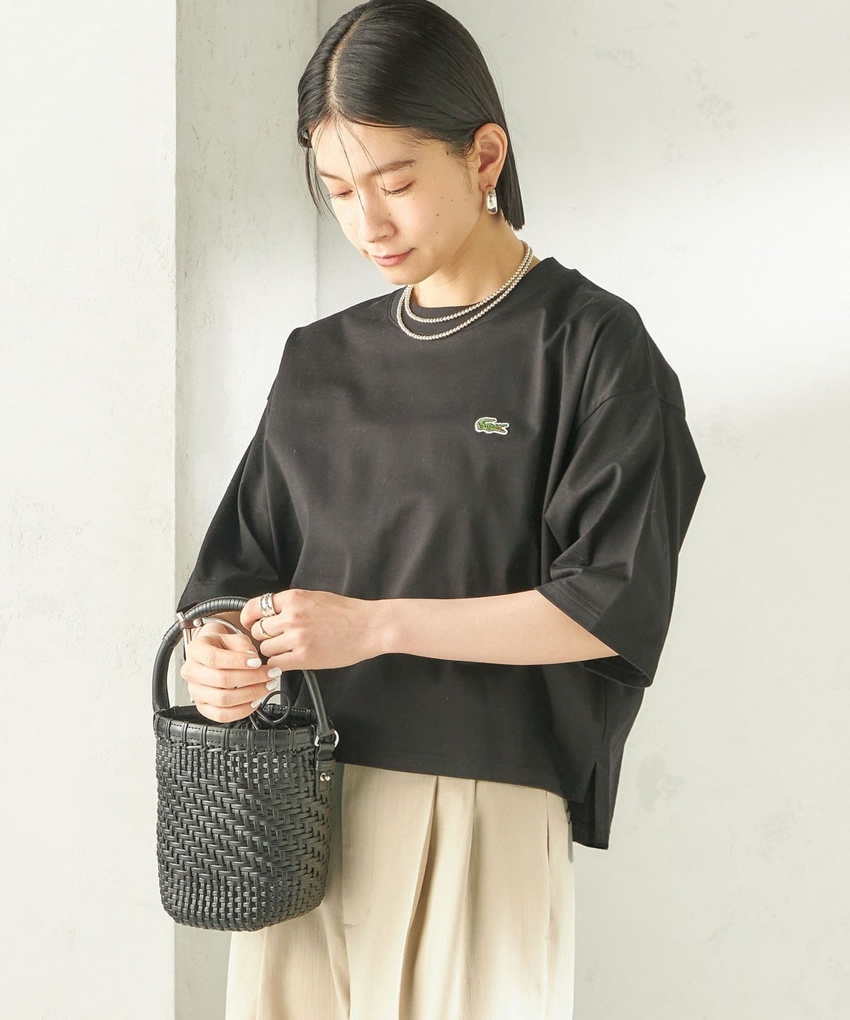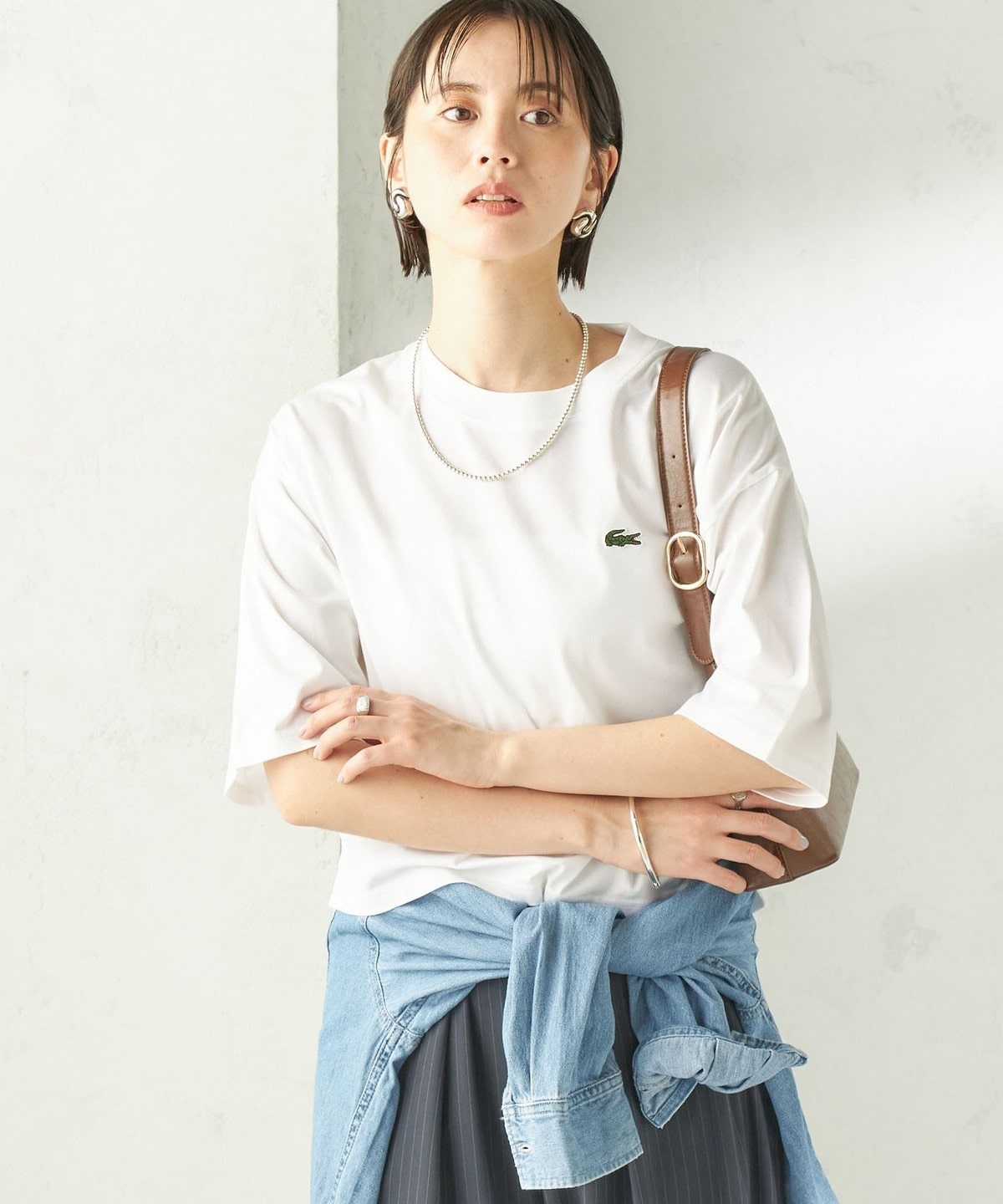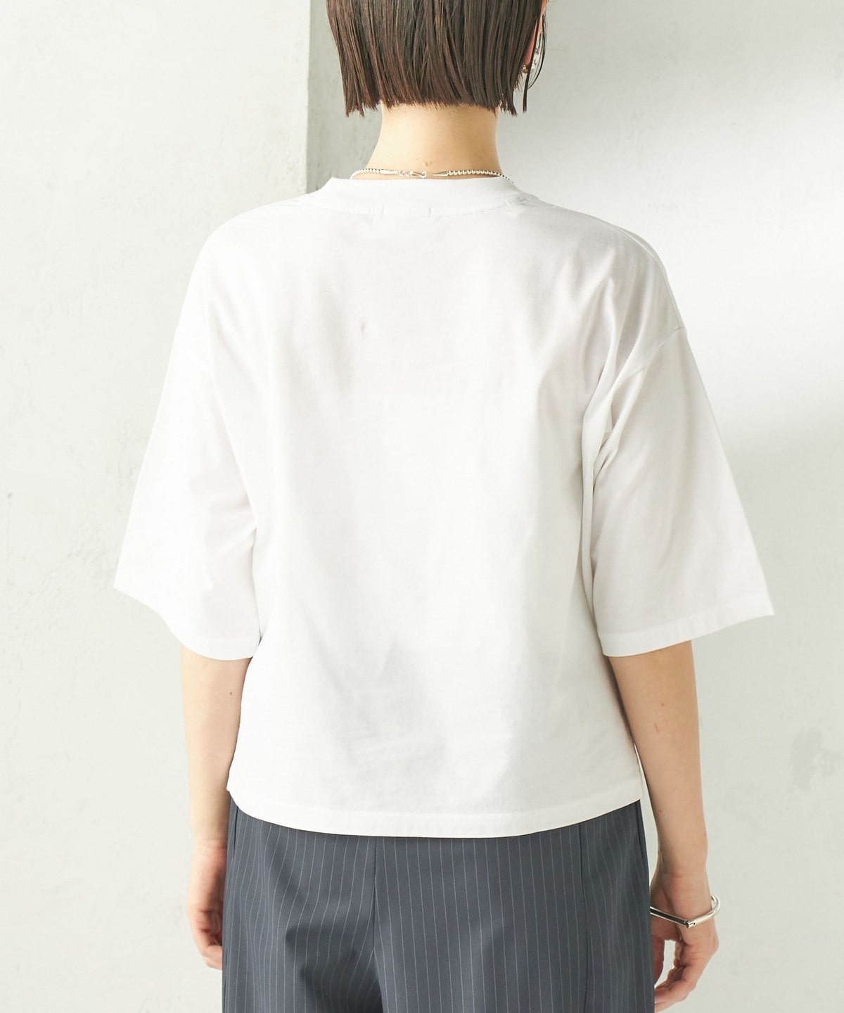程よい身幅のゆとりと、長すぎない着丈のボックスシルエットのバランスで一枚で着用したときに決まりやすいデザイン。
