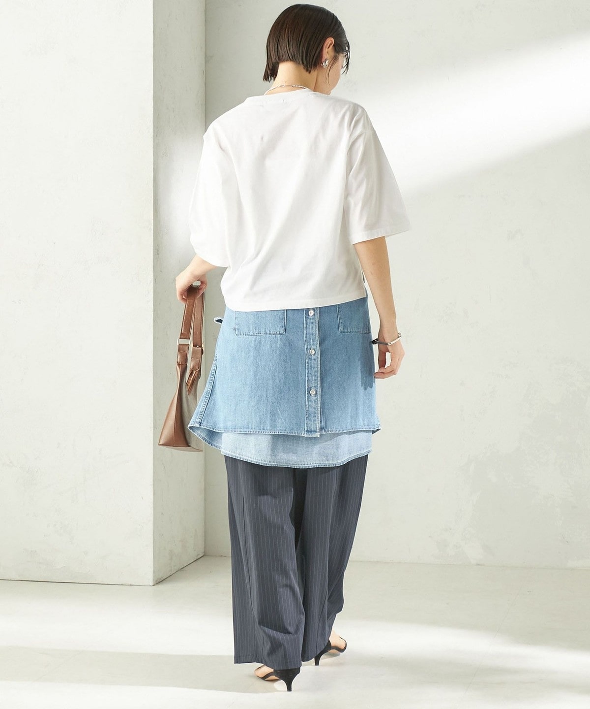着丈に前後差があることでインせずとも裾回りのバランスが取りやすく、袖丈は肘が隠れる五分袖なので気になる二の腕周りもカバーしてくれます。
