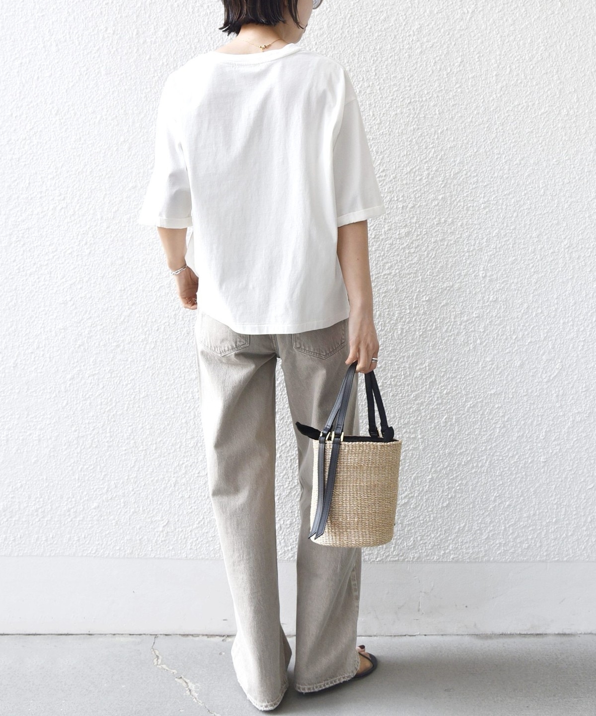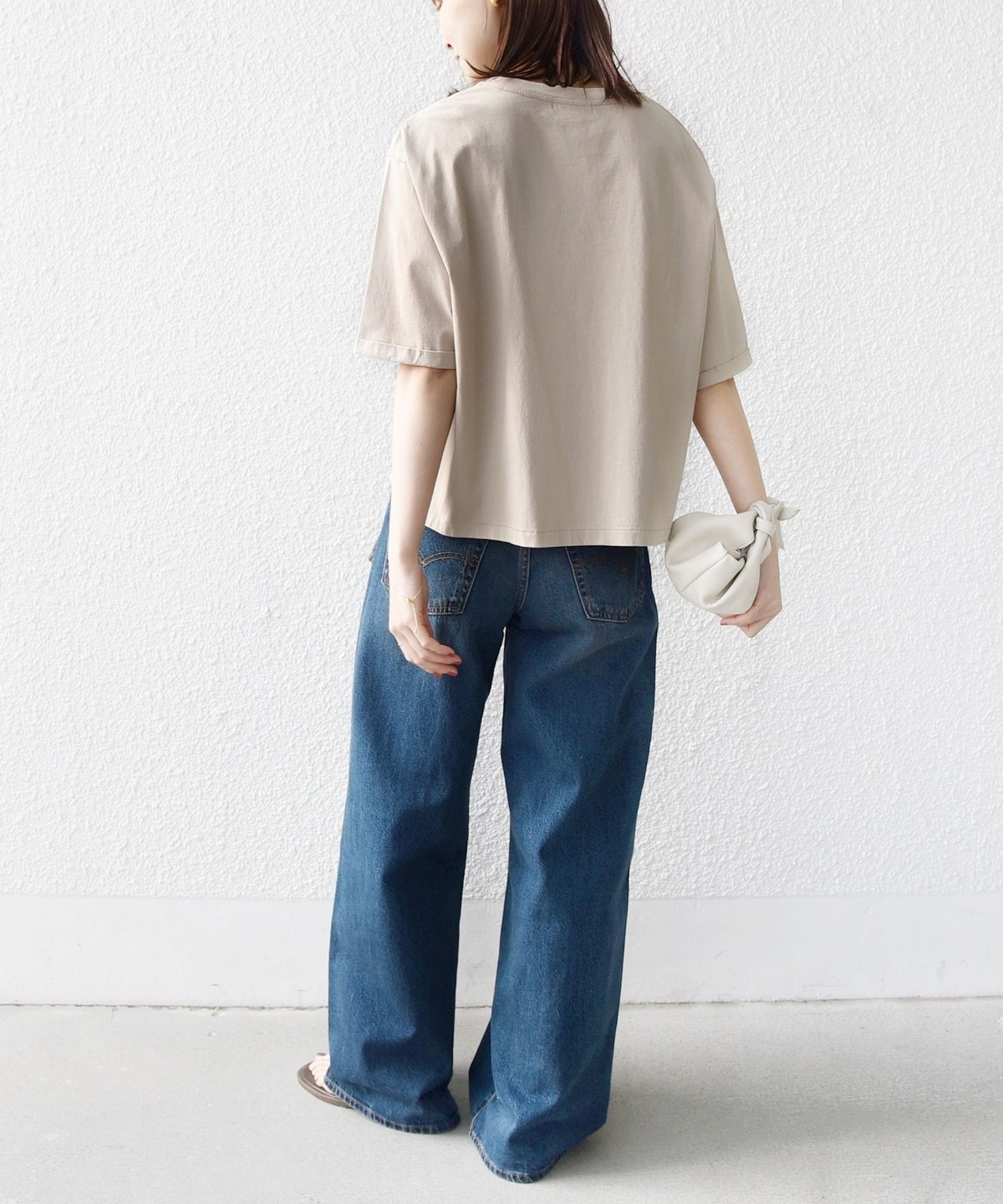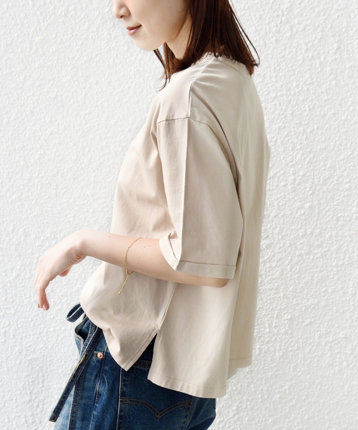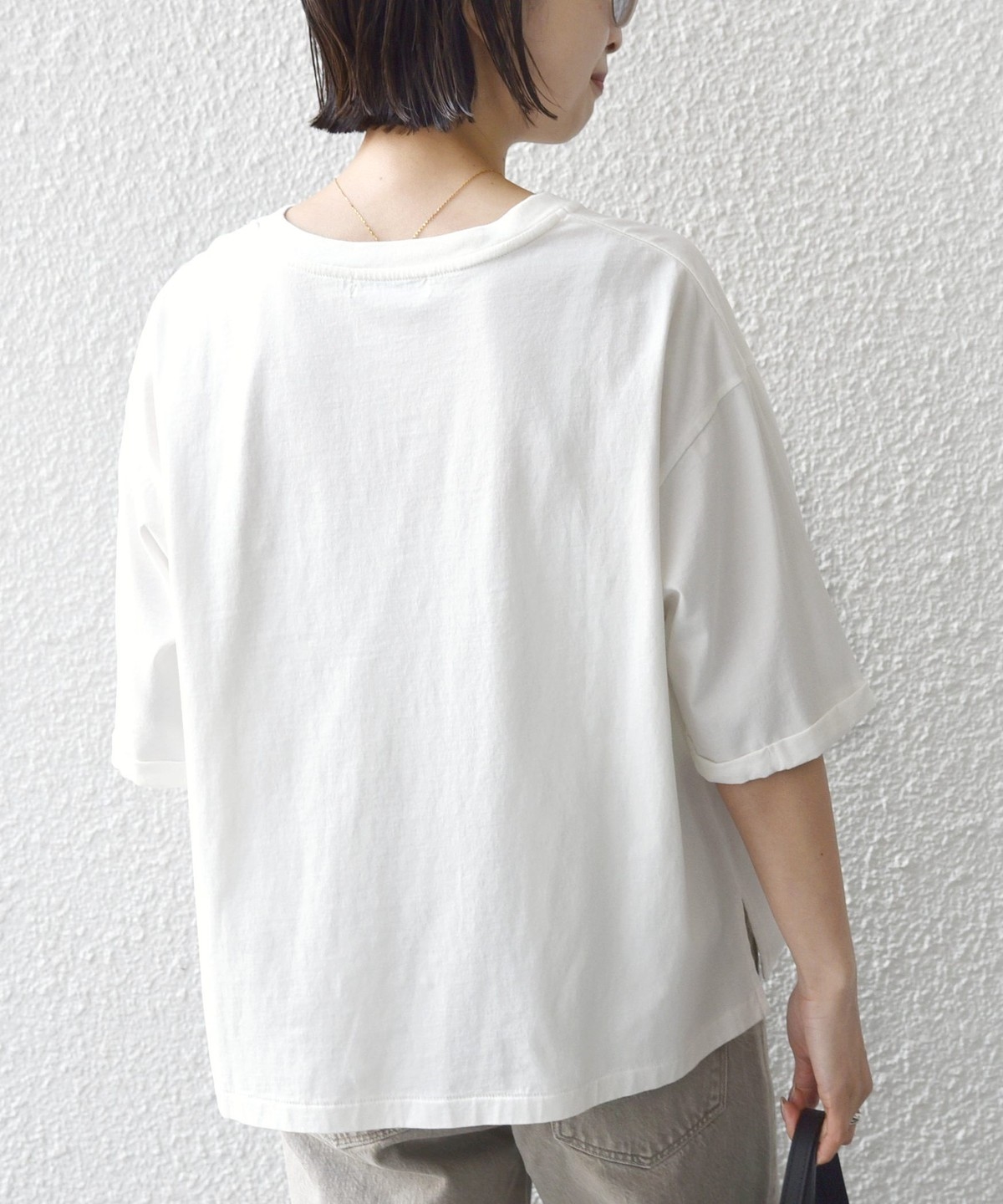 着丈はやや短めのボックスシルエットなので一枚でさらっと着ても決まります。
