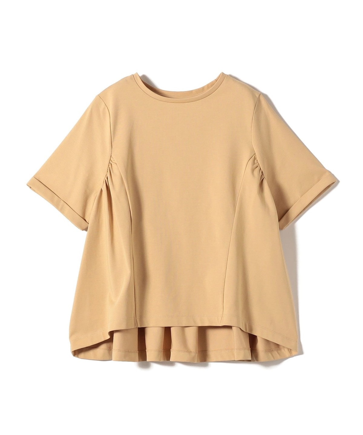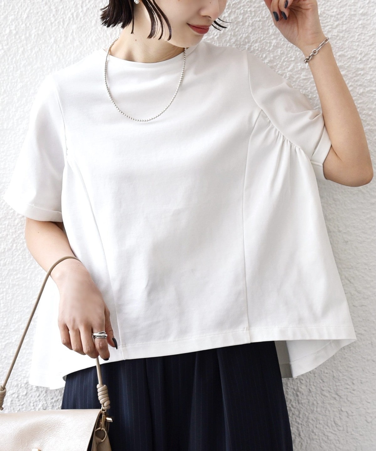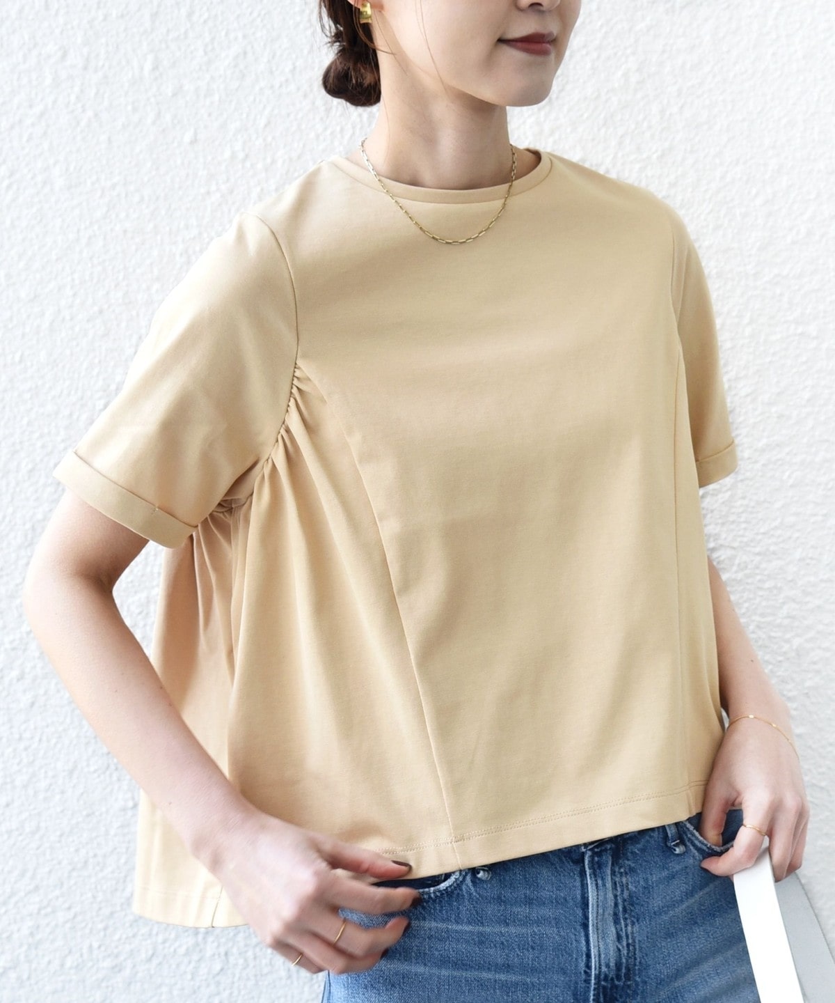 サイドからバックにかけて施されたギャザーがさらっと着るだけで着映えするカットソー。