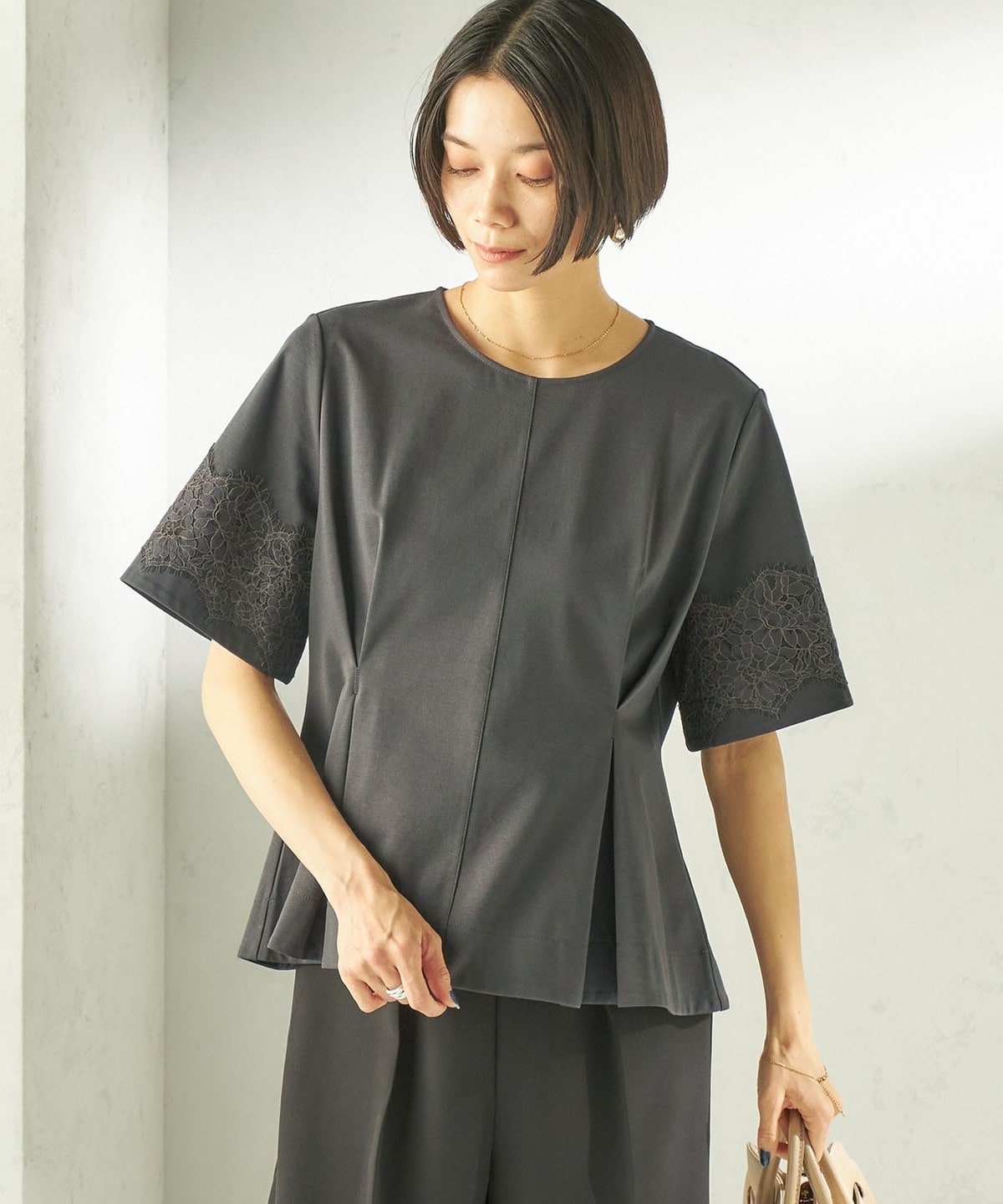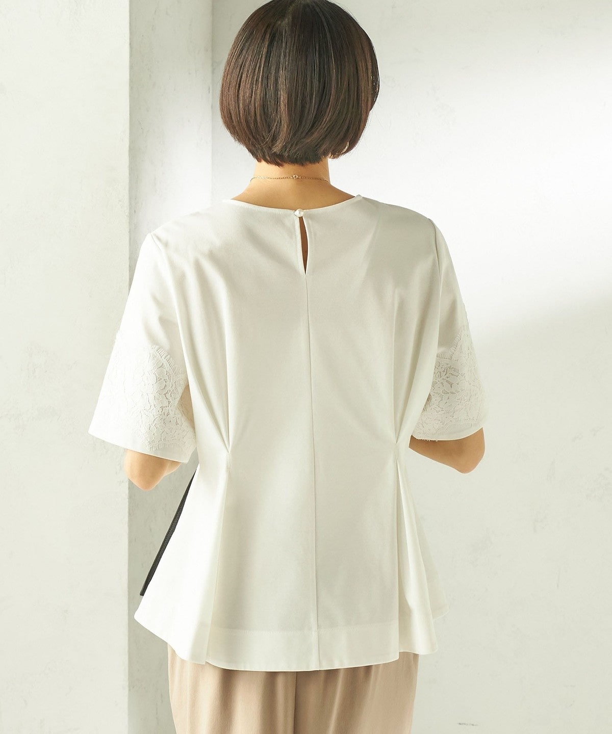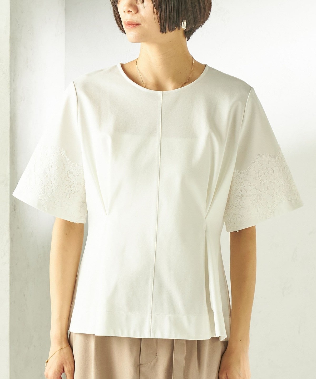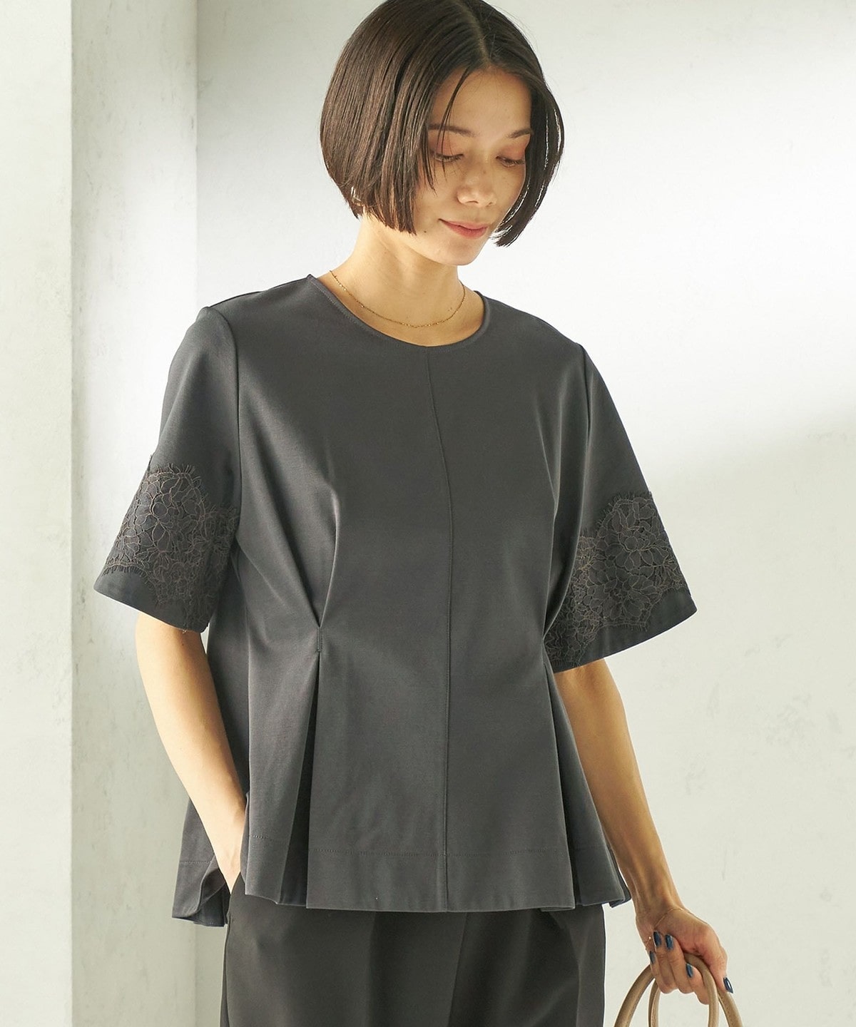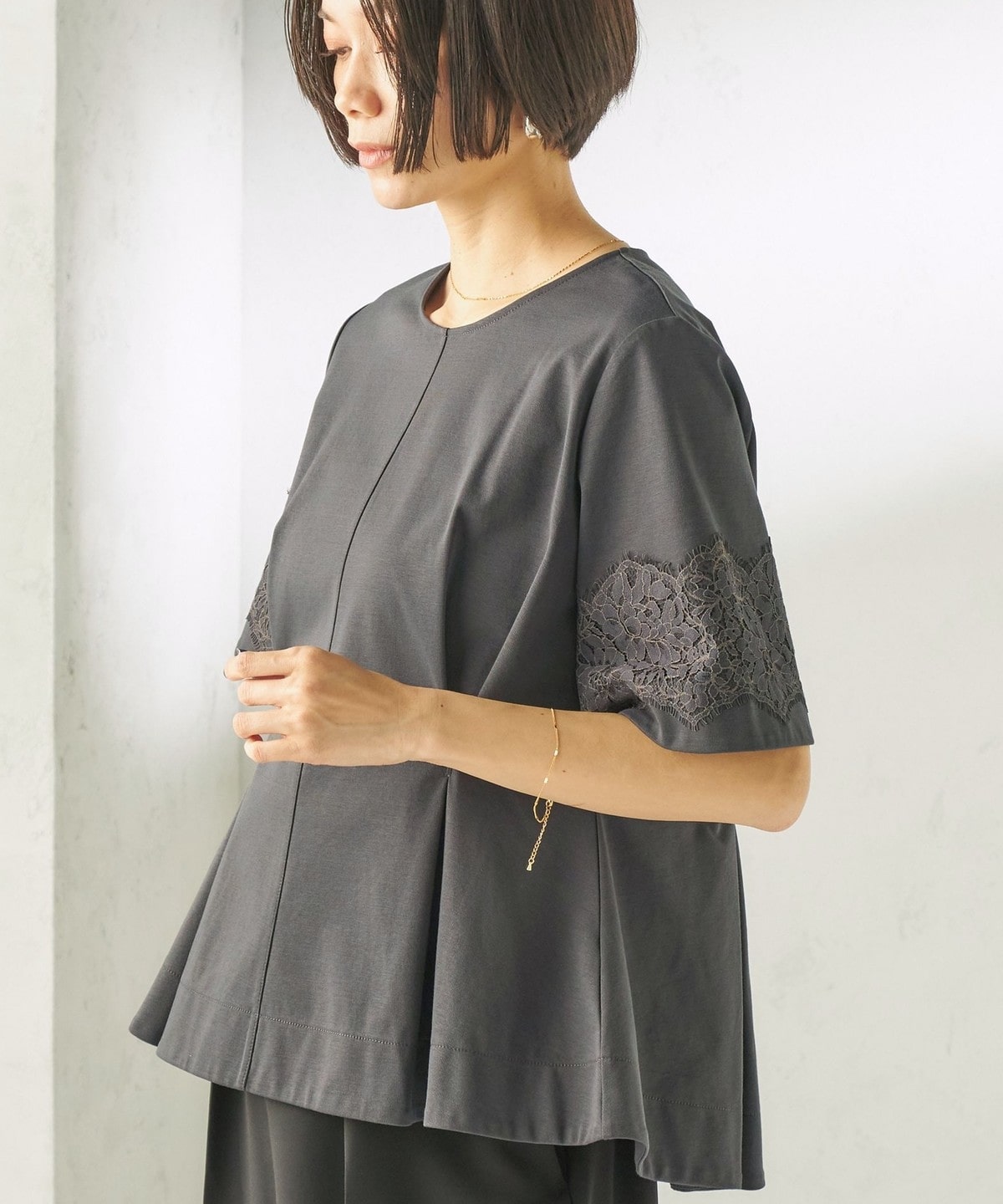 ウエストタックと袖のレース使いで立体感を出し、ブラウスのような上品な印象に仕上げています。