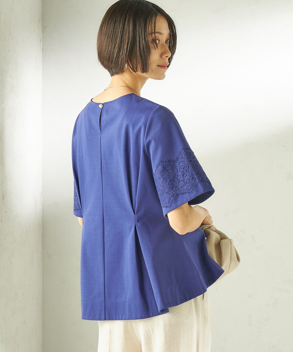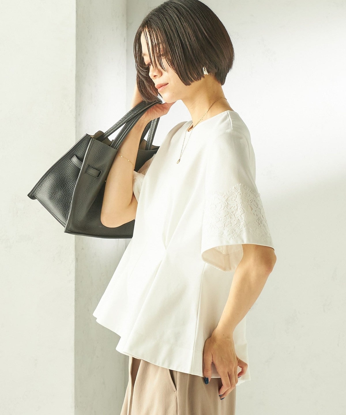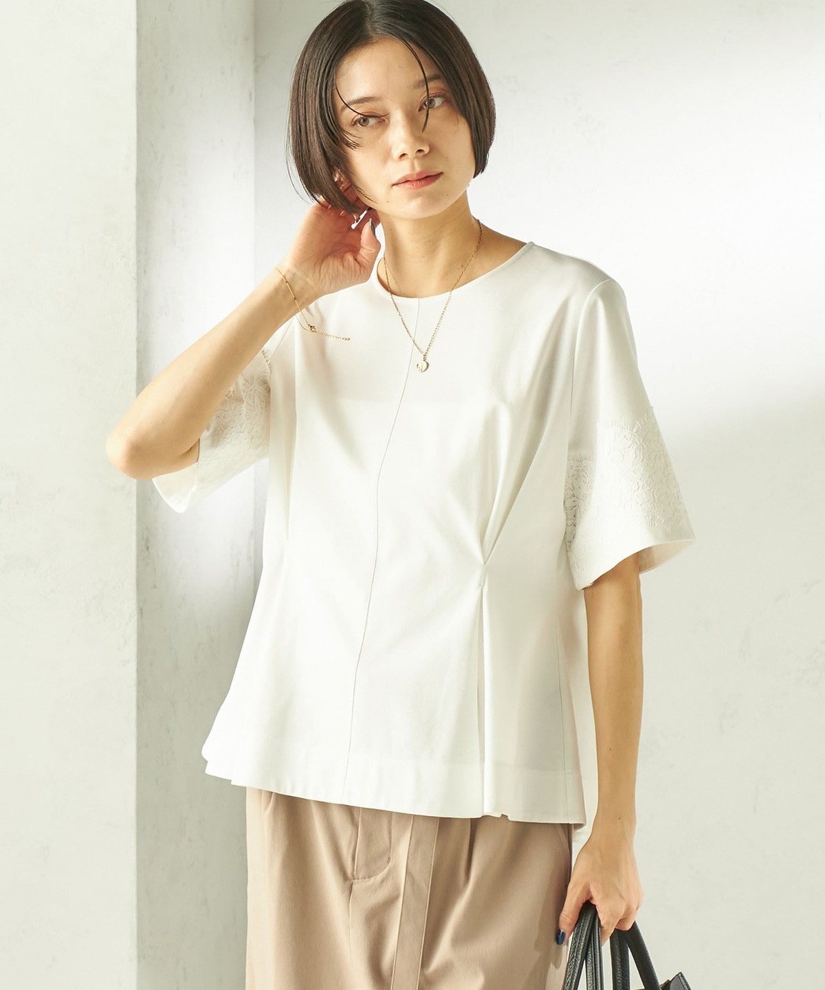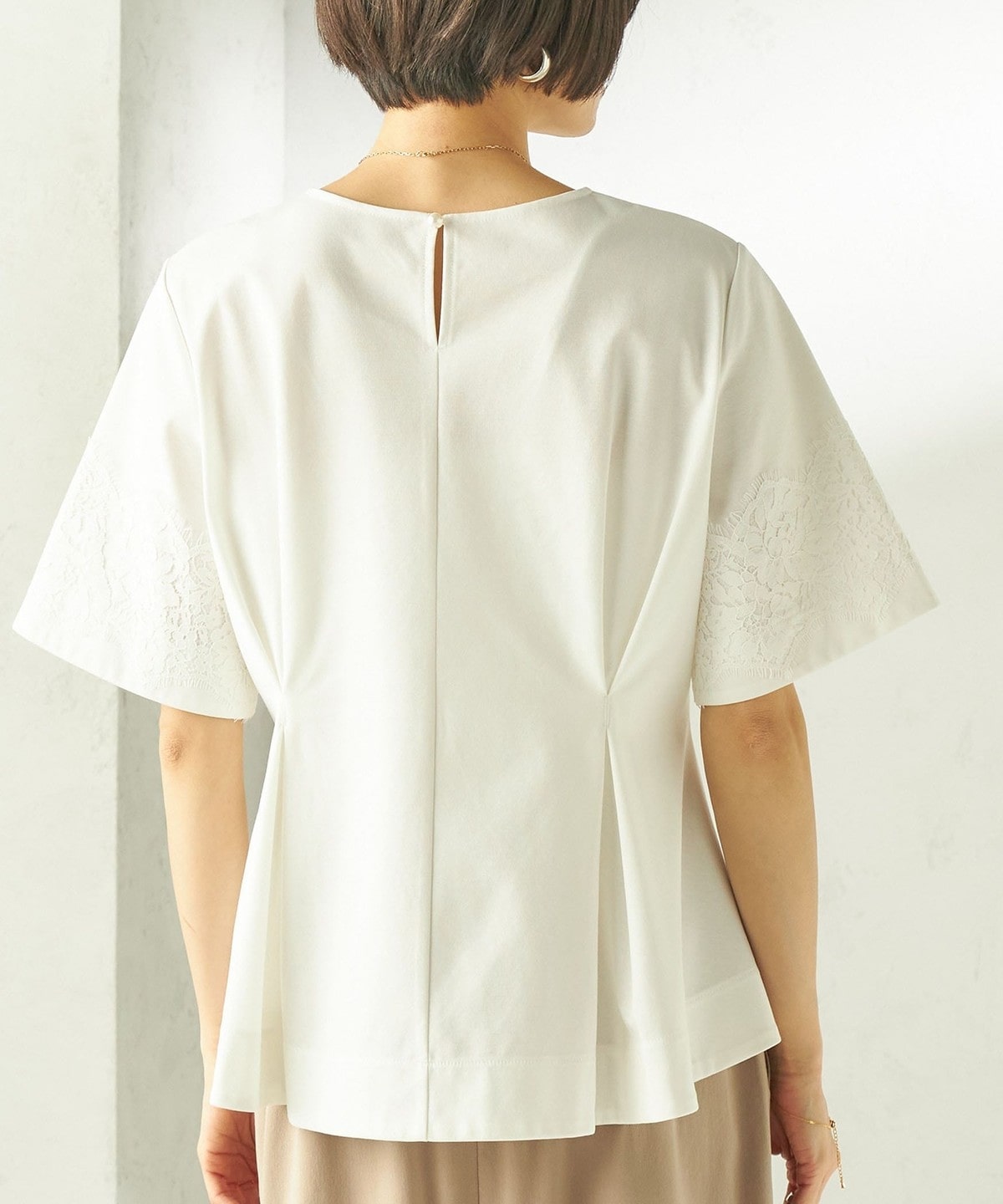 ウエストタックと袖のレース使いで立体感を出し、ブラウスのような上品な印象に仕上げています。