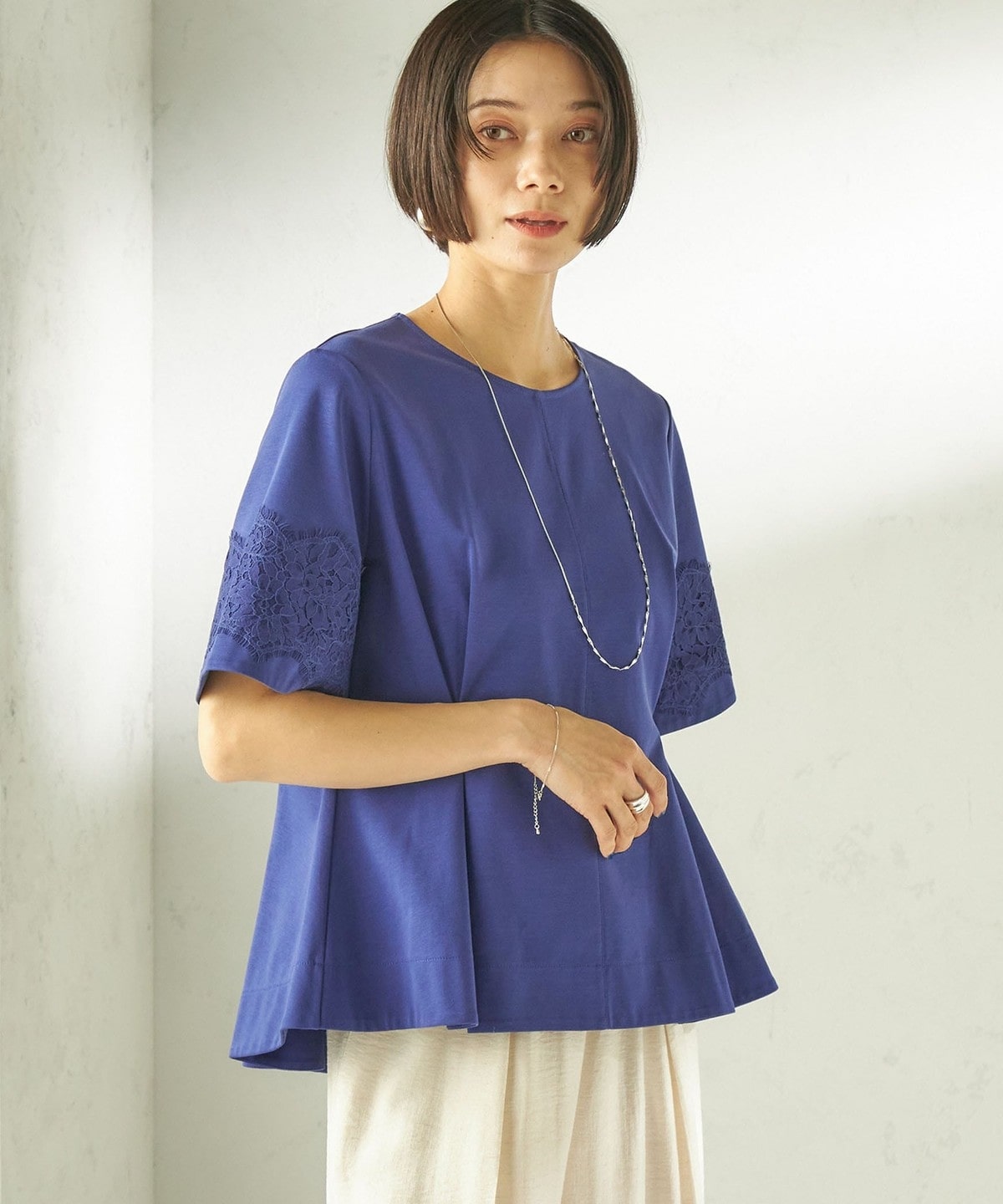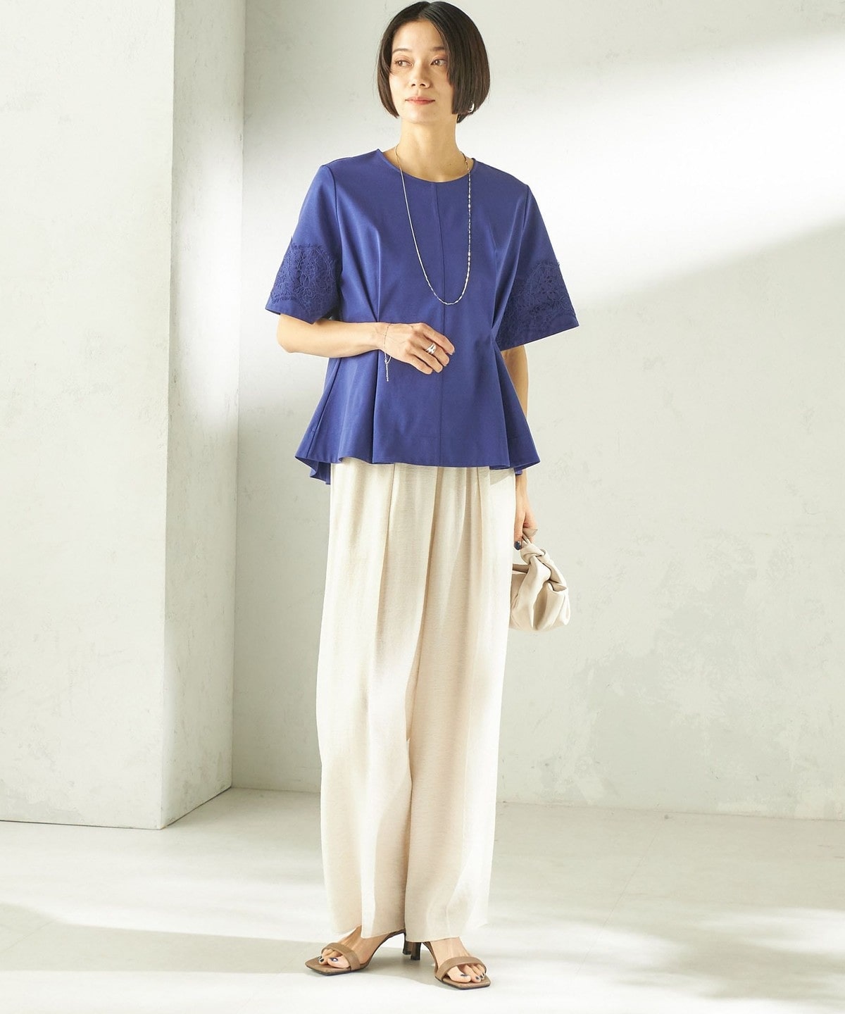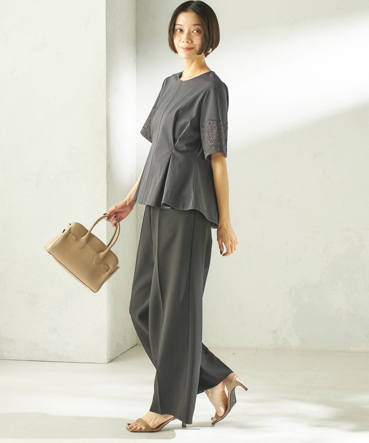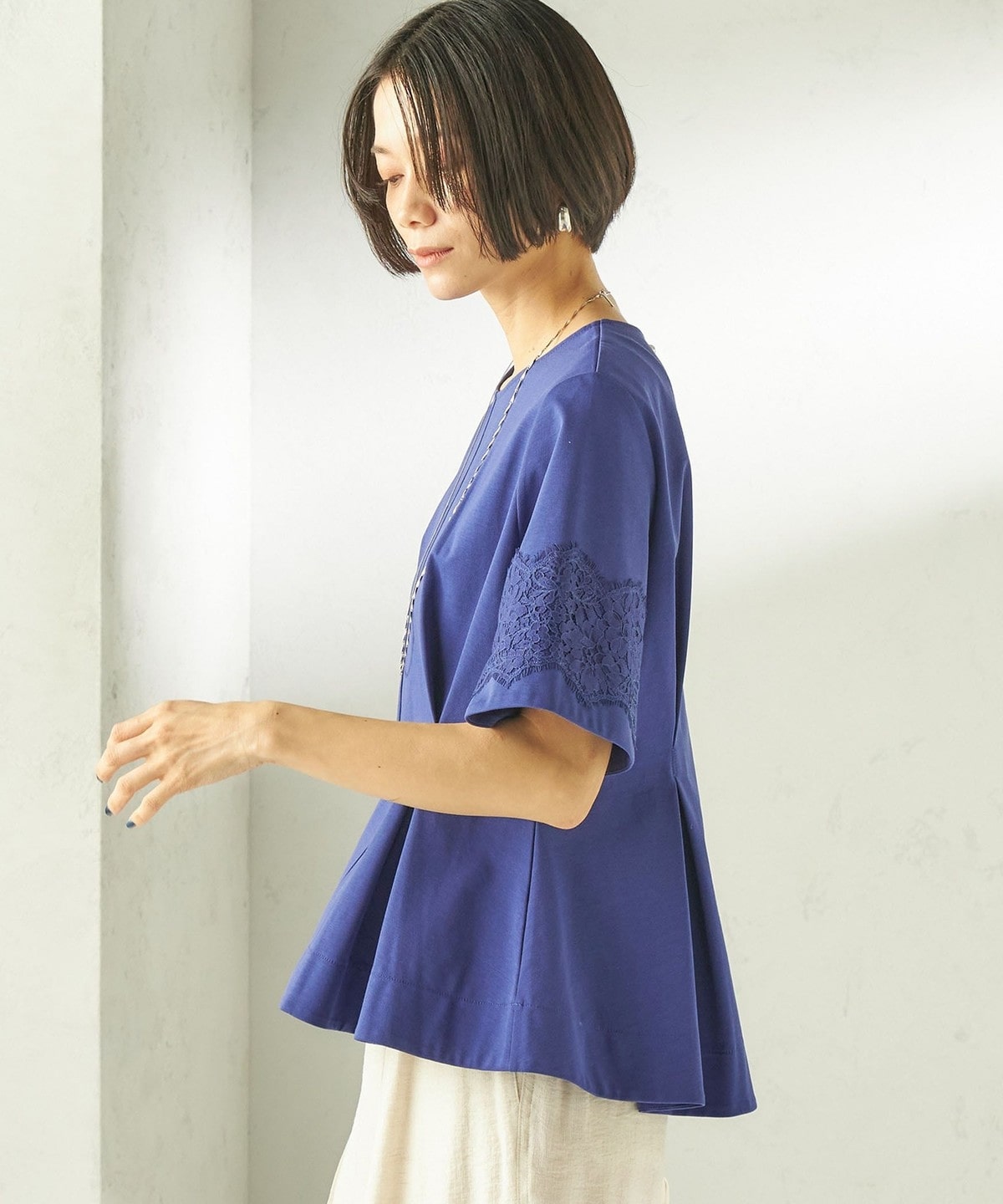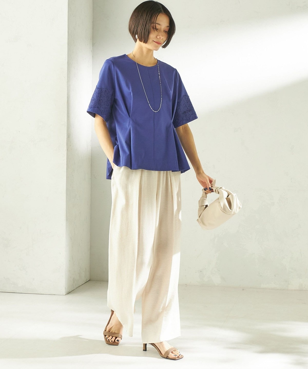 ウエストタックと袖のレース使いで立体感を出し、ブラウスのような上品な印象に仕上げています。