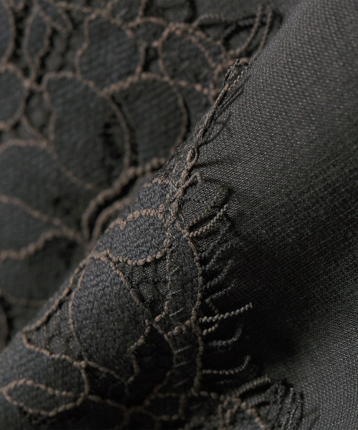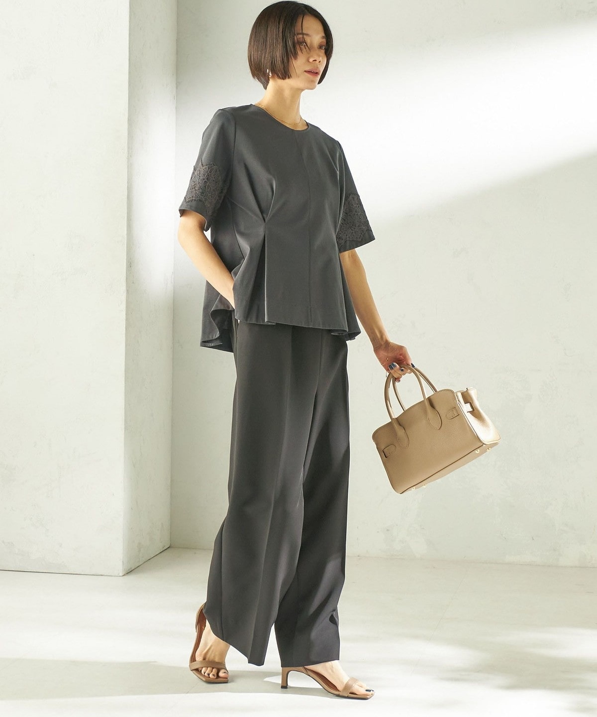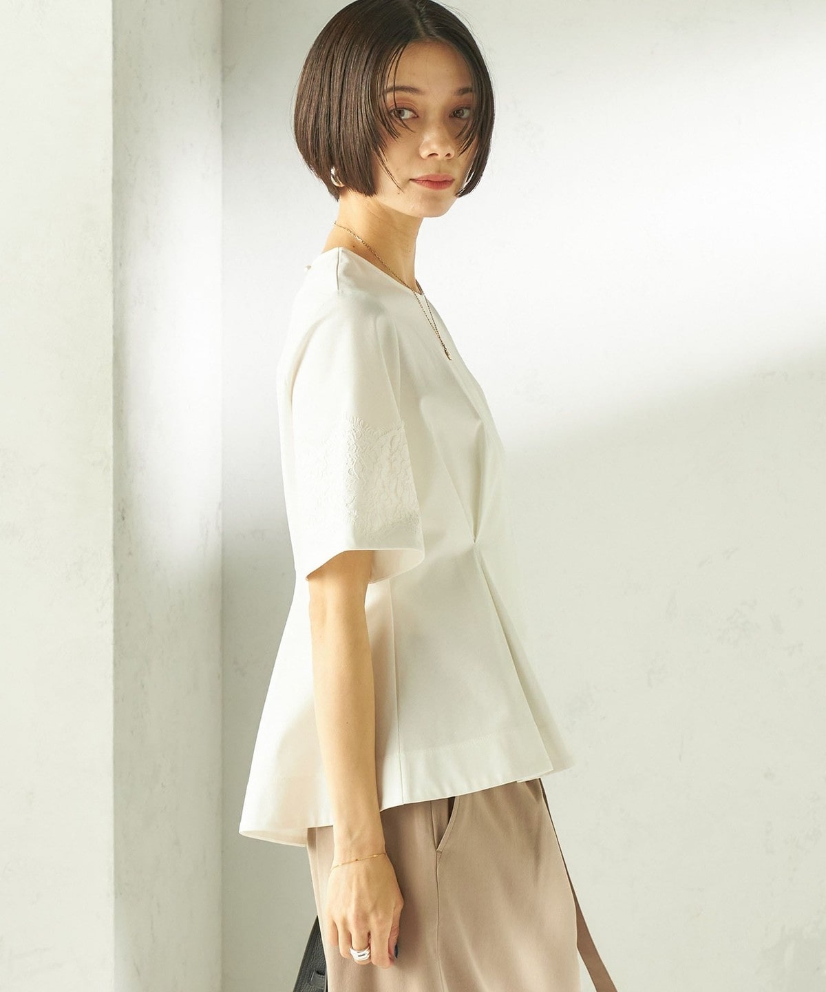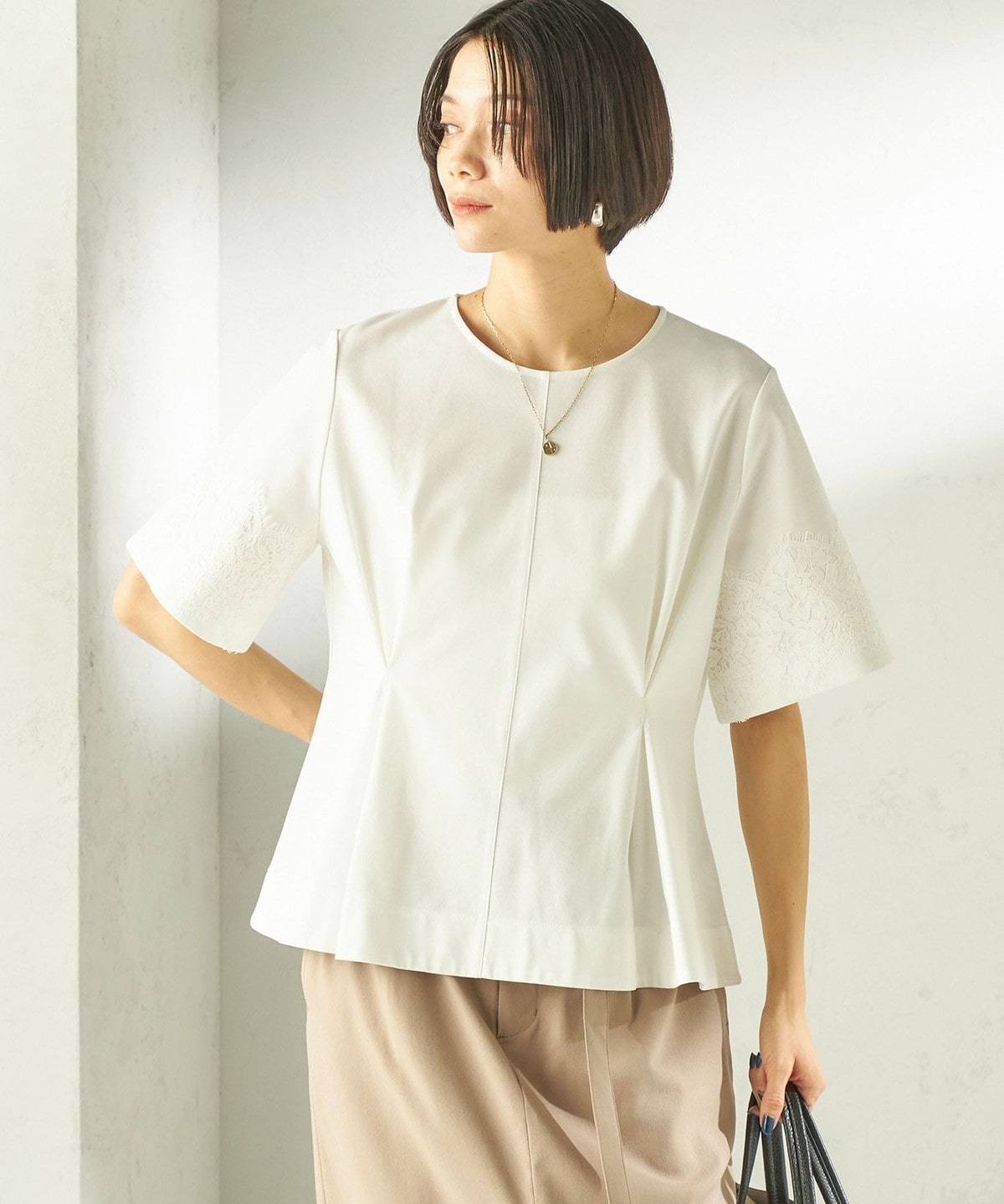 ウエストタックと袖のレース使いで立体感を出し、ブラウスのような上品な印象に仕上げています。