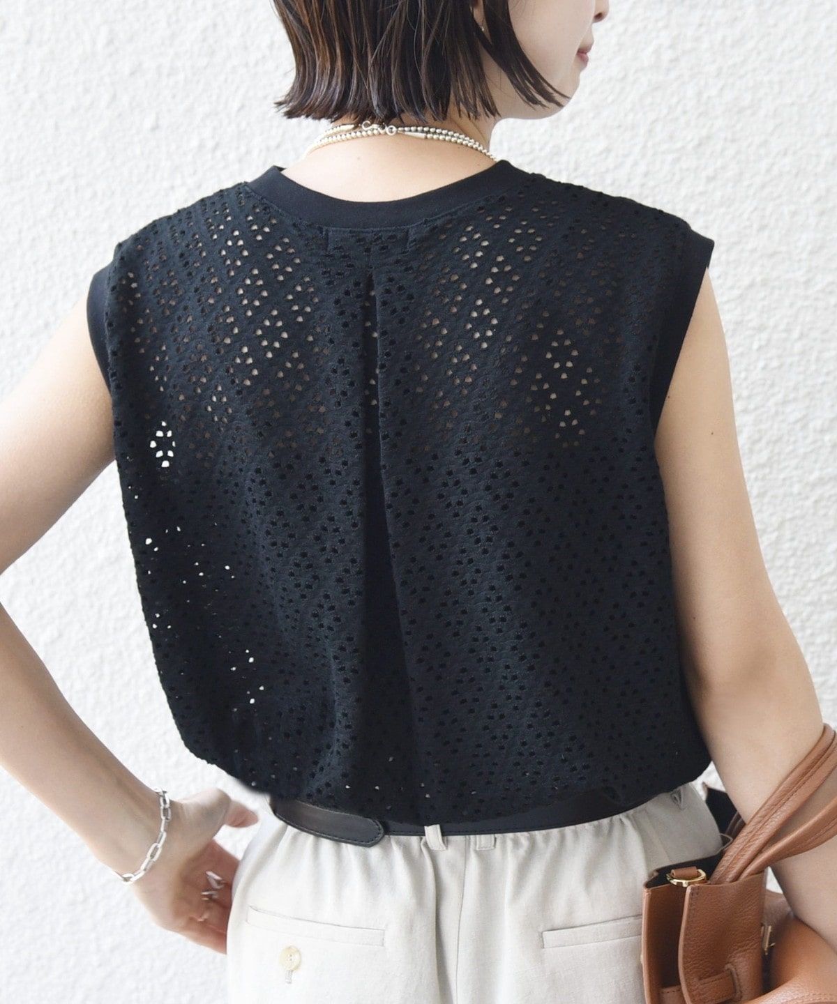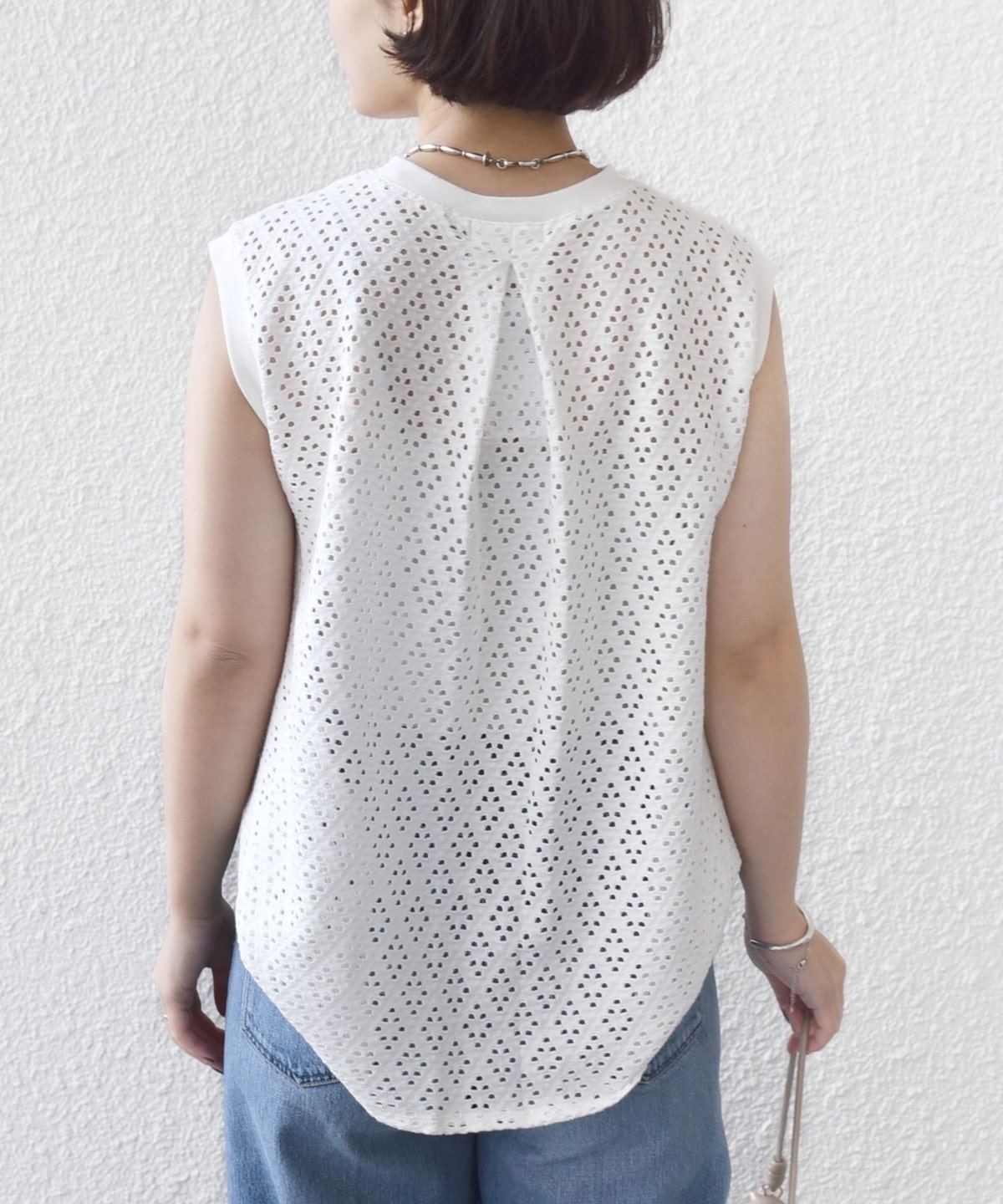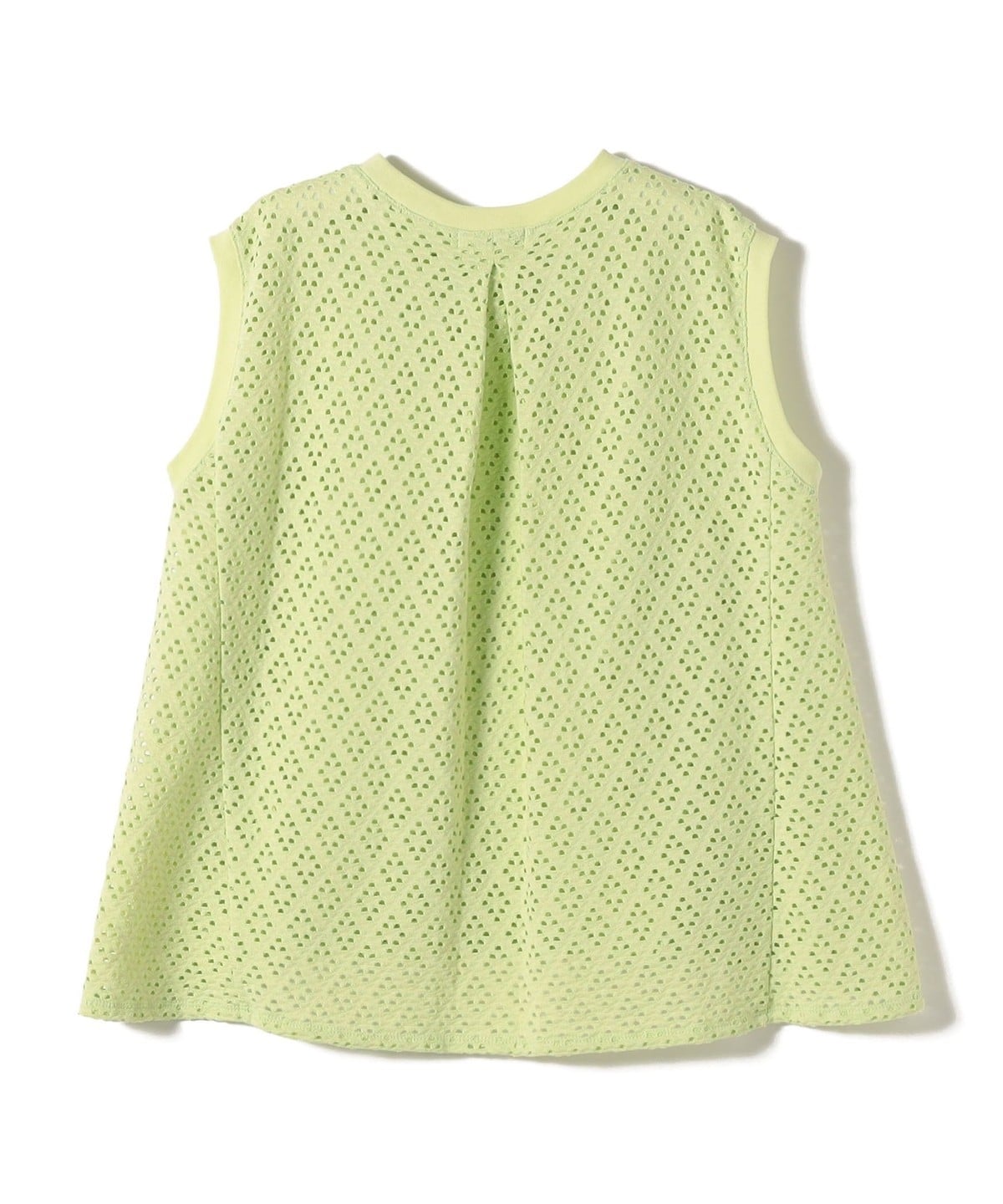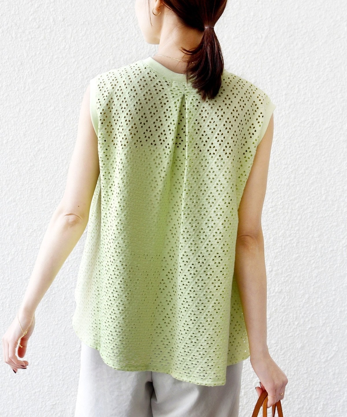 腕が見えすぎないノースリーブの裾フレア、後ろのタックが1枚で着映えするアイレットレースのカットソーです。