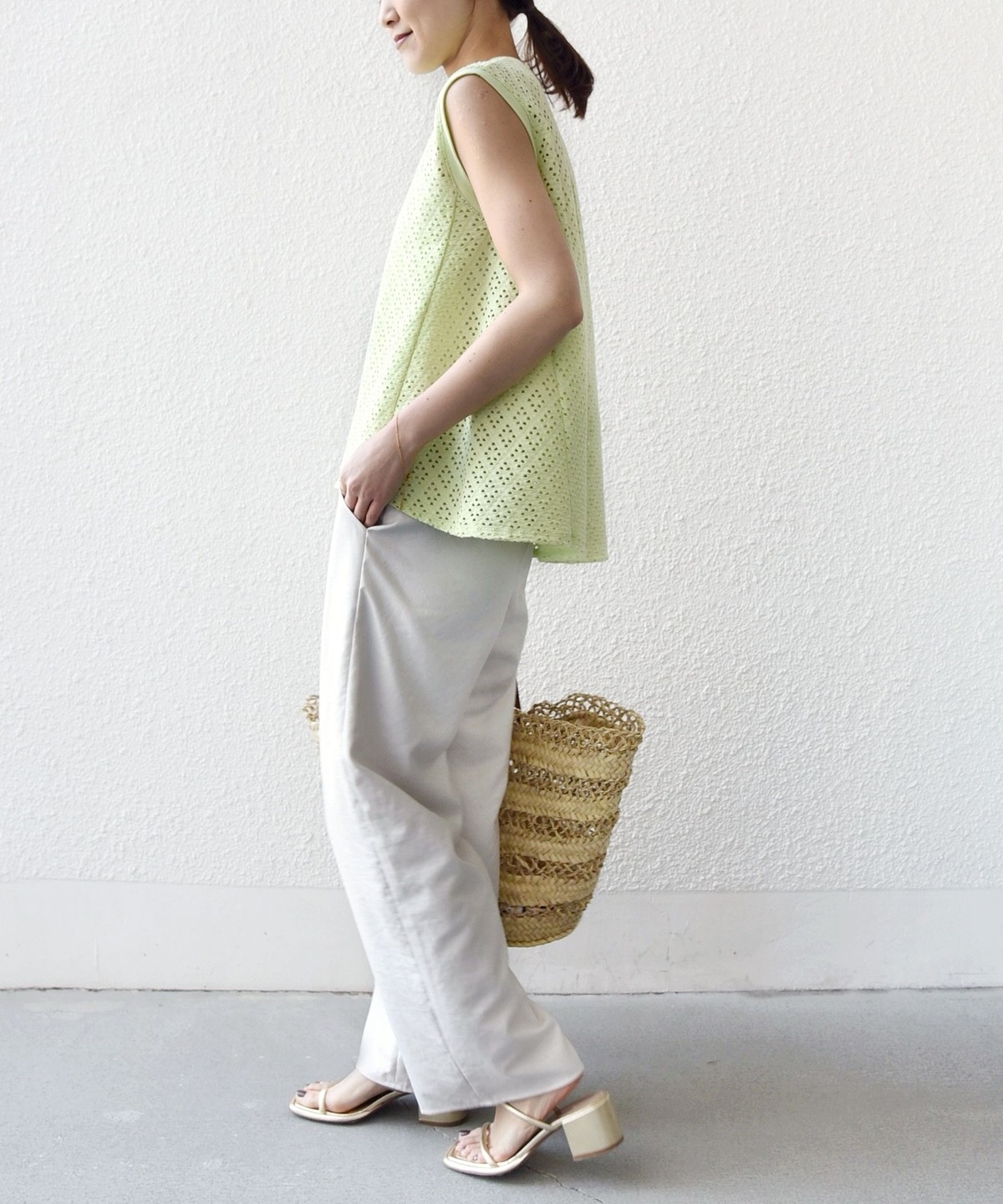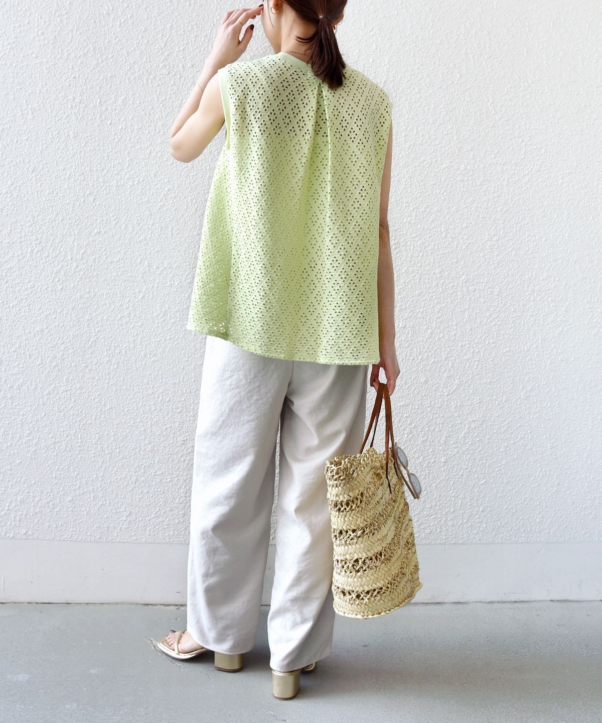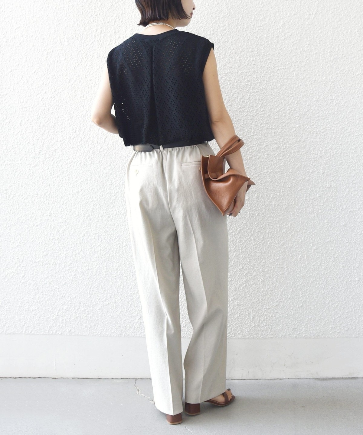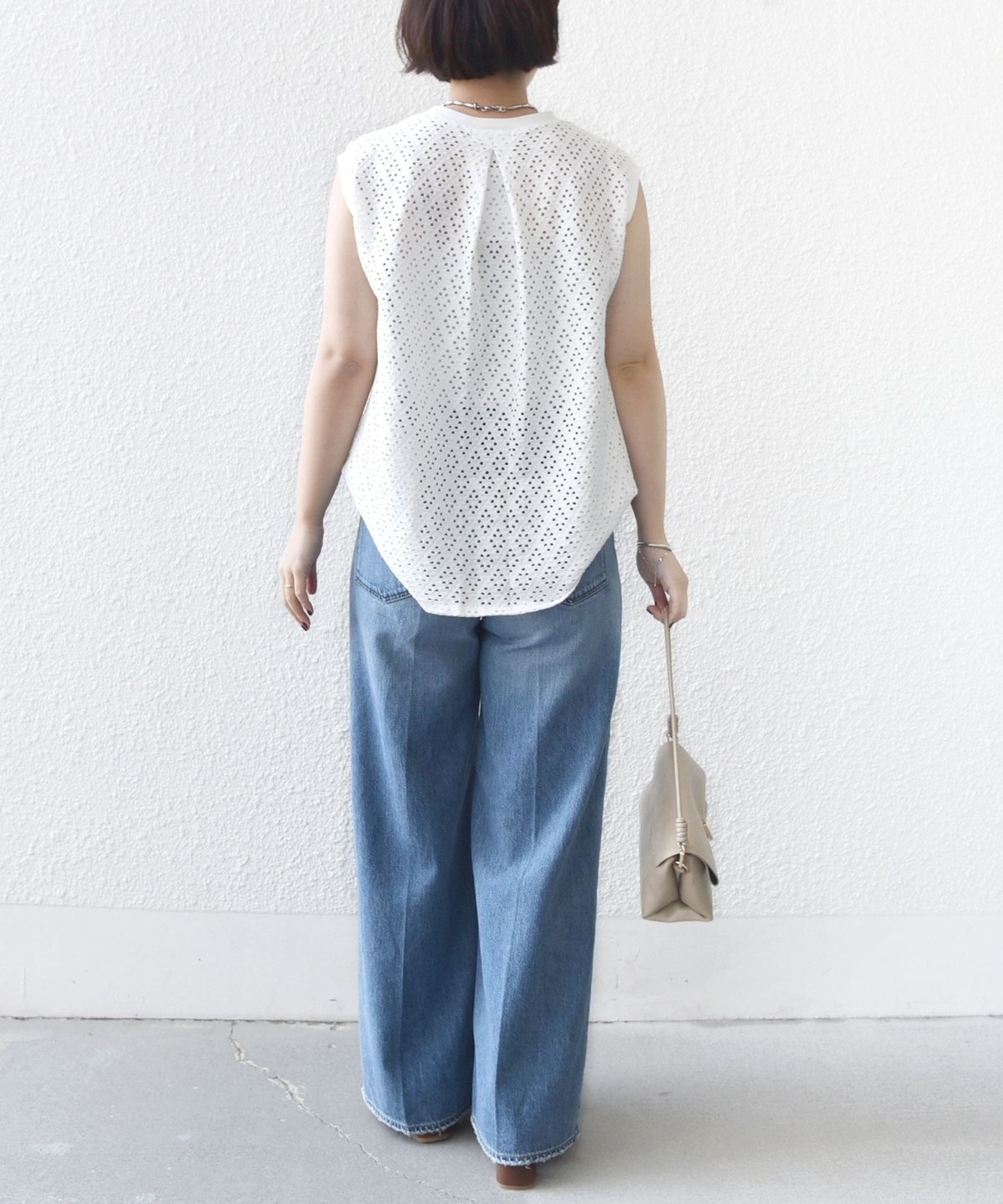腕が見えすぎないノースリーブの裾フレア、後ろのタックが1枚で着映えするアイレットレースのカットソーです。