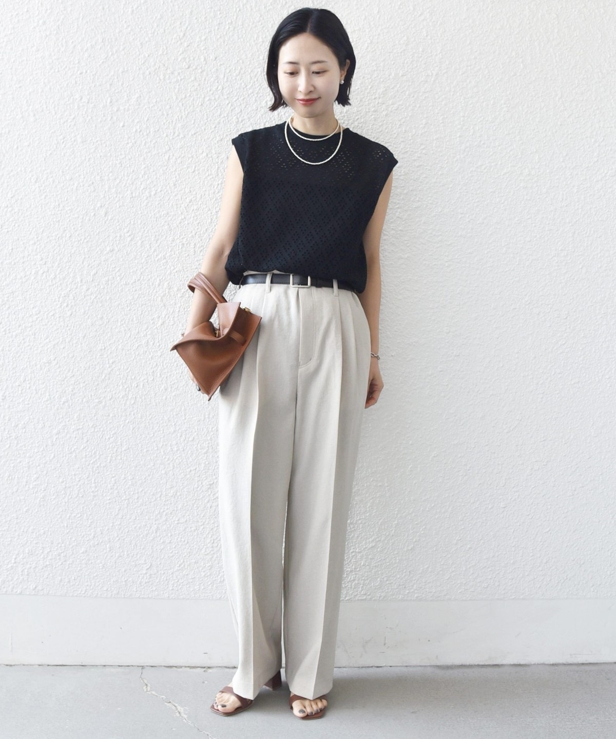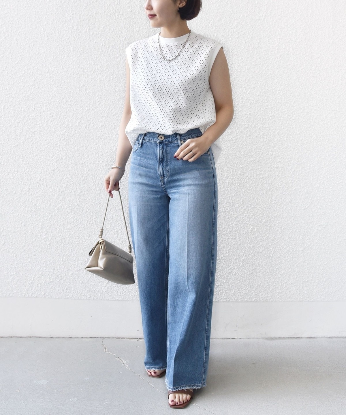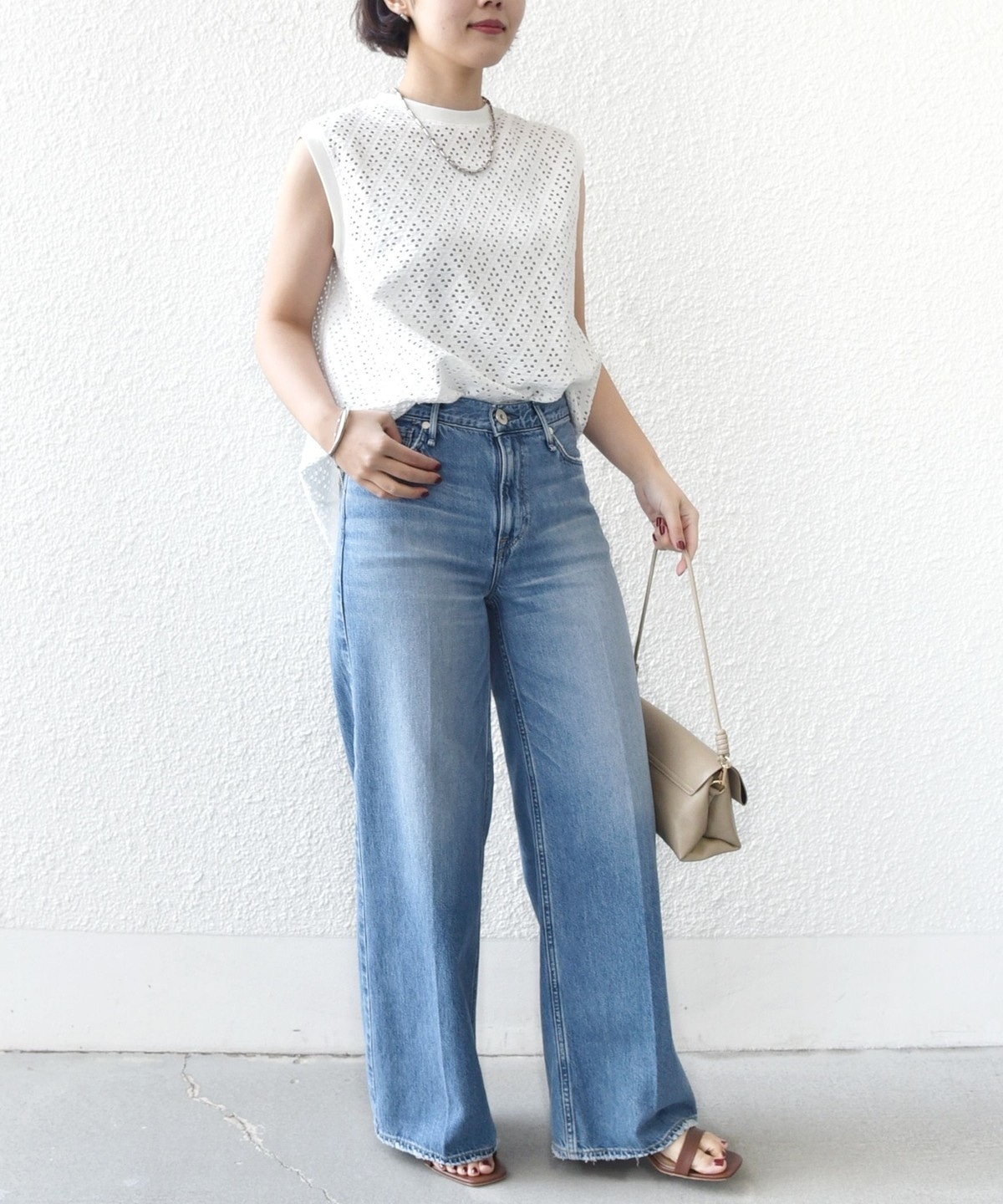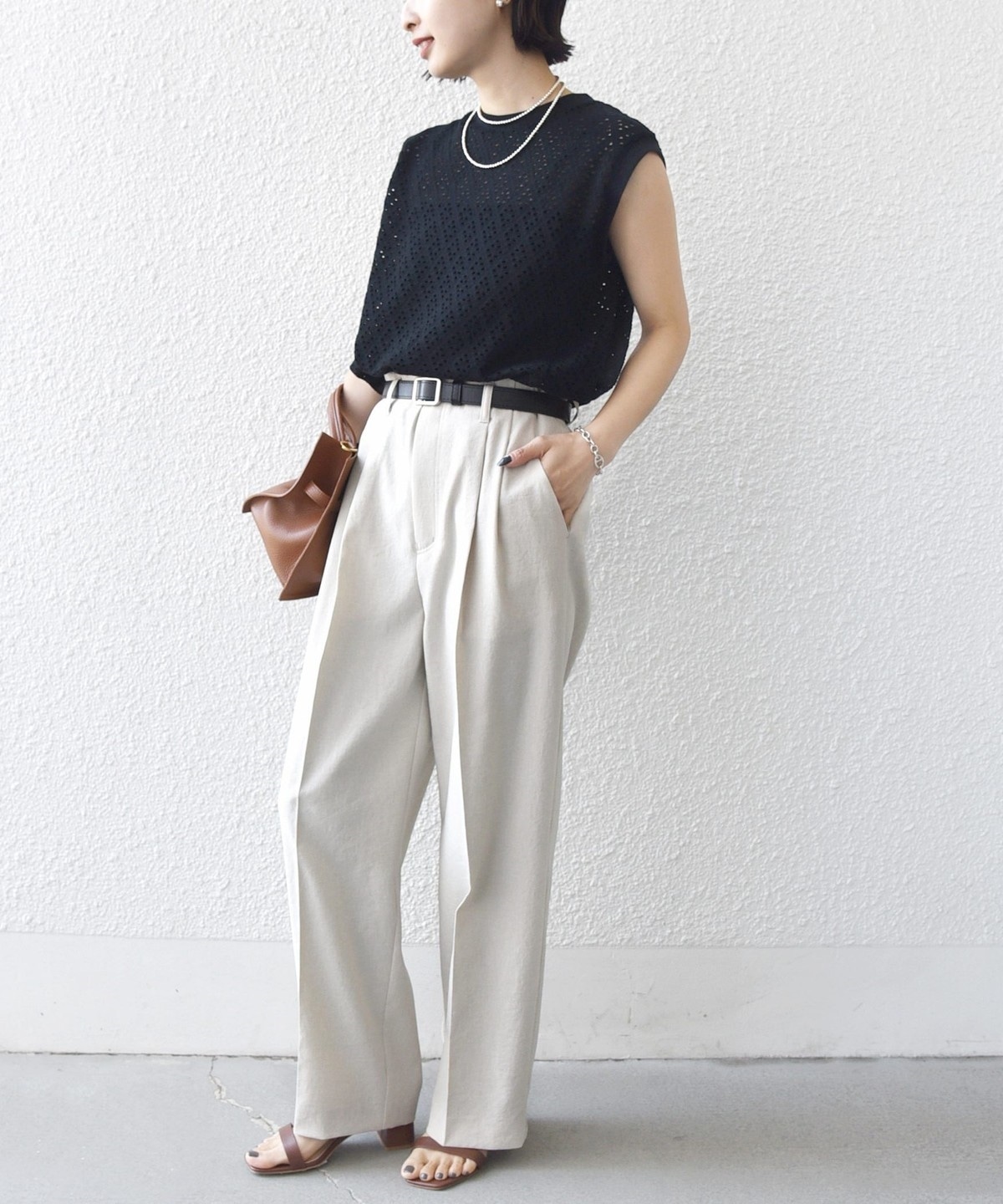腕が見えすぎないノースリーブの裾フレア、後ろのタックが1枚で着映えするアイレットレースのカットソーです。
