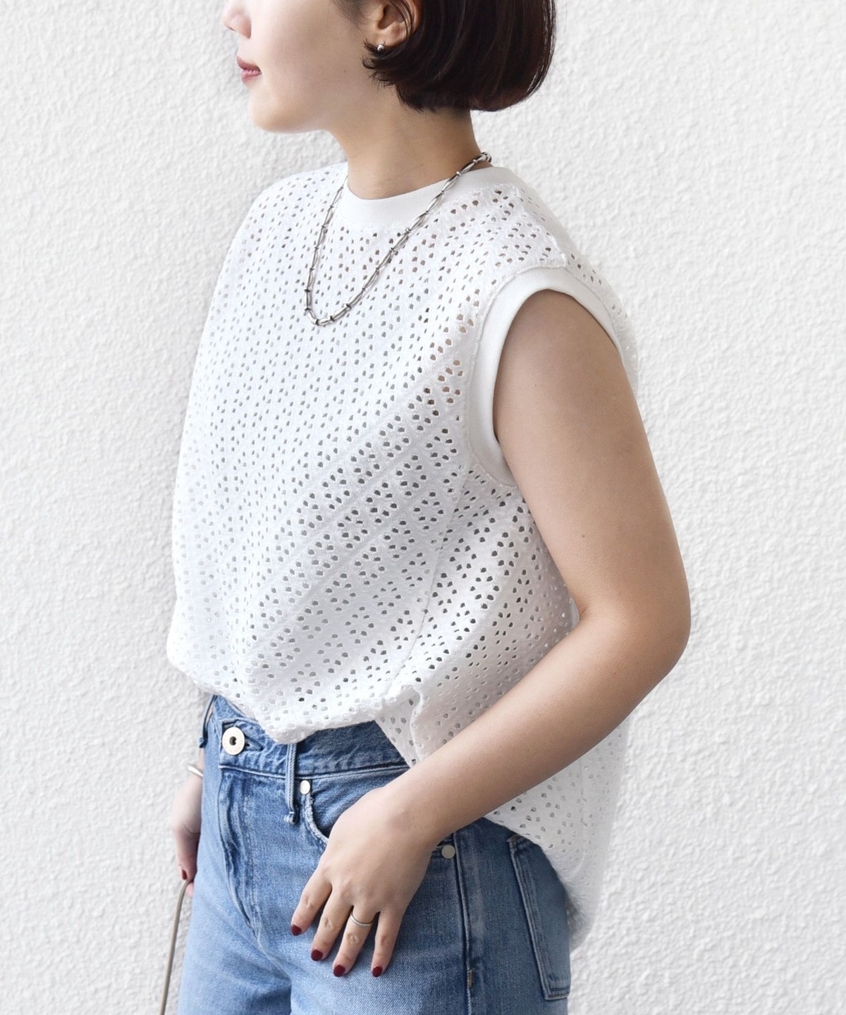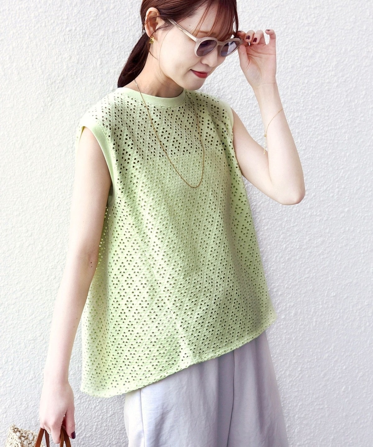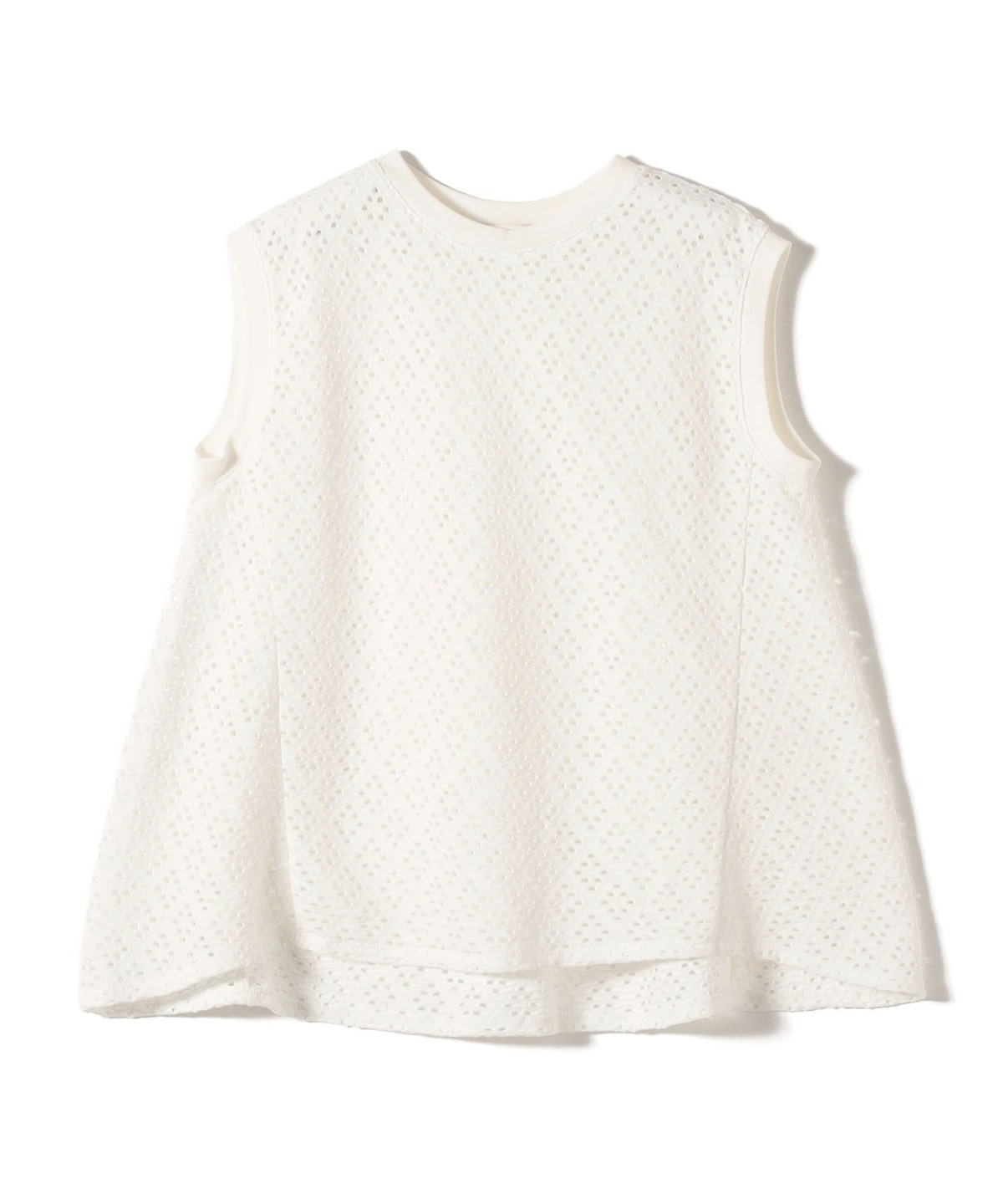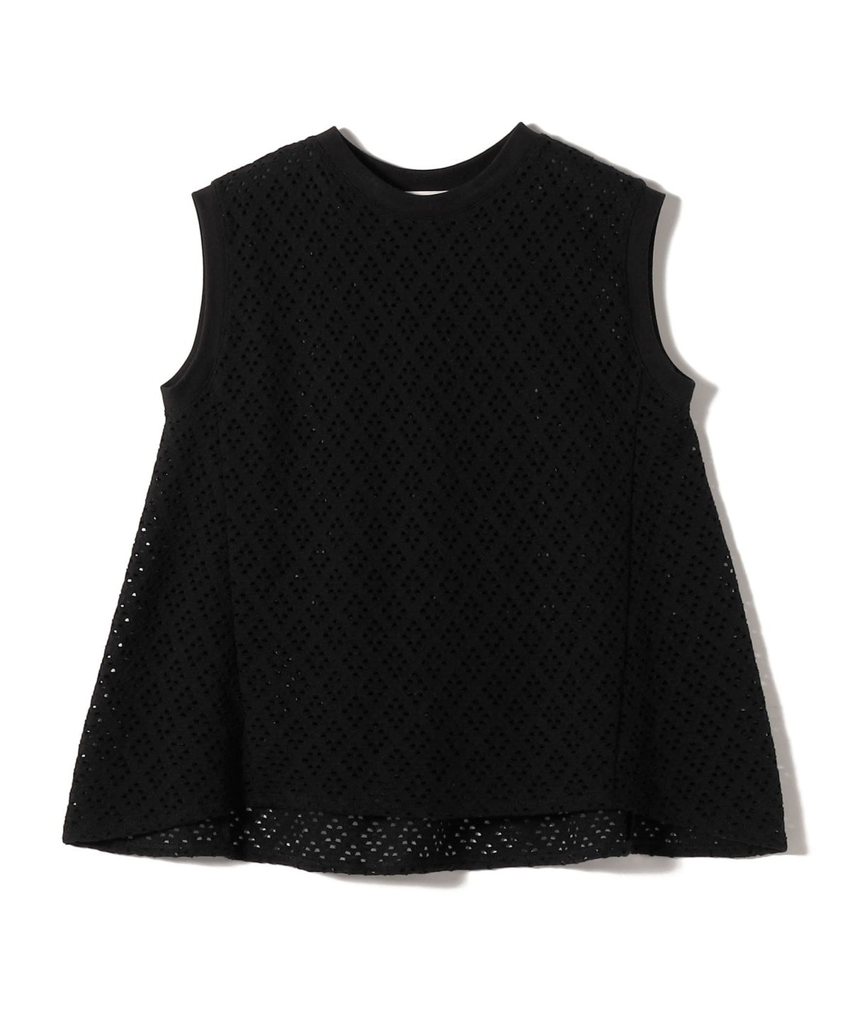 腰回りをカバーする裾フレアとアイレットレースが1枚で着映えするノースリーブカットソー