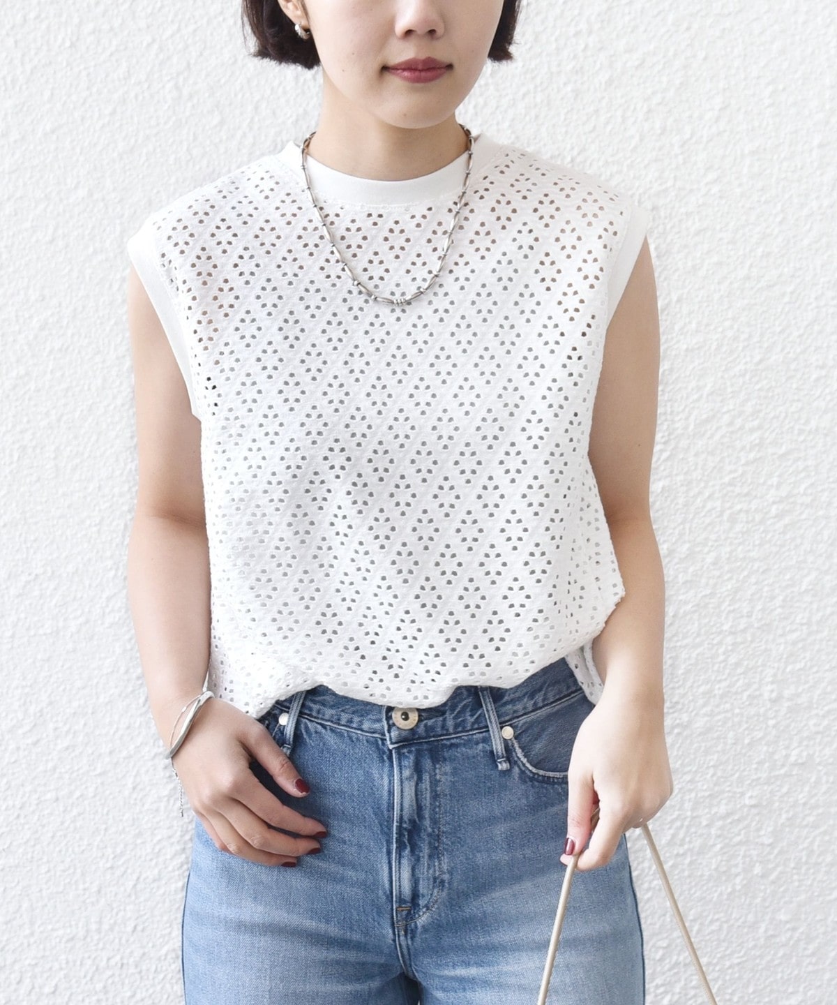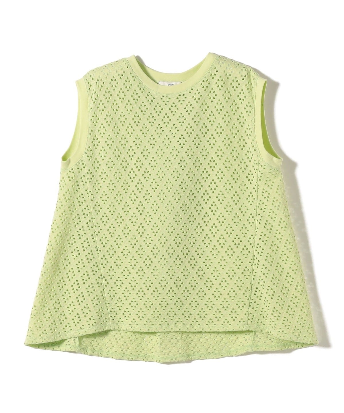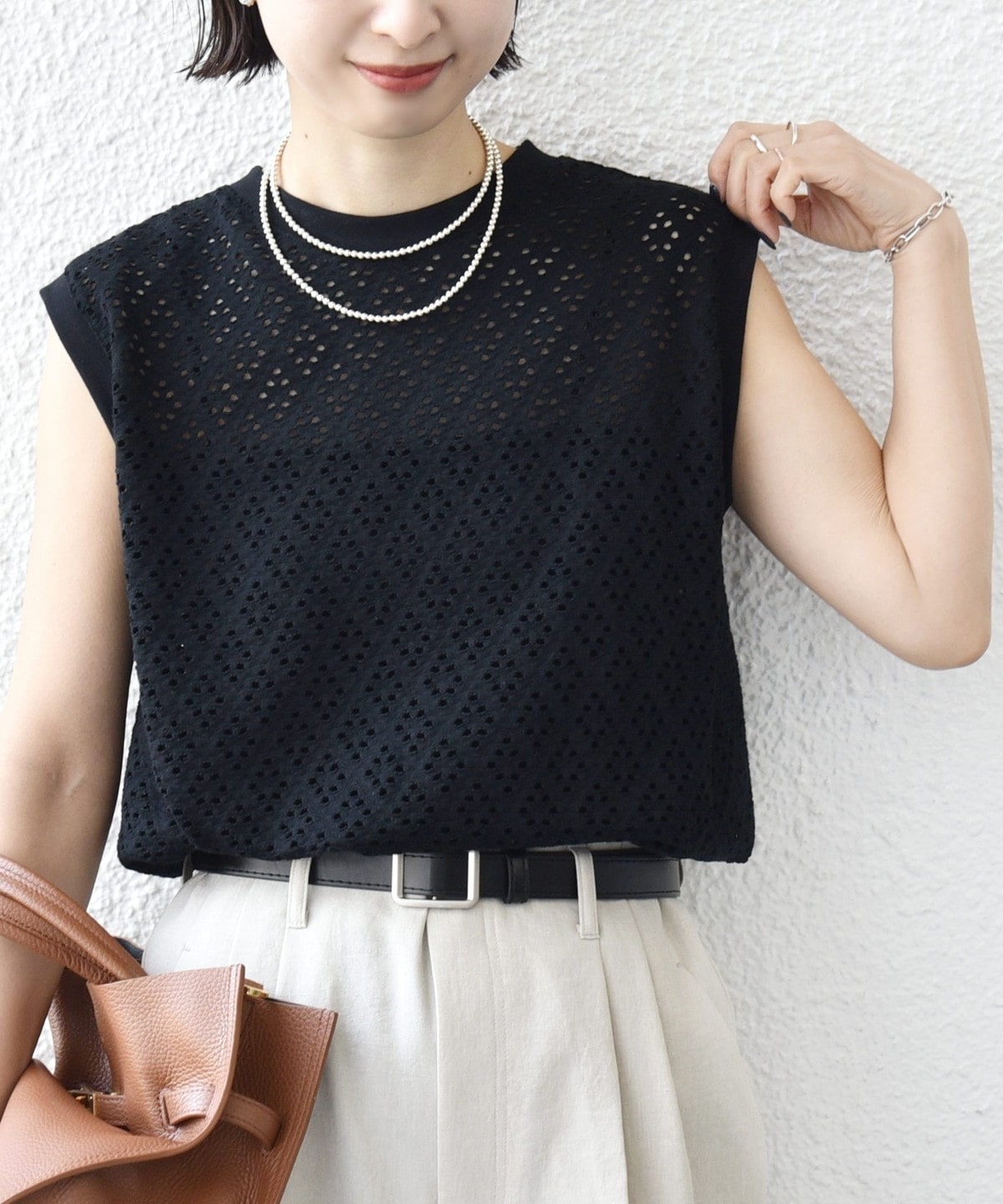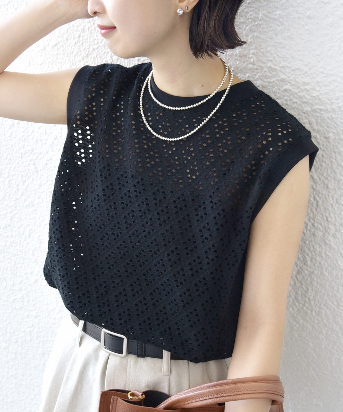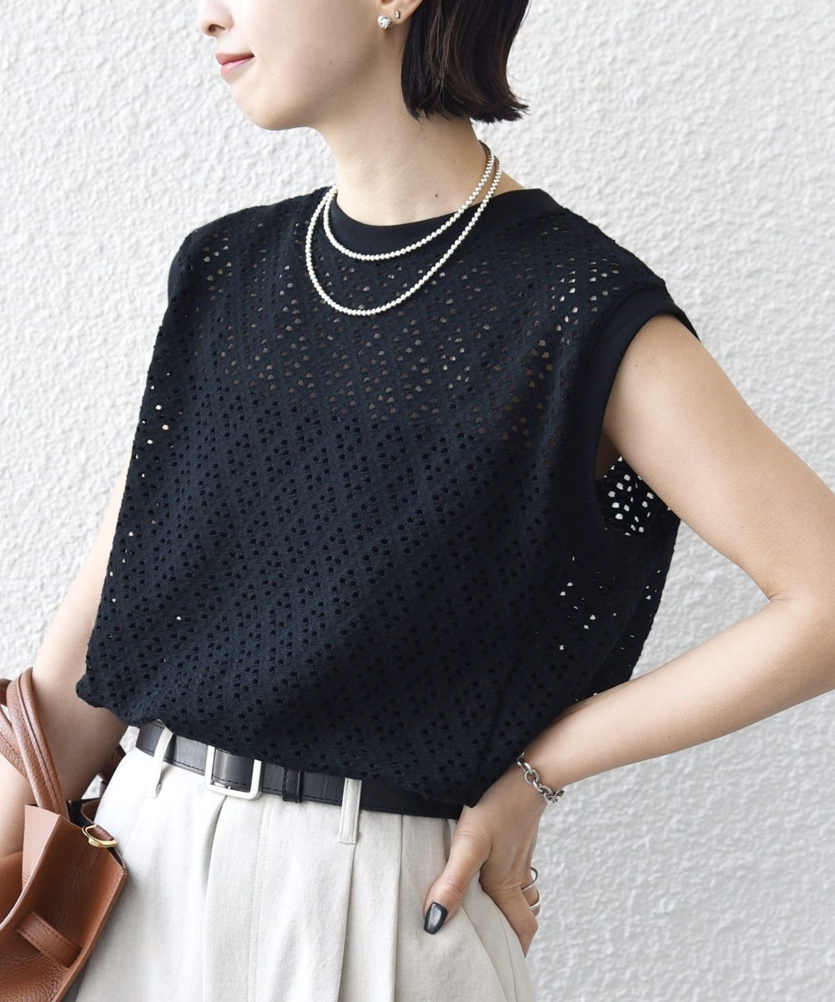 腰回りをカバーする裾フレアとアイレットレースが1枚で着映えするノースリーブカットソー