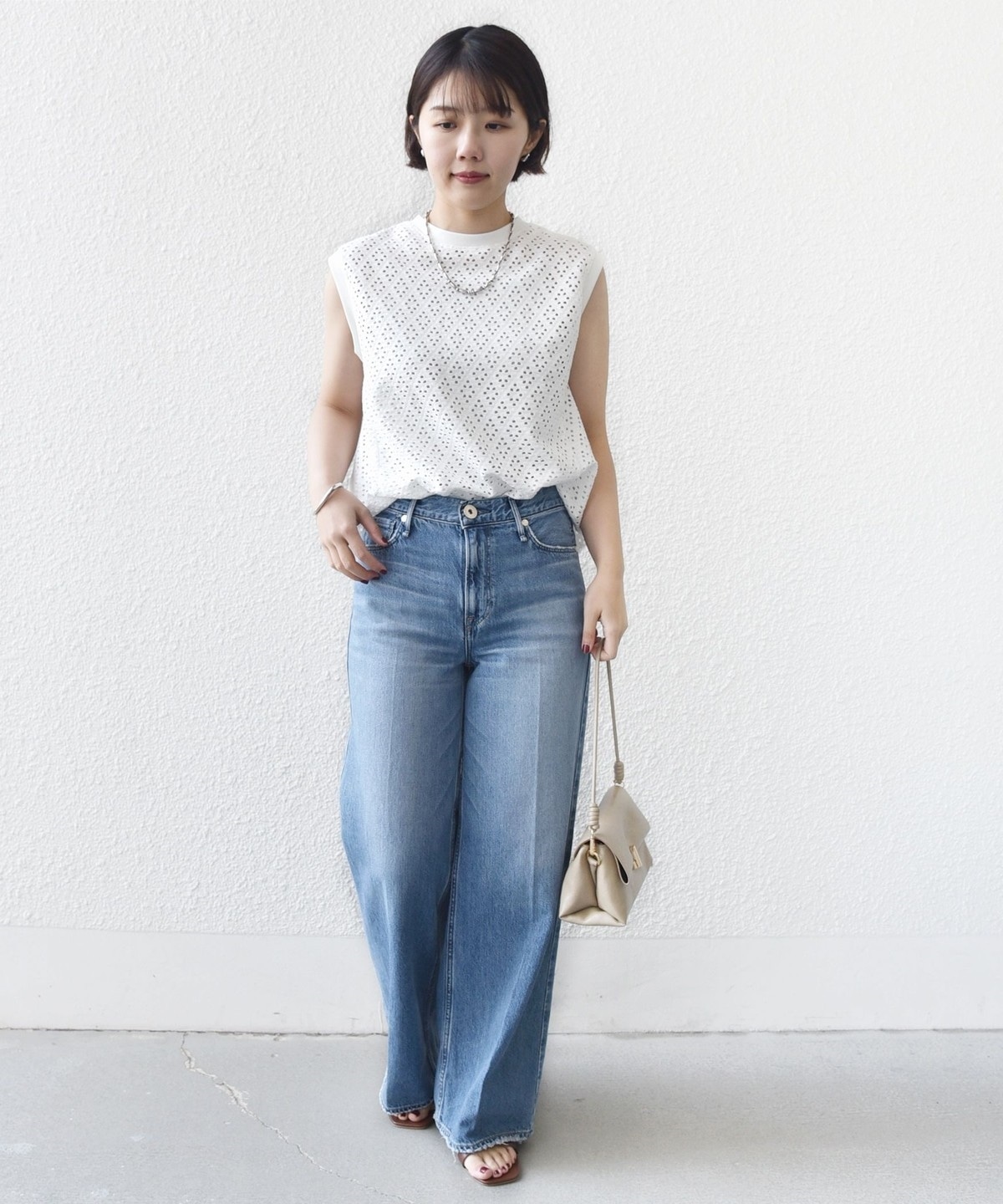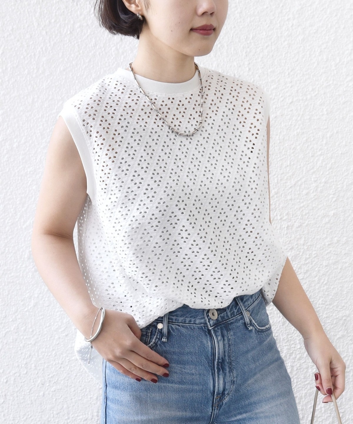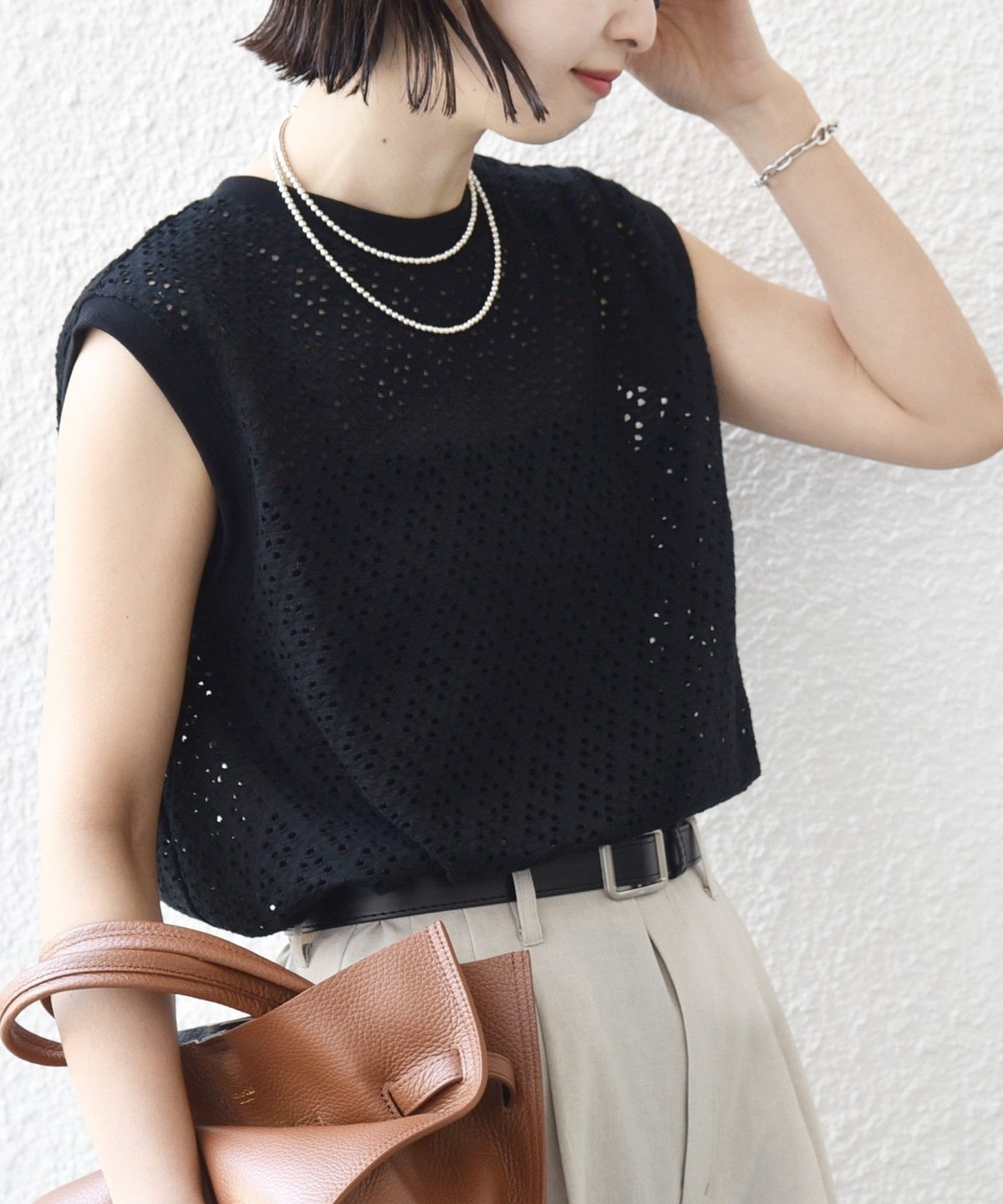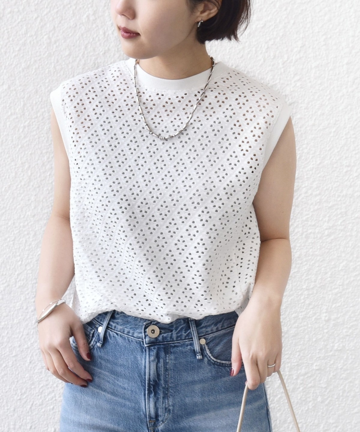 腰回りをカバーする裾フレアとアイレットレースが1枚で着映えするノースリーブカットソー