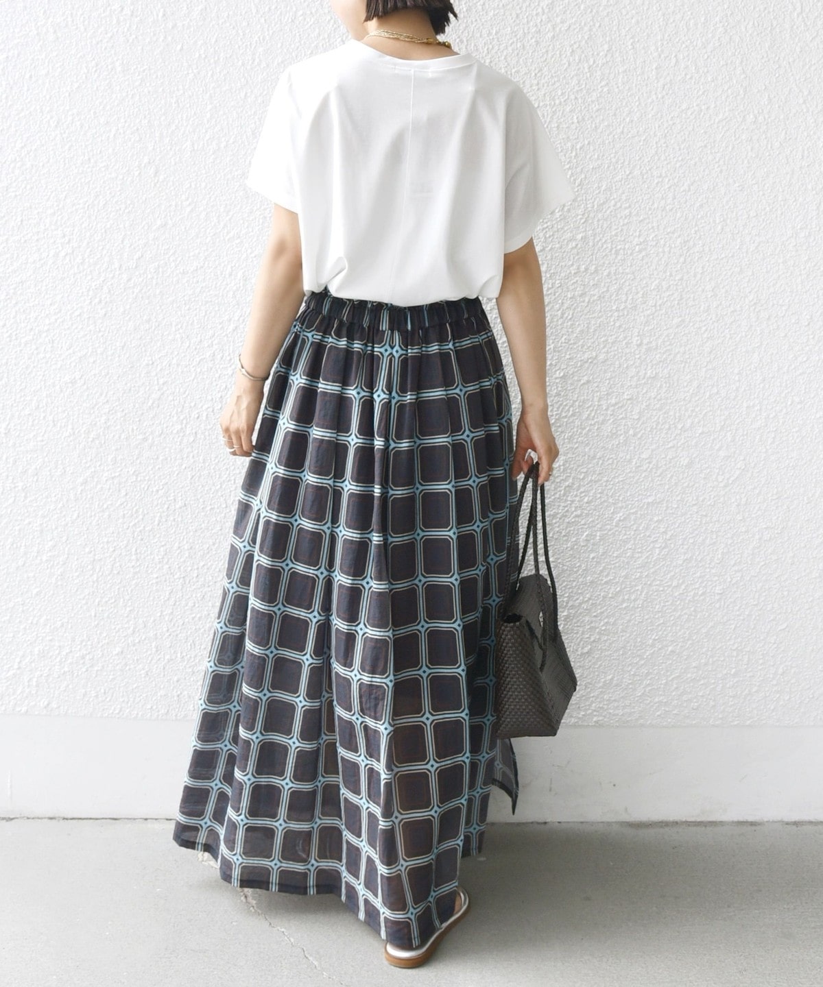 後ろのウエストにダーツを入れ、横から見るとウエストラインがすっきり見えするシルエットです。