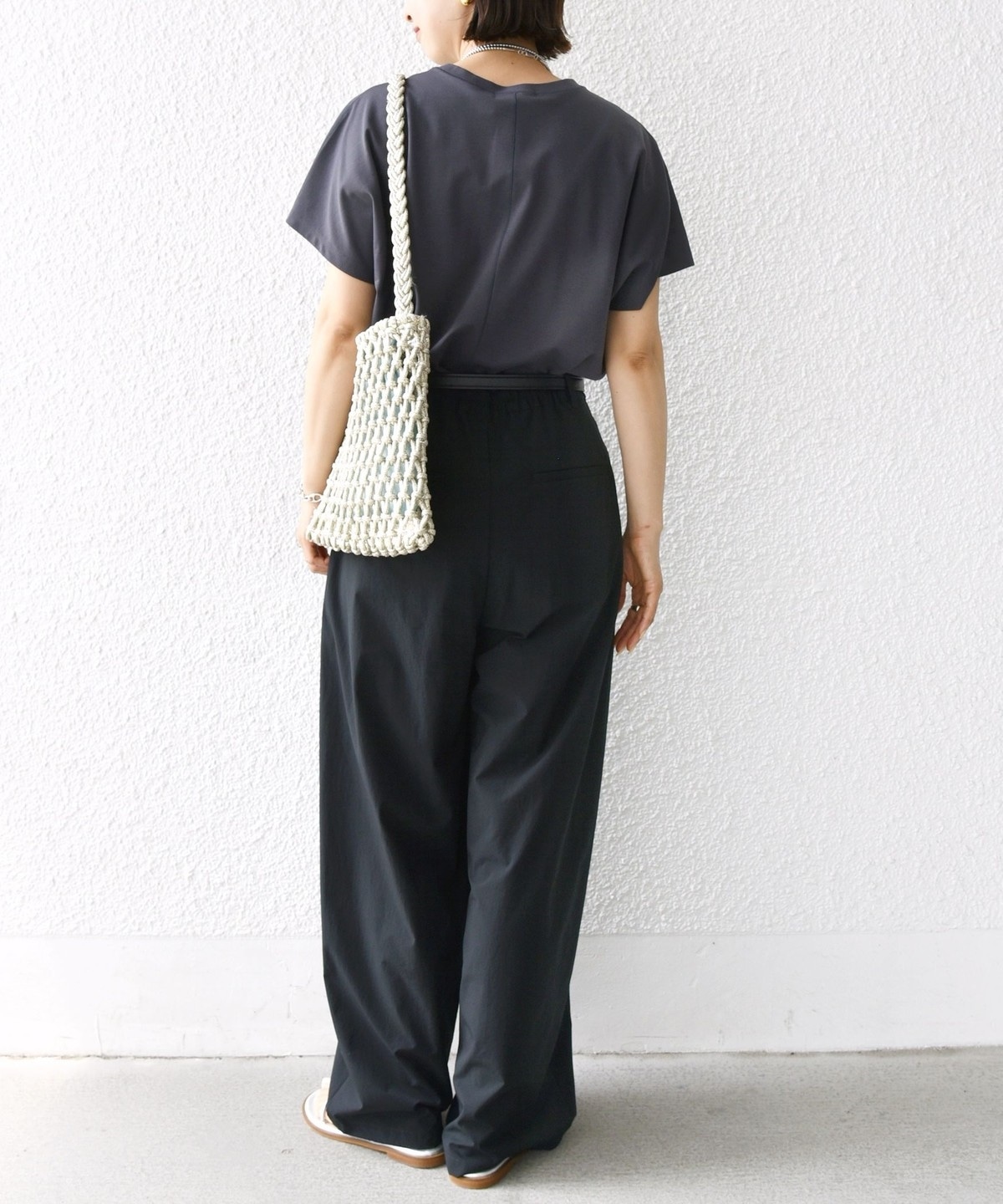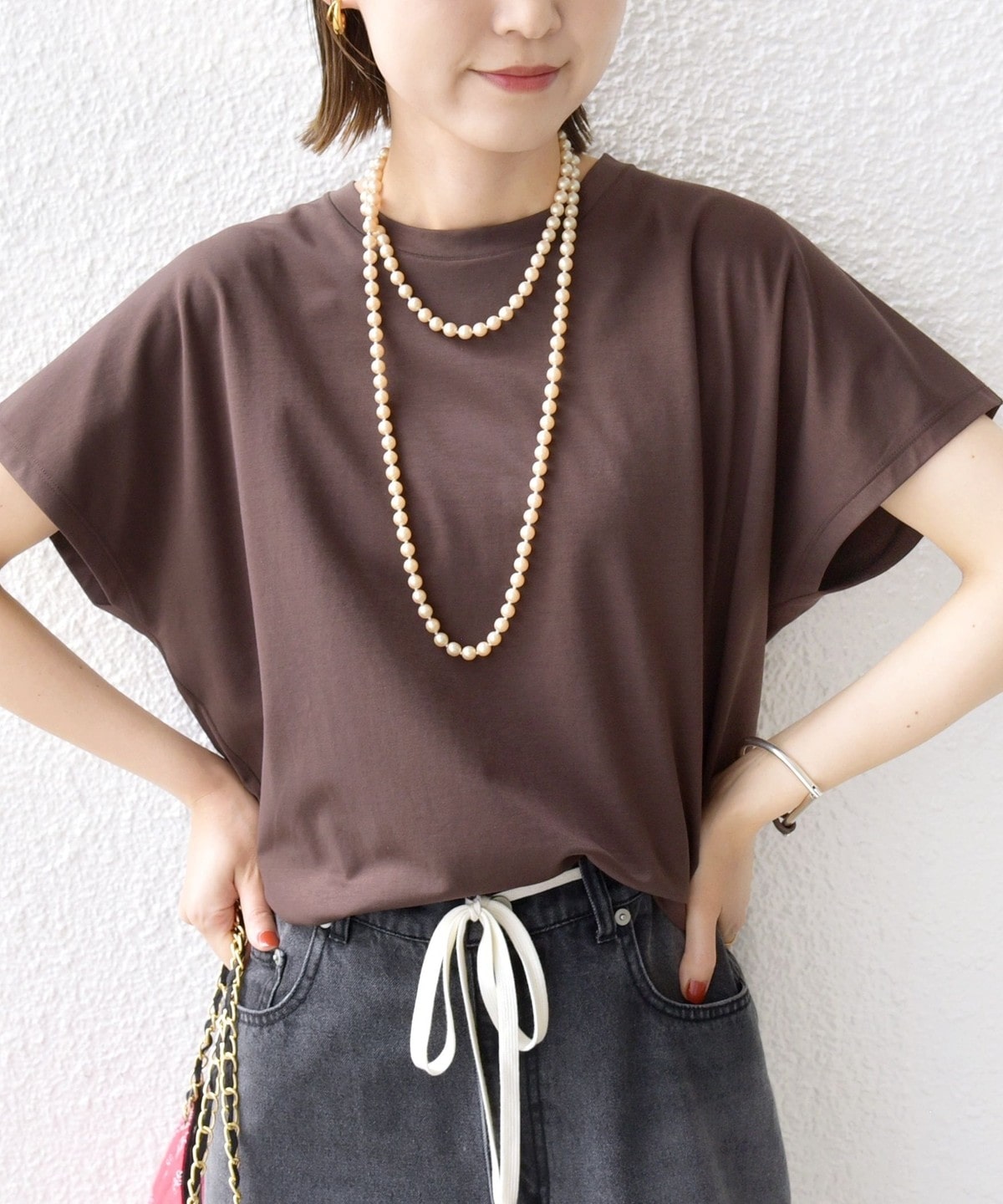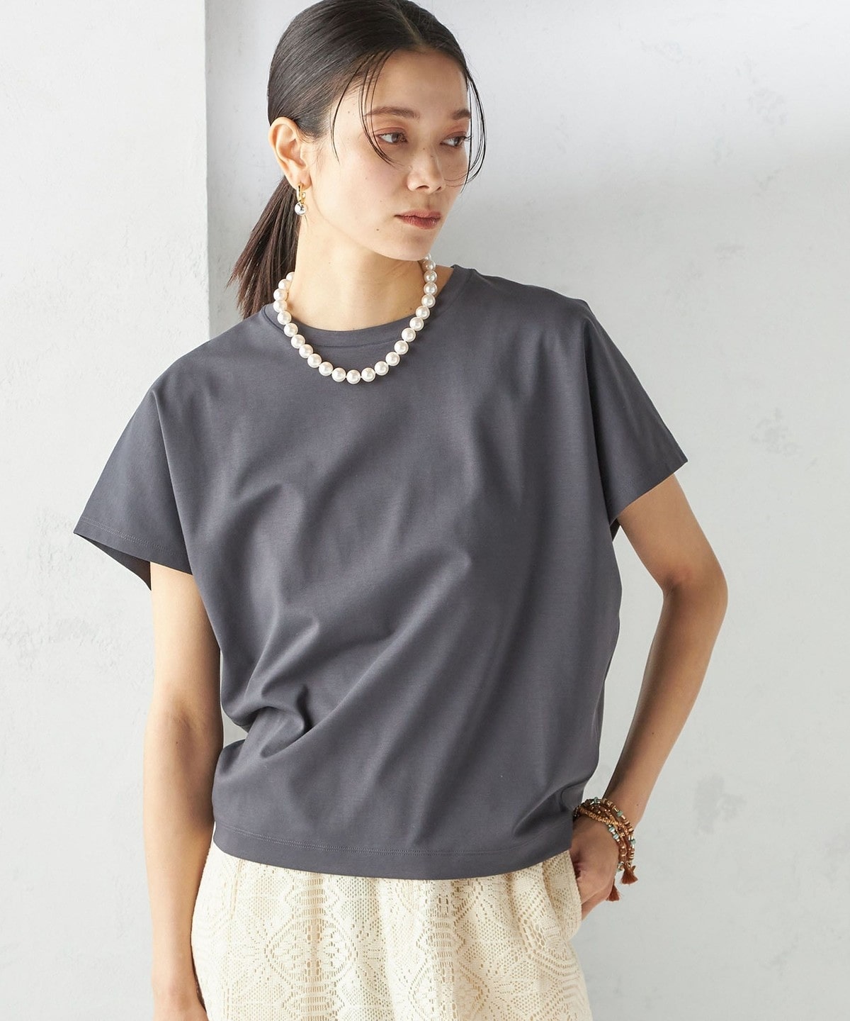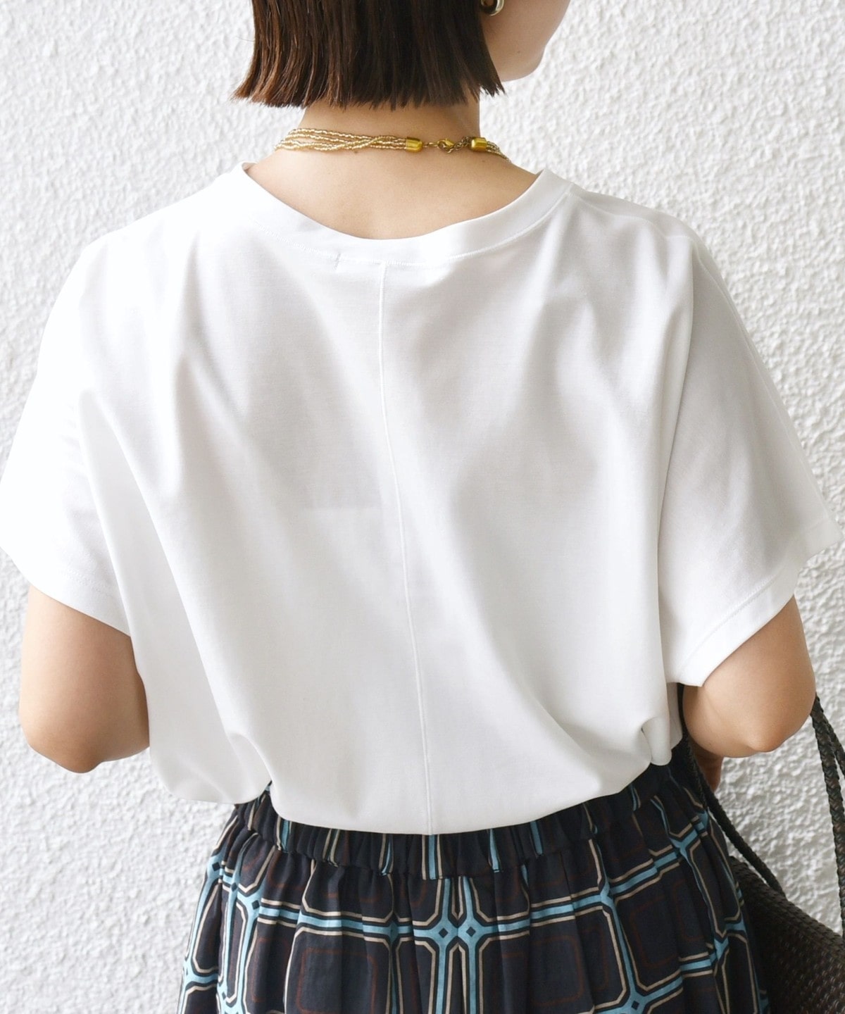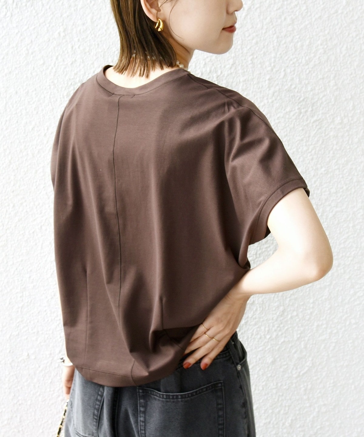 半袖のドルマンスリーブで程よくゆったりとしながらも、様々なボトムに合わせやすいショート丈です。